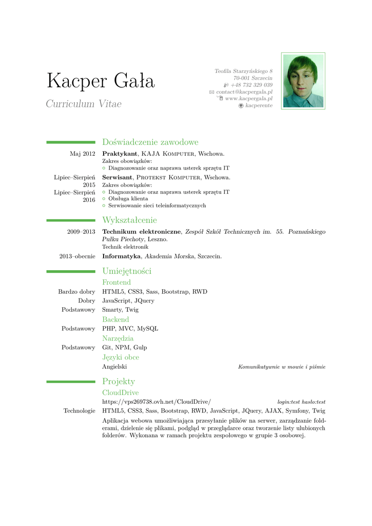 Kacper Gała Curriculum Vitae Teofila Starzyńskiego 8 70-001 Szczecin H +48 732 329 039 B [email protected] Í www.kacpergala.pl kacperente Doświadczenie zawodowe Maj 2012 Praktykant, KAJA Komputer, Wschowa. Zakres obowiązków: { Diagnozowanie oraz naprawa usterek sprzętu IT Lipiec–Sierpień 2015 Lipiec–Sierpień 2016 Serwisant, Protekst Komputer, Wschowa. Zakres obowiązków: { Diagnozowanie oraz naprawa usterek sprzętu IT { Obsługa klienta { Serwisowanie sieci teleinformatycznych Wykształcenie 2009–2013 Technikum elektroniczne, Zespół Szkół Technicznych im. 55. Poznańskiego Pułku Piechoty, Leszno. Technik elektronik 2013–obecnie Informatyka, Akademia Morska, Szczecin. Umiejętności Frontend Bardzo dobry Dobry Podstawowy HTML5, CSS3, Sass, Bootstrap, RWD JavaScript, JQuery Smarty, Twig Backend Podstawowy PHP, MVC, MySQL Narzędzia Podstawowy Git, NPM, Gulp Języki obce Angielski Komunikatywnie w mowie i piśmie Projekty CloudDrive Technologie https://vps269738.ovh.net/CloudDrive/ login:test hasło:test HTML5, CSS3, Sass, Bootstrap, RWD, JavaScript, JQuery, AJAX, Symfony, Twig Aplikacja webowa umożliwiająca przesyłanie plików na serwer, zarządzanie folderami, dzielenie się plikami, podgląd w przeglądarce oraz tworzenie listy ulubionych folderów. Wykonana w ramach projektu zespołowego w grupie 3 osobowej. CircleMenu Technologie www.kacpergala.pl/circlemenu HTML5, CSS3, Sass, RWD, JavaScript, JQuery Freamwork CSS umożliwiający tworzenie animowanego menu złożonego z okręgów. Projekt wciąż rozwijany o dodatkowe pozycje menu na stronie, różne wersje animacji i ilość elementów w menu. Wyrażam zgodę na przetwarzanie moich danych osobowych dla potrzeb niezbędnych do realizacji procesu rekrutacji (zgodnie z Ustawą z dnia 29.08.1997 roku o Ochronie Danych Osobowych; (tekst jednolity: Dz. U. 2016 r. poz. 922).