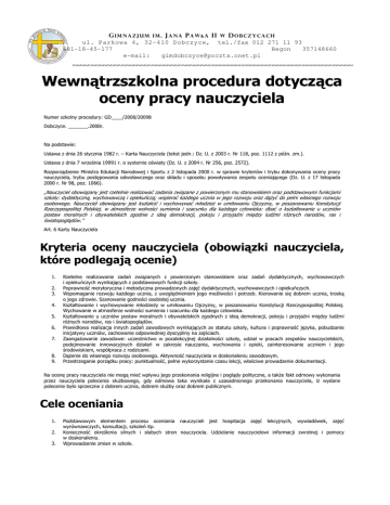 JE “WY CI EŚ E MO JĄ NA ZY U M IM BC ZJ NA CA CH GIM GIMNAZJUM IM. JANA PAWŁA II W DOBCZYCACH ul. Parkowa 4, 32-410 Dobczyce, tel./fax 012 271 11 93 NIP 681-18-45-177 Regon 357148660 e-mail: [email protected] Ą” IEJ DZ ST DO . JA NA PAW ŁA II W Wewnątrzszkolna procedura dotycząca oceny pracy nauczyciela Numer szkolny procedury: GD____/2008/20098 Dobczyce. _______.2008r. Na podstawie: Ustawa z dnia 26 stycznia 1982 r. – Karta Nauczyciela (tekst jedn.: Dz. U. z 2003 r. Nr 118, poz. 1112 z późn. zm.). Ustawa z dnia 7 września 19991 r. o systemie oświaty (Dz. U. z 2004 r. Nr 256, poz. 2572). Rozporządzenie Ministra Edukacji Narodowej i Sportu z 2 listopada 2000 r. w sprawie kryteriów i trybu dokonywania oceny pracy nauczyciela, trybu postępowania odwoławczego oraz składu i sposobu powoływania zespołu oceniającego (Dz. U. z 17 listopada 2000 r. Nr 98, poz. 1066). „Nauczyciel obowiązany jest rzetelnie realizować zadania związane z powierzonym mu stanowiskiem oraz podstawowymi funkcjami szkoły: dydaktyczną, wychowawczą i opiekuńczą; wspierać każdego ucznia w jego rozwoju oraz dążyć do pełni własnego rozwoju osobowego. Nauczyciel obowiązany jest kształcić i wychowywać młodzież w umiłowaniu Ojczyzny, w poszanowaniu Konstytucji Rzeczypospolitej Polskiej, w atmosferze wolności sumienia i szacunku dla każdego człowieka: dbać o kształtowanie u uczniów postaw moralnych i obywatelskich zgodnie z ideą demokracji, pokoju i przyjaźni między ludźmi różnych narodów, ras i światopoglądów.” Art. 6 Karty Nauczyciela Kryteria oceny nauczyciela (obowiązki nauczyciela, które podlegają ocenie) 1. 2. 3. 4. 5. 6. 7. 8. 9. Rzetelne realizowanie zadań związanych z powierzonym stanowiskiem oraz zadań dydaktycznych, wychowawczych i opiekuńczych wynikających z podstawowych funkcji szkoły. Poprawność merytoryczna i metodyczna prowadzonych zajęć dydaktycznych, wychowawczych i opiekuńczych. Wspomaganie rozwoju każdego ucznia, z uwzględnieniem jego możliwości i potrzeb. Kierowanie się dobrem ucznia, troską o jego zdrowie. Szanowanie godności osobistej ucznia. Kształtowanie i wychowywanie młodzieży w umiłowaniu Ojczyzny, w poszanowaniu Konstytucji Rzeczypospolitej Polskiej. Wychowanie w atmosferze wolności sumienia i szacunku dla każdego człowieka. Kształtowanie u uczniów postaw moralnych i obywatelskich zgodnych z ideą demokracji, pokoju i przyjaźni między ludźmi różnych narodów, ras i światopoglądów. Prawidłowa realizacja innych zadań zawodowych wynikających ze statutu szkoły, kultura i poprawność języka, pobudzanie inicjatywy uczniów, zachowanie odpowiedniej dyscypliny na zajściach. Zaangażowanie zawodowe: uczestnictwo w pozalekcyjnej działalności szkoły, udział w pracach zespołów nauczycielskich, podejmowanie innowacyjnych działań w zakresie nauczania, wychowania i opieki, zainteresowanie uczniem i jego środowiskiem, współpraca z rodzicami. Dążenie do własnego rozwoju osobowego. Aktywność nauczyciela w doskonaleniu zawodowym. Przestrzeganie porządku pracy: punktualność, pełne wykorzystanie czasu lekcji, właściwe prowadzenie dokumentacji. Na ocenę pracy nauczyciela nie mogą mieć wpływu jego przekonania religijne i poglądy polityczne, a także fakt odmowy wykonania przez nauczyciela polecenia służbowego, gdy odmowa taka wynikała z uzasadnionego przekonania nauczyciela, iż wydane polecenie było sprzeczne z dobrem ucznia, dobrem służby oraz dobrem publicznym. Cele oceniania 1. 2. 3. Podstawowym elementem procesu oceniania nauczycieli jest hospitacja zajęć lekcyjnych, wywiadówek, zajęć wyrównawczych, konsultacji, szkoleń itp. Konieczność określenia silnych i słabych stron nauczyciela. Udzielanie nauczycielowi informacji zwrotnej i pomocy w doskonaleniu. Wprowadzenie zmian w szkole. 4. Sprawiedliwe przydzielanie dodatków i nagród. Kto podlega ocenie? 1. Ocenie podlega praca nauczyciela, z wyjątkiem pracy nauczyciela stażysty. Kto wystawia ocenę? Oceny pracy nauczyciela dokonuje dyrektor szkoły. 2. 3. 4. 5. W przypadku, gdy dyrektorem szkoły jest osoba nieposiadająca kwalifikacji pedagogicznych, oceny pracy nauczyciela dokonuje dyrektor szkoły w porozumieniu z nauczycielem zajmujących inne stanowisko kierownicze i sprawujących w tej szkole nadzór pedagogiczny, W przypadku, gdy dyrektorem szkoły jest osoba nieposiadająca kwalifikacji pedagogicznych, oceny pracy nauczyciela zajmującego inne stanowisko kierownicze i sprawującego w tej szkole nadzór pedagogiczny dokonuje dyrektor szkoły w porozumieniu z organem sprawującym nadzór pedagogiczny. W przypadku uzupełniania przez nauczyciela tygodniowego obowiązkowego wymiaru zajęć oceny pracy nauczyciela dokonuje dyrektor szkoły, w której zatrudniony jest nauczyciel, w porozumieniu z dyrektorem szkoły, w której nauczyciel uzupełnia obowiązkowy wymiar zajęć. Oceny pracy nauczyciela doradcy metodycznego dokonuje dyrektor szkoły, w której nauczyciel jest zatrudniony, po uzyskaniu oceny pracy dokonanej przez dyrektora właściwej placówki doskonalenia nauczycieli, w zakresie dotyczącym wykonywania funkcji doradcy metodycznego. Wniosek o ocenę 1. 2. Dyrektor szkoły występuje z inicjatywą oceny pracy nauczyciela Z wnioskiem o dokonanie oceny może również wystąpić: • nauczyciel • organ sprawujący nadzór pedagogiczny • organ prowadzący szkoły • rada rodziców Termin dokonania oceny 1. 2. 3. Oceny pracy nauczyciela dokonuje się w okresie nie dłuższym niż 3 miesiące od dnia złożenia wniosku, z tym, że ocena może być dokonana nie wcześniej niż po upływie roku od oceny poprzedniej lub oceny dorobku zawodowego nauczyciela za okres stażu. Do okresu, o którym mowa w pkt 1, nie wlicza się okresów usprawiedliwionej nieobecności w pracy nauczyciela trwającej dłużej niż miesiąc i okresów ferii wynikających z przepisów w sprawie organizacji roku szkolnego. W przypadk