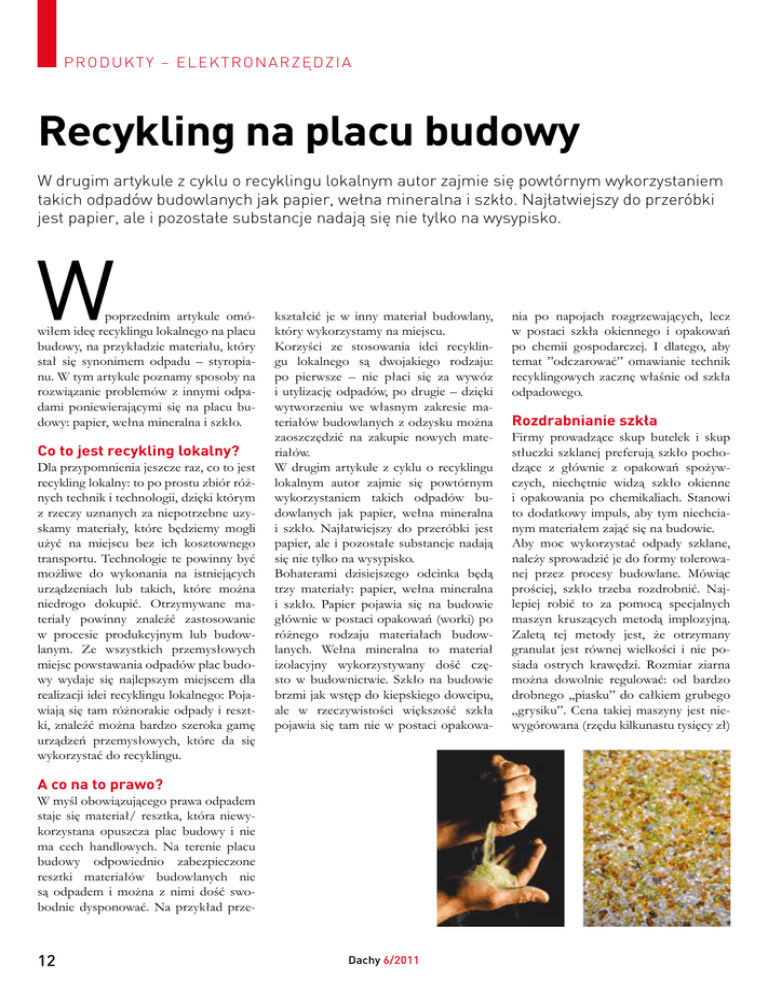 PR O D U K T Y – E LE KT R ON A R ZĘ D ZIA Recykling na placu budowy W drugim artykule z cyklu o recyklingu lokalnym autor zajmie się powtórnym wykorzystaniem takich odpadów budowlanych jak papier, wełna mineralna i szkło. Najłatwiejszy do przeróbki jest papier, ale i pozostałe substancje nadają się nie tylko na wysypisko. poprzednim artykule omówiłem ideę recyklingu lokalnego na placu budowy, na przykładzie materiału, który stał się synonimem odpadu – styropianu. W tym artykule poznamy sposoby na rozwiązanie problemów z innymi odpadami poniewierającymi się na placu budowy: papier, wełna mineralna i szkło. Co to jest recykling lokalny? Dla przypomnienia jeszcze raz, co to jest recykling lokalny: to po prostu zbiór różnych technik i technologii, dzięki którym z rzeczy uznanych za niepotrzebne uzyskamy materiały, które będziemy mogli użyć na miejscu bez ich kosztownego transportu. Technologie te powinny być możliwe do wykonania na istniejących urządzeniach lub takich, które można niedrogo dokupić. Otrzymywane materiały powinny znaleźć zastosowanie w procesie produkcyjnym lub budowlanym. Ze wszystkich przemysłowych miejsc powstawania odpadów plac budowy wydaje się najlepszym miejscem dla realizacji idei recyklingu lokalnego: Pojawiają się tam różnorakie odpady i resztki, znaleźć można bardzo szeroka gamę urządzeń przemysłowych, które da się wykorzystać do recyklingu. kształcić je w inny materiał budowlany, który wykorzystamy na miejscu. Korzyści ze stosowania idei recyklingu lokalnego są dwojakiego rodzaju: po pierwsze – nie płaci się za wywóz i utylizację odpadów, po drugie – dzięki wytworzeniu we własnym zakresie materiałów budowlanych z odzysku można zaoszczędzić na zakupie nowych materiałów. W drugim artykule z cyklu o recyklingu lokalnym autor zajmie się powtórnym wykorzystaniem takich odpadów budowlanych jak papier, wełna mineralna i szkło. Najłatwiejszy do przeróbki jest papier, ale i pozostałe substancje nadają się nie tylko na wysypisko. Bohaterami dzisiejszego odcinka będą trzy materiały: papier, wełna mineralna i szkło. Papier pojawia się na budowie głównie w postaci opakowań (worki) po różnego rodzaju materiałach budowlanych. Wełna mineralna to materiał izolacyjny wykorzystywany dość często w budownictwie. Szkło na budowie brzmi jak wstęp do kiepskiego dowcipu, ale w rzeczywistości większość szkła pojawia się tam nie w postaci opakowa- A co na to prawo? W myśl obowiązującego prawa odpadem staje się materiał/ resztka, która niewykorzystana opuszcza plac budowy i nie ma cech handlowych. Na terenie placu budowy odpowiednio zabezpieczone resztki materiałów budowlanych nie są odpadem i można z nimi dość swobodnie dysponować. Na przykład prze- 12 Dachy 6/2011 nia po napojach rozgrzewających, lecz w postaci szkła okiennego i opakowań po chemii gospodarczej. I dlatego, aby temat ”odczarować” omawianie technik recyklingowych zacznę właśnie od szkła odpadowego. Rozdrabnianie szkła Firmy prowadzące skup butelek i skup stłuczki szklanej preferują szkło pochodzące z głównie z opakowań spożywczych, niechętnie widzą szkło okienne i opakowania po chemikaliach. Stanowi to dodatkowy impuls, aby tym niechcianym materiałem zająć się na budowie. Aby moc wykorzystać odpady szklane, należy sprowadzić je do formy tolerowanej przez procesy budowlane. Mówiąc prościej, szkło trzeba rozdrobnić. Najlepiej robić to za pomocą specjalnych maszyn kruszących metodą implozyjną. Zaletą tej metody jest, że otrzymany granulat jest równej wielkości i nie posiada ostrych krawędzi. Rozmiar ziarna można dowolnie regulować: od bardzo drobnego „piasku” do całkiem grubego „grysiku”. Cena takiej maszyny jest niewygórowana (rzędu kilkunastu tysięcy zł) PRODUKTY – EL EKTRONARZĘD Z I A Ekofiber – wytwarzanie Zasypka typu Ekofiber jest sypkim materiałem termoizolacyjnym sporządzonym z włókien celulozowych impregnowanych solami boru (boraks). Uodparnia to materiał na działanie ognia oraz pleśni. Tworząc barierę dla przepływu ciepła celuloza jednocześnie doskonale radzi sobie z przekazywaniem wilgoci, nie gromadząc jej w sobie, w związku z czym nie wymaga stosowania folii paroizolacyjnej. Nadaje się do zastosowania w całej przestrzeni konstrukcji budynku oprócz miejsc narażonych na temperatury powyżej 80oC i bezpośrednio pod wylewki. Doskonale chroni tę konstrukcje przed zagrzybieniem, nie sprzyjając ich korozji. Nie sprzyja również osiedlaniu się gryzoni i insektów. Stosuje się głównie jako materiał wdmuchiwany w pustki powietrzne istniejące w budynku. Impregnacja celulozy solami boru może być przeprowadzona na dwa sposoby: – odpadowe worki spryskuje się roztworem wodnym boraksu, a następnie po wysuszeniu worki się mieli, – worki najpierw mieli się, gotowy przemiał spryskuje wodnym roztworem boraksu z jednoczesnym mieszaniem, a następnie suszy. i wiele firm może sobie pozwolić na taki wydatek. Dla pozostałych istnieją metody polowe. Metoda nr 1, znana w Polsce i wykorzystywana jeszcze w latach 50. i 60. ubiegłego wieku. Polega ona na ręcznym tłuczeniu szkła za pomocą młotka na odpowiednio sztywnym sicie. Oczka sita należy dobrać w zależności od żądanego rozmiaru ziarna chcemy uzyskać. Dodatkowo pracownika należy wyposażyć w sprzęt ochronny: rękawice i okulary. Metoda nr 2 polega na wykorzystaniu do rozdrabniania szkła zwykłej betoniarki. Betoniarkę wyposaża się w szczelną pokrywę na gardzieli gruszki oraz o zestaw kul wielkości pięści – najlepsze są kule ze starych łożysk (duże), chociaż mogą to być również okrągłe kamienie. Cały zestaw działa jak młyn kulowy. Metodą doświadczalną ustala się czas mielenia i kąt nachylenia gruszki. Jeżeli betoniarkę chce się przerobić na młyn kulowy w sposób nieodwracalny, to w ściankach grusz