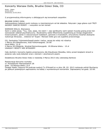 radio Toksyna FM - radio internetowe Koncerty Warsaw Dolls, Brudne Dzieci Sida, CO Autor: Adam 22.02.2013. Zmieniony 22.02.2013. Z przyjemnością informujemy o zbliżających się koncertach zespołów: BRUDNE DZIECI SIDA Jednoosobowy kabaret punk rockowy w niezmienionym od lat składzie. Patyczak i jego gitara czyli TRZY AKORDY DARCIE MORDY - i wszystko na ten temat! WARSAW DOLLS, Warszawa Sami o sobie piszą: "Yyy, niee, aaaa, nie wiem.", węc spróbujmy sami opisać muzykę graną przez ten warszawski oddział psychiatryczny. Wyobraźmy sobie filharmonię wypełnioną po brzegi eleganckim towarzystwem, panie w wieczorowych toaletach, panowie w krawatach, smyczkowy kwartet dostojnie wykonuje Straussa... widzicie to? Super: Warsaw Dolls gra coś zupełnie przeciwnego. CO, Zachodnie TrójmiastoZespół pieśni i tańca, raczej do wódy niż różańca 1 Marca 2013Wejherowo, klub Fantomasgodz. 20:00 cena biletu: 12 zł 2 Marca 2013Gdańsk, Wydział Remontowygodz. 19:00cena biletu: 15 zł UWAGA!!! RESZTY NIE WYDAJEMY Cały dochód z koncertu będzie przeznaczony dla Klaudiusza Wesołka, który przed świętami stracił w pożarze cały swój dobytek wraz z domem i ukochanymi psami. Dodatkowo Brudne Dzieci Sida w niedzielę 3 Marca 2013 roku odwiedzą Darłowo Restauracja Karczma rzymska ul. Powstańców Warszawskich 26 godz. 19:00cena biletu: 8 zł Uwaga! Radio Toksyna FM podczas audycji Tu S'thrash'yn w dniu 28. 02. 2013 rozlosuje wśród Słuchaczy po jednym podwójnym zaproszeniu na każdy z wymienionych koncertów. Zapraszamy od godz. 22:00. http://www.toksyna.fm Kreator PDF Utworzono 4 March, 2017, 12:25