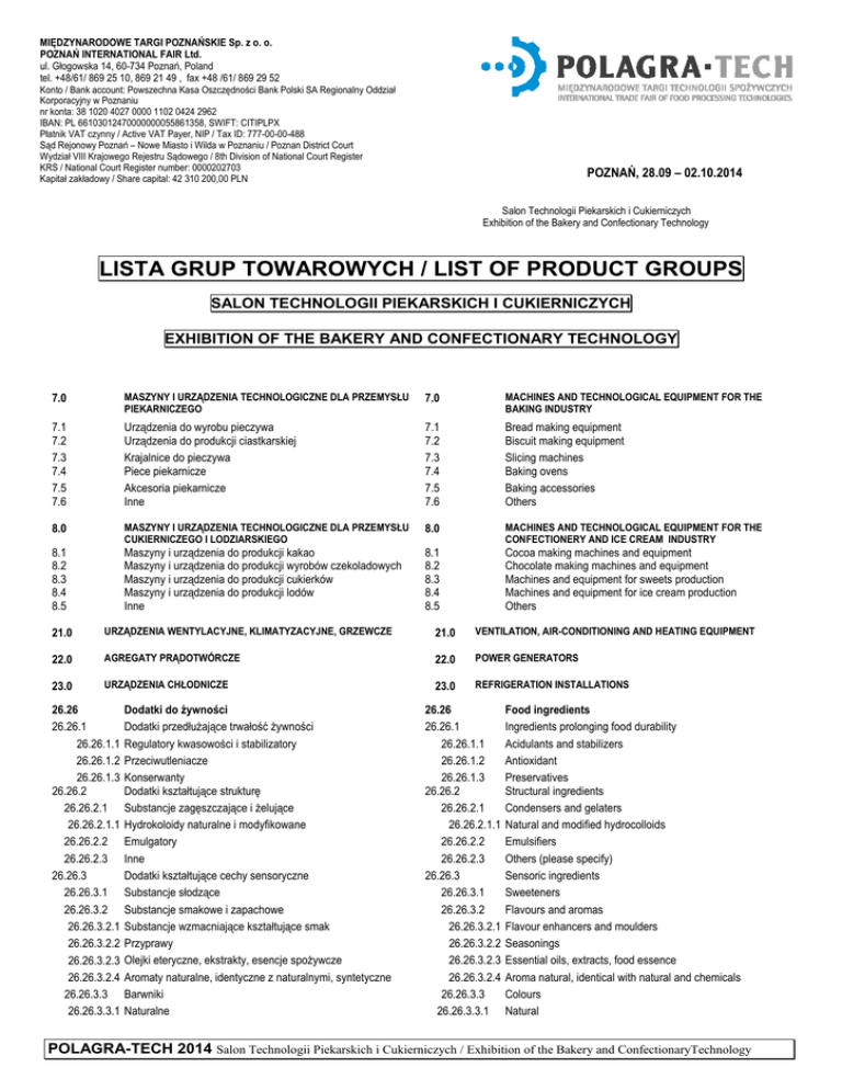 MIĘDZYNARODOWE TARGI POZNAŃSKIE Sp. z o. o. POZNAŃ INTERNATIONAL FAIR Ltd. ul. Głogowska 14, 60-734 Poznań, Poland tel. +48/61/ 869 25 10, 869 21 49 , fax +48 /61/ 869 29 52 Konto / Bank account: Powszechna Kasa Oszczędności Bank Polski SA Regionalny Oddział Korporacyjny w Poznaniu nr konta: 38 1020 4027 0000 1102 0424 2962 IBAN: PL 66103012470000000055861358, SWIFT: CITIPLPX Płatnik VAT czynny / Active VAT Payer, NIP / Tax ID: 777-00-00-488 Sąd Rejonowy Poznań – Nowe Miasto i Wilda w Poznaniu / Poznan District Court Wydział VIII Krajowego Rejestru Sądowego / 8th Division of National Court Register KRS / National Court Register number: 0000202703 Kapitał zakładowy / Share capital: 42 310 200,00 PLN POZNAŃ, 28.09 – 02.10.2014 Salon Technologii Piekarskich i Cukierniczych Exhibition of the Bakery and Confectionary Technology LISTA GRUP TOWAROWYCH / LIST OF PRODUCT GROUPS SALON TECHNOLOGII PIEKARSKICH I CUKIERNICZYCH EXHIBITION OF THE BAKERY AND CONFECTIONARY TECHNOLOGY 7.0 MASZYNY I URZĄDZENIA TECHNOLOGICZNE DLA PRZEMYSŁU PIEKARNICZEGO 7.0 MACHINES AND TECHNOLOGICAL EQUIPMENT FOR THE BAKING INDUSTRY 7.1 7.2 7.3 7.4 7.5 7.6 Urządzenia do wyrobu pieczywa Urządzenia do produkcji ciastkarskiej Krajalnice do pieczywa Piece piekarnicze Akcesoria piekarnicze Inne 7.1 7.2 7.3 7.4 7.5 7.6 Bread making equipment Biscuit making equipment Slicing machines Baking ovens Baking accessories Others 8.0 MASZYNY I URZĄDZENIA TECHNOLOGICZNE DLA PRZEMYSŁU CUKIERNICZEGO I LODZIARSKIEGO 8.0 MACHINES AND TECHNOLOGICAL EQUIPMENT FOR THE CONFECTIONERY AND ICE CREAM INDUSTRY 8.1 8.2 8.3 8.4 8.5 Maszyny i urządzenia do produkcji kakao Maszyny i urządzenia do produkcji wyrobów czekoladowych Maszyny i urządzenia do produkcji cukierków Maszyny i urządzenia do produkcji lodów Inne 8.1 8.2 8.3 8.4 8.5 Cocoa making machines and equipment Chocolate making machines and equipment Machines and equipment for sweets production Machines and equipment for ice cream production Others 21.0 URZĄDZENIA WENTYLACYJNE, KLIMATYZACYJNE, GRZEWCZE 21.0 VENTILATION, AIR-CONDITIONING AND HEATING EQUIPMENT 22.0 AGREGATY PRĄDOTWÓRCZE 22.0 POWER GENERATORS 23.0 URZĄDZENIA CHŁODNICZE 23.0 REFRIGERATION INSTALLATIONS 26.26 26.26.1 26.26.1.1 26.26.1.2 26.26.1.3 26.26.2 26.26.2.1 26.26.2.1.1 26.26.2.2 26.26.2.3 26.26.3 26.26.3.1 26.26.3.2 26.26.3.2.1 26.26.3.2.2 26.26.3.2.3 26.26.3.2.4 26.26.3.3 26.26.3.3.1 Dodatki do Ŝywności Dodatki przedłuŜające trwałość Ŝywności Regulatory kwasowości i stabilizatory Przeciwutleniacze Konserwanty Dodatki kształtujące strukturę Substancje zagęszczające i Ŝelujące Hydrokoloidy naturalne i modyfikowane Emulgatory Inne Dodatki kształtujące cechy sensoryczne Substancje słodzące Substancje smakowe i zapachowe Substancje wzmacniające kształtujące smak Przyprawy Olejki eteryczne, ekstrakty, esencje spoŜywcze Aromaty naturalne, identyczne z naturalnymi, syntetyczne Barwniki Naturalne 26.26 26.26.1 26.26.1.1 26.26.1.2 26.26.1.3 26.26.2 26.26.2.1 26.26.2.1.1 26.26.2.2 26.26.2.3 26.26.3 26.26.3.1 26.26.3.2 26.26.3.2.1 26.26.3.2.2 26.26.3.2.3 26.26.3.2.4 26.26.3.3 26.26.3.3.1 Food ingredients Ingredients prolonging food durability Acidulants and stabilizers Antioxidant Preservatives Structural ingredients Condensers and gelaters Natural and modified hydrocolloids Emulsifiers Others (please specify) Sensoric ingredients Sweeteners Flavours and aromas Flavour enhancers and moulders Seasonings Essential oils, extracts, food essence Aroma natural, identical with natural and chemicals Colours Natural POLAGRA-TECH 2014 Salon Technologii Piekarskich i Cukierniczych / Exhibition of the Bakery and ConfectionaryTechnology 26.26.3.3.2 26.26.4 26.26.4.1 26.26.4.2 26.26.4.2.1 26.26.4.2.2 26.26.5 26.26.5.1 26.26.5.2 26.26.5.3 26.26.5.4 26.26.6 26.26.7 Sztuczne Dodatki uzupełniające Preparaty białkowe Dodatki wzbogacające Witaminy Substancje mineralne Dodatki pomocnicze Enzymy Nośniki Rozpuszczalniki Inne (proszę podać jakie) Dodatki i komponenty mięsne Dodatki i komponenty piekarnicze, cukiernicze i lodziarskie 26.26.3.3.2 26.26.4 26.26.4.1 26.26.4.2 26.26.4.2.1 26.26.4.2.2 26.26.5 26.26.5.1 26.26.5.2 26.26.5.3 26.26.5.4 26.26.6 26.26.7 26.26.8 Inne dodatki do Ŝywności 26.26.8 Synthetic Suplements Protein preparations Enriching additives Vitamins Minerals Auxilliary ingredients Enzymes Carriers Solvents Others (please specify) Meat ingredients and components Baking, confectionery and ice cream ingredients and components Other ingredients 30.0 30.1 30.2 30.3 30.4 30.0 30.1 30.2 30.3 30.4 MEANS OF TRANSPORT Isothermal means of transport Refrigerating unit equipped means of transport Means of transport for liquids (cisterns) Means of transport for bulk solid goods 30.5 ŚRODKI TRANSPORTU Środki transportu izotermiczne Środki transportu z agregatem chłodniczym Środki transportu ze zbiornikami do przewozu cieczy (cysterny) Środki transportu ze zbiornikami do przewozu materiałów stałych Środki transportu do przewozu artykułów sypkich luzem 30.5 30.6 Inne (proszę podać jakie) 30.6 Means of transport for loose materials in bulk (eg. grain, fodder) Others (please specify) 32. 32.1 32.2 32.3 HIGIENA I OCHRONA PRZED SZKODNIKAMI Urządzenia do mycia i dezynfekcji maszyn Urządzenia do mycia i dezynfekcji pomieszczeń Środki czyszcząco-konserwujące elewacje budynków 32. 32.1 32.2 32.3 WORK SAFETY AND HYGIENE Machine washing and disinfecting equipment Room cleaning and disinfecting equipment Cleaning and maintenance measuresfor building elevations 32.4 32.5 32.6 32.6.1 32.6.2 32.6.3 32.6.4 32.4 32.5 32.6 Cleaning and disinfecting measures for the food industry Personal care and toiletries Pest control devices and products rodenticides and roden control devices insecticides and insect control devices bird control products and devices other pesticides and pest control devices 32.7 32.8 Środki czystości i higieny dla przemysłu spoŜywczego Środki czystości i higi