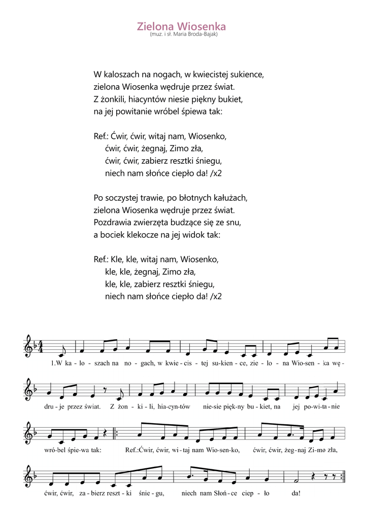 Zielona Wiosenka (muz. i sł. Maria Broda-Bajak) W kaloszach na nogach, w kwiecistej sukience, zielona Wiosenka wędruje przez świat. Z żonkili, hiacyntów niesie piękny bukiet, na jej powitanie wróbel śpiewa tak: Ref.: Ćwir, ćwir, witaj nam, Wiosenko, ćwir, ćwir, żegnaj, Zimo zła, ćwir, ćwir, zabierz resztki śniegu, niech nam słońce ciepło da! /x2 Po soczystej trawie, po błotnych kałużach, zielona Wiosenka wędruje przez świat. Pozdrawia zwierzęta budzące się ze snu, a bociek klekocze na jej widok tak: Ref.: Kle, kle, witaj nam, Wiosenko, kle, kle, żegnaj, Zimo zła, kle, kle, zabierz resztki śniegu, niech nam słońce ciepło da! /x2