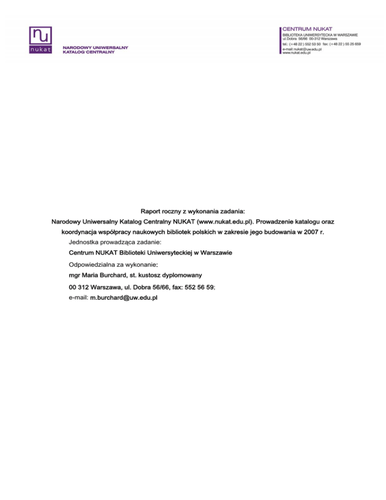 Raport roczny z wykonania zadania: Narodowy Uniwersalny Katalog Centralny NUKAT (www.nukat.edu.pl). Prowadzenie katalogu oraz koordynacja współpracy naukowych bibliotek polskich w zakresie jego budowania w 2007 r. Jednostka prowadząca zadanie: Centrum NUKAT Biblioteki Uniwersyteckiej w Warszawie Odpowiedzialna za wykonanie: mgr Maria Burchard, st. kustosz dyplomowany 00 312 Warszawa, ul. Dobra 56/66, fax: 552 56 59; e-mail: [email protected] SPIS TREŚCI Wprowadzenie......................................................................................................................................... 3 1. Najważniejsze prace rozwojowe wykonane z wykorzystaniem katalogu centralnego NUKAT........... 3 1) Wykaz wykonanych zadań.............................................................................................................. 3 Prowadzenie bazy NUKAT ............................................................................................................. 3 Budowanie centralnej informacji ..................................................................................................... 4 Obsługa współkatalogowania ......................................................................................................... 4 Współpraca z zagranicą ................................................................................................................. 5 Działania na rzecz spójności systemu centralnej informacji........................................................... 5 Działalność edukacyjna i naukowa Centrum NUKAT..................................................................... 6 2) Opis najważniejszych prac związanych z prowadzeniem współkatalogowaniem wykonanych w Centrum NUKAT .............................................................. 6 2. Wykorzystania katalogu NUKAT do wykonywania innych zadań ....................................................... 8 3. Informacja o bieżących kosztach utrzymania katalogu centralnego NUKAT i źródłach ich finansowania w 2007 r. ................................................................................ 8 Załącznik 1. Wyniki pracy ...................................................................................................................... 11 Załącznik 2. Infrastruktura informatyczna i oprogramowanie katalogu centralnego NUKAT................ 14 Załącznik 3. Referaty i prezentacje wygłoszone przez pracowników Centrum NUKAT na konferencjach i warsztatach. ........................................................... 15 Załącznik 4. Publikacje pracowników Centrum NUKAT........................................................................ 16 Załącznik 5. Tabela aktywności bibliotek katalogujących w NUKAT w 2007 r...................................... 17 2 WPROWADZENIE Narodowy Uniwersalny Katalog Centralny NUKAT budowany jest metodą współkatalogowania przez polskie biblioteki naukowe i stanowi źródło gotowych rekordów do budowania katalogów lokalnych. Dotyczy współkatalogowania zasobów polskich bibliotek naukowych realizowanego na podstawie powszechnie uznanych na świecie merytorycznych standardów bibliotekarskich oraz standardów wymiany danych (MARC 21, Library of Congress Subject Headings, ISO 2709 oraz UNICODE). Jest narzędziem umożliwiającym oszczędne i racjonalne budowanie centralnej informacji o zbiorach polskich bibliotek w skali kraju oraz za granicą poprzez współpracę z największym katalogiem centralnym świata OCLC (Online Center Library Catalog) oraz uczestniczenie w ogólnoświatowym projekcie Google Scholar. Umożliwia także oszczędne i racjonalne gospodarowanie środkami przeznaczanymi na budowanie katalogów komputerowych zarówno lokalnie na poziomie bibliotek, jak i centralnie, na poziomie instytucji przydzielających środki na katalogowanie zbiorów. Katalog centralny NUKAT prowadzony jest przez Centrum NUKAT zlokalizowane w Bibliotece Uniwersyteckiej w Warszawie. Centrum prowadzi kontrolę współkatalogowania, ustala procedury oraz przygotowuje i obsługuje narzędzia wprowadzania i dystrybucji danych. Ponadto prowadzi szkolenia z zakresu współkatalogowania, tworzenia rekordów kartoteki haseł wzorcowych oraz tworzenia i stosowania słownictwa języka KABA przygotowując materiały metodyczne na ten temat publikowane w serii Formaty. Kartoteki oraz w czasopismach fachowych. W bazie katalogu centralnego NUKAT znajdują się dwa zasadnicze podzbiory rekordów: rekordy bibliograficzne i rekordy Centralnej Kartoteki Haseł Wzorcowych. Stan zatrudnienia na koniec 2007r. wynosił łącznie 39 osób, w tym 37 zatrudnionych w pełnym wymiarze i 1 na 3/4 etatu i 1 na 1/2 etatu. 1. NAJWAŻNIEJSZE PRACE ROZWOJOWE WYKONANE Z WYKORZYSTANIEM KATALOGU CENTRALNEGO NUKAT 1) Wykaz wykonanych zadań Prowadzenie bazy NUKAT Administratorzy Ośrodka Kontroli Rekordów Bibliograficznych Centrum NUKAT rozpatrzyli 298 796 rekordów bibliograficznych, w tym 72 384 zgłoszonych modyfikacji, zatwierdzając do bazy 203 644 nowych rekordów. Administratorzy Ośrodka Formatów i Kartoteki Haseł Formalnych oraz Ośrodka Języka i Kartoteki wzorcowej KABA rozpatrzyli 275 754 rekordy haseł wzorcowych, w tym 55 823 zgłoszonych modyfikacji, zatwierdzając do bazy 200 478 nowych rekordów. Udostępniono w katalogu NUKAT do wykorzystania przez biblioteki współkatalogujące oraz jako narzędzia wyszukiwawcze 67 783 kopii nowych rekordów słownictwa oraz tematów JHP BN. Budowanie i kontrola rekordów JHP BN realizowana jest przez Bibliotekę Narodową. Udostępniono w katalogu NUKAT 3 564 kopie nowych rekordów polskiej wersji słownictwa Medical Subject Headings (MeSH) – polonizacja słownictwa MeSH i jego zastosowanie w 3 rekordach bibliograficznych koordynowane jest przez Bibliotekę Akademii Medycznej w Poznaniu. W budowaniu bazy katalogu centralnego uczestniczyło 1140 bibliotekarzy z 61 polskich bibliotek akademickich i naukowych 1 . Budowanie centra