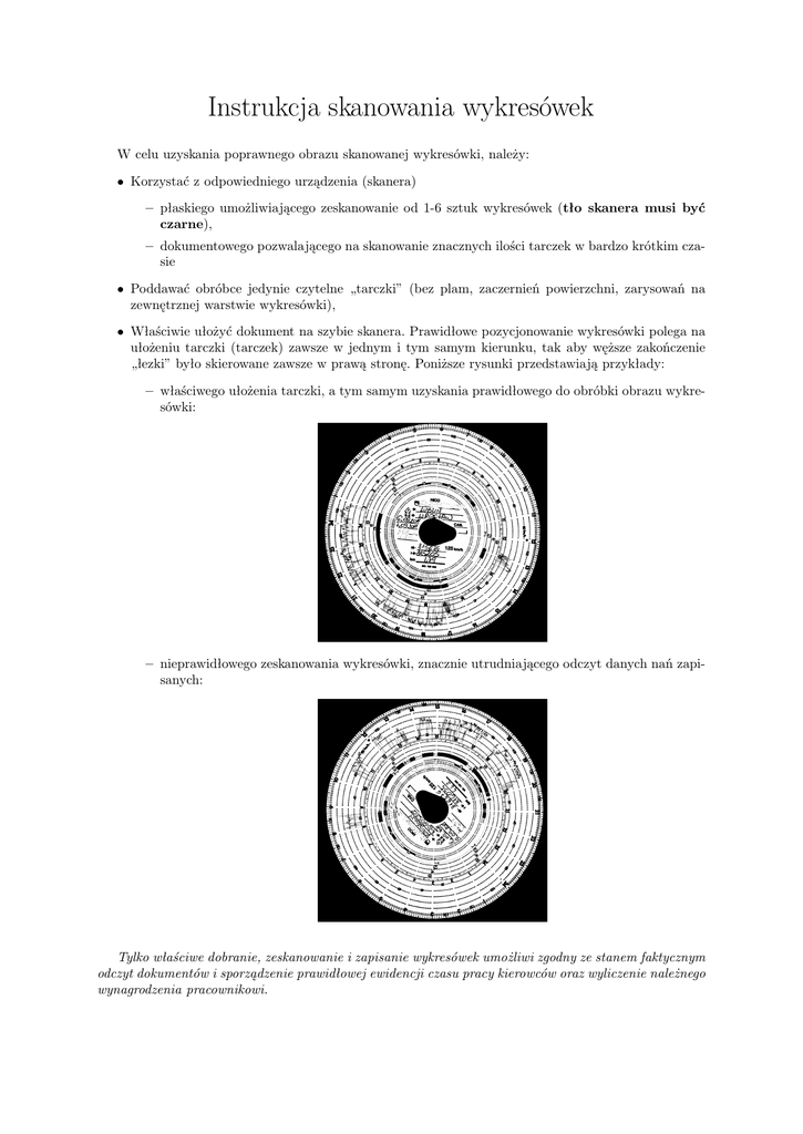 Instrukcja skanowania wykresówek W celu uzyskania poprawnego obrazu skanowanej wykresówki, należy: • Korzystać z odpowiedniego urządzenia (skanera) – płaskiego umożliwiającego zeskanowanie od 1-6 sztuk wykresówek (tło skanera musi być czarne), – dokumentowego pozwalającego na skanowanie znacznych ilości tarczek w bardzo krótkim czasie • Poddawać obróbce jedynie czytelne „tarczki” (bez plam, zaczernień powierzchni, zarysowań na zewnętrznej warstwie wykresówki), • Właściwie ułożyć dokument na szybie skanera. Prawidłowe pozycjonowanie wykresówki polega na ułożeniu tarczki (tarczek) zawsze w jednym i tym samym kierunku, tak aby węższe zakończenie „łezki” było skierowane zawsze w prawą stronę. Poniższe rysunki przedstawiają przykłady: – właściwego ułożenia tarczki, a tym samym uzyskania prawidłowego do obróbki obrazu wykresówki: – nieprawidłowego zeskanowania wykresówki, znacznie utrudniającego odczyt danych nań zapisanych: Tylko właściwe dobranie, zeskanowanie i zapisanie wykresówek umożliwi zgodny ze stanem faktycznym odczyt dokumentów i sporządzenie prawidłowej ewidencji czasu pracy kierowców oraz wyliczenie należnego wynagrodzenia pracownikowi.