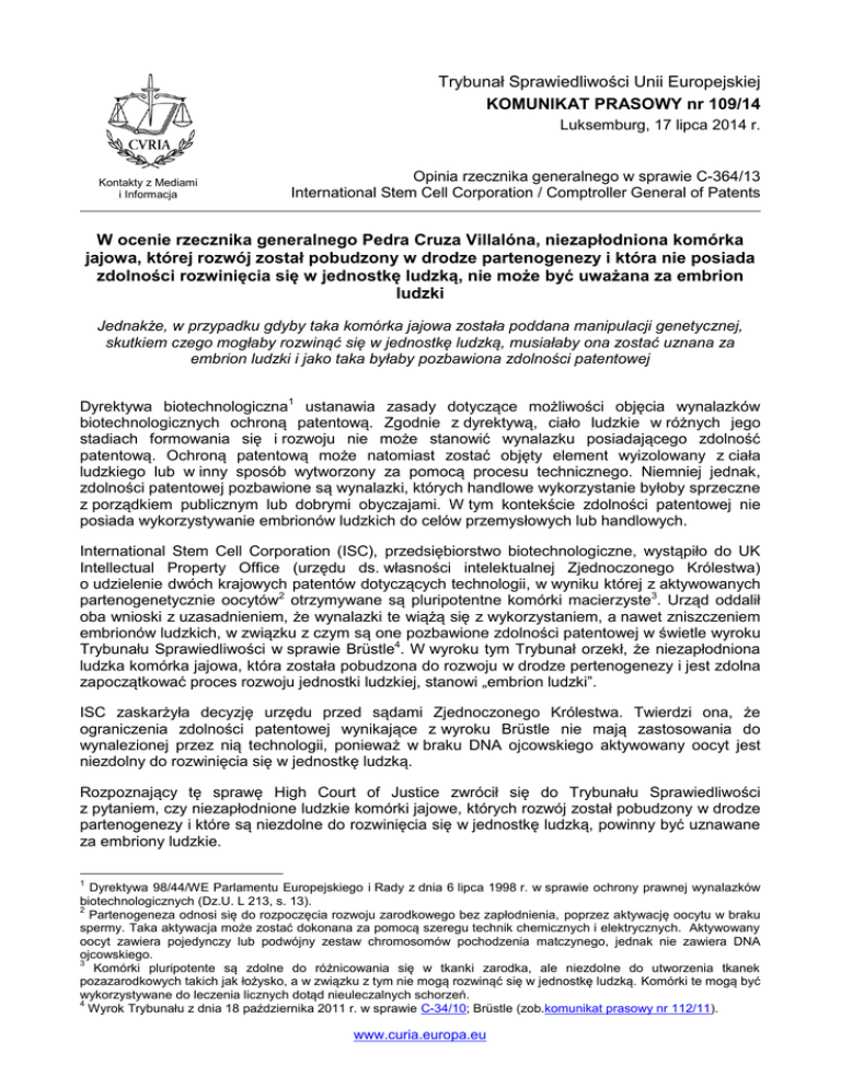 Trybunał Sprawiedliwości Unii Europejskiej KOMUNIKAT PRASOWY nr 109/14 Luksemburg, 17 lipca 2014 r. Kontakty z Mediami i Informacja Opinia rzecznika generalnego w sprawie C-364/13 International Stem Cell Corporation / Comptroller General of Patents W ocenie rzecznika generalnego Pedra Cruza Villalóna, niezapłodniona komórka jajowa, której rozwój został pobudzony w drodze partenogenezy i która nie posiada zdolności rozwinięcia się w jednostkę ludzką, nie może być uważana za embrion ludzki Jednakże, w przypadku gdyby taka komórka jajowa została poddana manipulacji genetycznej, skutkiem czego mogłaby rozwinąć się w jednostkę ludzką, musiałaby ona zostać uznana za embrion ludzki i jako taka byłaby pozbawiona zdolności patentowej Dyrektywa biotechnologiczna1 ustanawia zasady dotyczące możliwości objęcia wynalazków biotechnologicznych ochroną patentową. Zgodnie z dyrektywą, ciało ludzkie w różnych jego stadiach formowania się i rozwoju nie może stanowić wynalazku posiadającego zdolność patentową. Ochroną patentową może natomiast zostać objęty element wyizolowany z ciała ludzkiego lub w inny sposób wytworzony za pomocą procesu technicznego. Niemniej jednak, zdolności patentowej pozbawione są wynalazki, których handlowe wykorzystanie byłoby sprzeczne z porządkiem publicznym lub dobrymi obyczajami. W tym kontekście zdolności patentowej nie posiada wykorzystywanie embrionów ludzkich do celów przemysłowych lub handlowych. International Stem Cell Corporation (ISC), przedsiębiorstwo biotechnologiczne, wystąpiło do UK Intellectual Property Office (urzędu ds. własności intelektualnej Zjednoczonego Królestwa) o udzielenie dwóch krajowych patentów dotyczących technologii, w wyniku której z aktywowanych partenogenetycznie oocytów2 otrzymywane są pluripotentne komórki macierzyste3. Urząd oddalił oba wnioski z uzasadnieniem, że wynalazki te wiążą się z wykorzystaniem, a nawet zniszczeniem embrionów ludzkich, w związku z czym są one pozbawione zdolności patentowej w świetle wyroku Trybunału Sprawiedliwości w sprawie Brüstle4. W wyroku tym Trybunał orzekł, że niezapłodniona ludzka komórka jajowa, która została pobudzona do rozwoju w drodze pertenogenezy i jest zdolna zapoczątkować proces rozwoju jednostki ludzkiej, stanowi „embrion ludzki”. ISC zaskarżyła decyzję urzędu przed sądami Zjednoczonego Królestwa. Twierdzi ona, że ograniczenia zdolności patentowej wynikające z wyroku Brüstle nie mają zastosowania do wynalezionej przez nią technologii, ponieważ w braku DNA ojcowskiego aktywowany oocyt jest niezdolny do rozwinięcia się w jednostkę ludzką. Rozpoznający tę sprawę High Court of Justice zwrócił się do Trybunału Sprawiedliwości z pytaniem, czy niezapłodnione ludzkie komórki jajowe, których rozwój został pobudzony w drodze partenogenezy i które są niezdolne do rozwinięcia się w jednostkę ludzką, powinny być uznawane za embriony ludzkie. 1 Dyrektywa 98/44/WE Parlamentu Europejskiego i Rady z dnia 6 lipca 1998 r. w sprawie ochrony prawnej wynalazków biotechnologicznych (Dz.U. L 213, s. 13). 2 Partenogeneza odnosi się do rozpoczęcia rozwoju zarodkowego bez zapłodnienia, poprzez aktywację oocytu w braku spermy. Taka aktywacja może zostać dokonana za pomocą szeregu technik chemicznych i elektrycznych. Aktywowany oocyt zawiera pojedynczy lub podwójny zestaw chromosomów pochodzenia matczynego, jednak nie zawiera DNA ojcowskiego. 3 Komórki pluripotente są zdolne do różnicowania się w tkanki zarodka, ale niezdolne do utworzenia tkanek pozazarodkowych takich jak łożysko, a w związku z tym nie mogą rozwinąć się w jednostkę ludzką. Komórki te mogą być wykorzystywane do leczenia licznych dotąd nieuleczalnych schorzeń. 4 Wyrok Trybunału z dnia 18 października 2011 r. w sprawie C-34/10; Brüstle (zob.komunikat prasowy nr 112/11). www.curia.europa.eu W przedłożonej dzisiaj opinii rzecznik generalny Pedro Cruz Villalón stwierdził, że przy dokonywaniu oceny, czy niezapłodniona komórka jajowa powinna być uznawana za ludzki embrion, decydującym kryterium, które należy wziąć pod uwagę, jest to, czy ma ona wrodzoną zdolność do rozwinięcia się w jednostkę ludzką. Z kolei, przeciwnie, sam fakt, że niezapłodniona komórka ludzka jest zdolna do podziału komórkowego i różnicowania podobnie jak zapłodniona komórka jajowa, nie wystarczy do uznania jej za ludzki embrion. Ponieważ przedłożone przez strony uwagi, jak również wyjaśnienia przedstawione przez High Court of Justice, sugerowały, że partenoty, organizmy powstałe w wyniku partenogenezy, nie mają jako takie wrodzonej zdolności do rozwinięcia się w jednostkę ludzką, rzecznik generalny zaproponował Trybunałowi wykluczyć je z definicji embrionów ludzkich. Jednakże, w świetle zakończonych sukcesem genetycznych manipulacji przeprowadzonych na myszach, rzecznik generalny P. Cruz Villalón nie może wykluczyć możliwości, że w przyszłości również ludzkie partenoty będą mogły podlegać zmianom genetycznym umożliwiającym im zakończenie rozwoju zarodkowego i w rezultacie rozwinięcie się w jednostkę ludzką. Z tego względu rzecznik generalny podkreślił, że partenoty mogą być wykluczone z pojęcia embrionów w zakresie, w jakim nie zostały poddane genetycznym manipulacjom w celu uzyskania zdolności do rozwinięcia się w jednostkę ludzką. Wreszcie rzecznik generalny wskazał, że jego zdaniem nawet gdyby ludzkie partenoty należało wykluczyć z pojęcia embrionów ludzkich, dyrektywa nie zakazuje państwom członkowskim pozbawienia partenot zdolności patentowej ze względu na rozważania natury etycznej i moralnej. W jego opinii dyrektywa, pozbawiając ludzkie embriony zdolności patentowej, wyraża jedynie określone minimum, zakaz obejmujący całą Unię Europejską, natomiast zezwala państwom członkowskim na rozwinięcie zakazu udziela