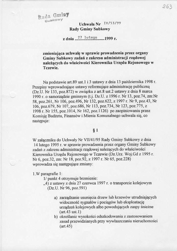 ss3 GnrinY ards "'"-subFowy - Uchwalay1, rv /53/e9 Rady Gminy Subkowy rsssr. z dnia...2-1..].9.I99.9....... zmieniaj4cauchwalpw sprawie prowadzeniaprzez organy Gminy Subkowy zadafiz zakresuadministracji rz4dowej Kierownika Urzpdu Rejonowegow naleZ4cychdo wlaSciwoSci Tczewie. 1998t ' Na podstawieart.89ust.l i 3 ustawyz dnia13 puhdzretnika Przepisywprowadzajqceustawyreformuj4ceadministracjppubliczn4 (Dz.U.Nr 133,po2.872)wzu'riqilaz art.8ust.2ustawyz dnia 8 marca gminnym(tj. Dz.U. z 1996r. Nr 13,poz.74,zm:Nr 1990r. o samorzqdzie Nr r. Nr 9, poz.43, 58,poz.26l,Nr106,poz.496,Nr132,po2.622,21997 107,poz.686,Nr113,poz.734,Nr123,poz.775,z 106,po2.679,Nr 1998r. Nr l55,poz.l}l4, Nr 162,poz.ll26) po zaopiniowaniuprzez KomisjgBud2etu,Finans6wi Mienia Komunalnegouchwalasip,co nastqpuje: s1 \-. W zalqczrik:odo Uchwaty Nr VIV4I/95 Rady Gminy Subkowyz dnia przezorgaryGminy Subkowy 14 lutego1995r. w sprawieprowadzenia do wlaSciwoSci zadartz zakresuadministracjirz4dowejnaleZ4cych KierownikaUrzEduRejonowegow Tczewie(Dz.Urz.Woj.Gd z 1995r. t. Nr 65,poz.228) Nr 6, poz.32,zm:Nr 18,po2.92,21997 zmiany: wprowadzasipnastppujqce 1.W paragrafieI : l/ punkt 4 otrzymlje brzmienie: ,,4) z ustawyz dnia27 czerwca1997r. o transporciekolejowym (Dz.U.Nr 96,Po2391) a) zarzqdzanieusunigciadrzew lub krzew6w utrudniaj4cych widocznoSisygnal6wi poci4g6wlub eksploatacjE urz4dzerikolejowychalbopowoduj4cychzaspySnieZne (art.43ust.l) z zastosowaniem wysokoSciodszkodowania b) okreSlanie zasadpr zewidzianychprzy w ywlaszczaniunieruchomoSci (art.45) *n6* 2/ w punkciel0: a) skreSlasigpunktyp - s, b) w ptrnkcie,,t'wytazy ,,afi.87,88i 89" zastgpujesig 81 a i 81 o" wyrazami,,art.8l, 3/ w punkciell wyrazy,,arl 20 $ I pkt l" zastgpujesigwyrazami ,3fi20 $ 1Pkt2". 2.W pwagrafre2 wyrazy,,KierownikUrzpduRejonowegow Tczewie" zastgpujesigwyazem ,,Starosta". 3. Po paragrafie2 dodajesipparagraf2a w brzmieniu: ,,$ 2a. 1. SprawypowierzoneGminieniniejszymporozumieniem go. w ramach1,5 etatukalkulacyjne bgd4prowadzone 2. Starostazapewnipokryciekoszt6wzatrudnienia pracownik6wtj: 1) wynagrodzef: a) w miesi4cachstyczefr- marzec1999r. |.000 ztll etatkalkulacyjny b) od kwietniado grudnia1999r. - 1.100zl / I etatkalkulacyjny c) od stycznia2000r. - 1100zl zwigkszoneo wska:Znikwzrostu wynagrodzefi w sferzebudZetowej/letatkalkulacyjny 2) skladekztbezpieczeniaspolecznego @8%) roczrrych(1,03 %) , 3) dodatkowychwynagrodzef 3. Srodkifinansowe,o kt6rychmowaw ust.2Starosta przekuzeGminiedo l0-go dniakazdegomiesi4caw nastgpuj : 4cejwysokoSci -I[ 1999r. - 2.293,45zl 1) za miesi4ce I - IV-XII 1999r. - 2.479,77zl 2) za miesi4ce nale2noSci z tytulu 4. GminaodstEpuje od dochodzenia koszt6w rzeczowychoraz odpisuna zakladowyfundusz Swiadczefsocjalnych21999r. 5.Starosta zatrudnijednegopracownikaUrzpduGminy za jego zgod4w wymiarzepelnegoetatuz dniemrozlr'riryania niniejszegoporozumienia" 4.Paragraf3 otrzymujebrzmienie: porozumieniena czasokreSlonydo ,,$ 3. Shonyzawieraj4niniejsze przedluzenia. dnia31 marca2000r. z moZliwoSci4jego e64 - ? - Uzgodnieniew tym zalaesiepowinnonastqpidnie p62niej niz w terminie do dnia 20 grudnia 1999r". s2 Uchwalawchodziw Zyciez dniemogloszeniana tablicy ogloszef Urzgdu Gminy. iA CA PRAWNY lut lt 192