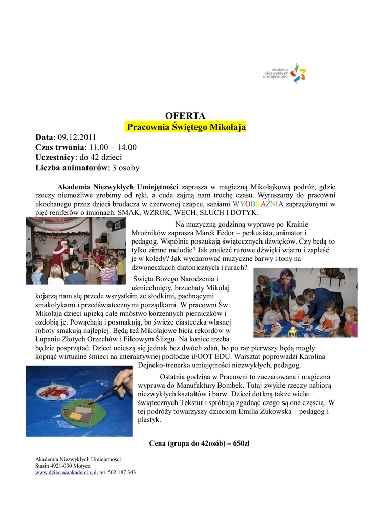 OFERTA Pracownia Świętego Mikołaja Data: 09.12.2011 Czas trwania: 11.00 – 14.00 Uczestnicy: do 42 dzieci Liczba animatorów: 3 osoby Akademia Niezwykłych Umiejętności zaprasza w magiczną Mikołajkową podróż, gdzie rzeczy niemożliwe zrobimy od ręki, a cuda zajmą nam trochę czasu. Wyruszamy do pracowni ukochanego przez dzieci brodacza w czerwonej czapce, saniami WYOBRAŹNIA zaprzężonymi w pięć reniferów o imionach: SMAK, WZROK, WĘCH, SŁUCH I DOTYK. Na muzyczną godzinną wyprawę po Krainie Mroźników zaprasza Marek Fedor – perkusista, animator i pedagog. Wspólnie poszukają świątecznych dźwięków. Czy będą to tylko zimne melodie? Jak znaleźć rurowe dźwięki wiatru i zapleść je w kolędy? Jak wyczarować muzyczne barwy i tony na dzwoneczkach diatonicznych i rurach? Święta Bożego Narodzenia i uśmiechnięty, brzuchaty Mikołaj kojarzą nam się przede wszystkim ze słodkimi, pachnącymi smakołykami i przedświatecznymi porządkami. W pracowni Św. Mikołaja dzieci upieką całe mnóstwo korzennych pierniczków i ozdobią je. Powąchają i posmakują, bo świeże ciasteczka własnej roboty smakują najlepiej. Będą też Mikołajowe bicia rekordów w Łupaniu Złotych Orzechów i Filcowym Ślizgu. Na koniec trzeba będzie posprzątać. Dzieci ucieszą się jednak bez dwóch zdań, bo po raz pierwszy będą mogły kopnąć wirtualne śmieci na interaktywnej podłodze iFOOT EDU. Warsztat poprowadzi Karolina Dejneko-trenerka umiejętności niezwykłych, pedagog. Ostatnia godzina w Pracowni to zaczarowana i magiczna wyprawa do Manufaktury Bombek. Tutaj zwykłe rzeczy nabiorą niezwykłych kształtów i barw. Dzieci dotkną także wielu świątecznych Tekstur i spróbują zgadnąć czego są one częscią. W tej podróży towarzyszy dzieciom Emilia Żukowska – pedagog i plastyk. Cena (grupa do 42osób) – 650zł Akademia Niezwykłych Umiejętności Stasin 4921-030 Motycz www.dzieciecaakademia.pl, tel. 502 187 343