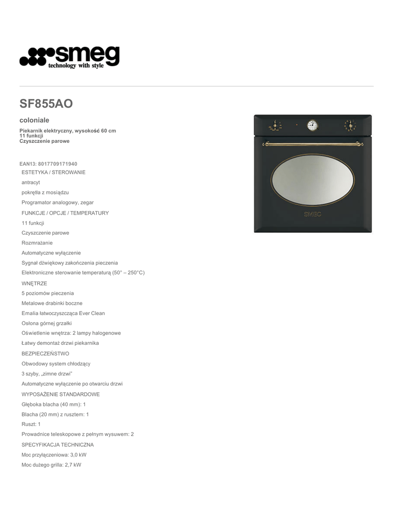 SF855AO coloniale Piekarnik elektryczny, wysokość 60 cm 11 funkcji Czyszczenie parowe EAN13: 8017709171940 ESTETYKA / STEROWANIE antracyt pokrętła z mosiądzu Programator analogowy, zegar FUNKCJE / OPCJE / TEMPERATURY 11 funkcji Czyszczenie parowe Rozmrażanie Automatyczne wyłączenie Sygnał dźwiękowy zakończenia pieczenia Elektroniczne sterowanie temperaturą (50° – 250°C) WNĘTRZE 5 poziomów pieczenia Metalowe drabinki boczne Emalia łatwoczyszcząca Ever Clean Osłona górnej grzałki Oświetlenie wnętrza: 2 lampy halogenowe Łatwy demontaż drzwi piekarnika BEZPIECZEŃSTWO Obwodowy system chłodzący 3 szyby, „zimne drzwi” Automatyczne wyłączenie po otwarciu drzwi WYPOSAŻENIE STANDARDOWE Głęboka blacha (40 mm): 1 Blacha (20 mm) z rusztem: 1 Ruszt: 1 Prowadnice teleskopowe z pełnym wysuwem: 2 SPECYFIKACJA TECHNICZNA Moc przyłączeniowa: 3,0 kW Moc dużego grilla: 2,7 kW Napięcie: 220-240 V Zabezpieczenie: 13 A Częstotliwość: 50/60 Hz Functions Wersje SF855X - stal nierdzewna, srebrne pokrętła SF855A - antracyt, złote pokrętła SF855P - kremowy, złote pokrętła SF855PO - kremowy, pokrętła z mosiądzu SF855PX - kremowy, srebrne pokrętła SMEG S.p.A. Via Leonardo da Vinci, 4 42016 Guastalla (RE) Tel. 0522 821 1 SF855AO coloniale czyszczenie parowe 60 cm antracyt klasa energochłonności A elektryczne Klasa A: Klasa A piekarnika zapewnia niskie zużycie energii. POTRÓJNIE OSZKLONE DRZWI: Zewnętrzna powierzchnia nawet podczas długiego pieczenia pozostaje zimna, co zapewnia maksymalne bezpieczeństwo użytkowania. Natomiast dwie wewnętrzne szyby odbijają ciepło, co ma znaczenie dla efektywności używanej energii. POZIOMY PIEKARNIKA: Piekarniki firmy SMEG z maksymalna pojemnością 72 litrów posiadają 5 poziomów, co zapewnia maksymalną elastyczność w użytkowaniu. Pozwala to na oszczędność czasu potrzebnego do przyrządzenia kilku potraw w tym samym czasie albo konieczności przygotowania dużych ilości. DEMONTOWALNE SZKŁO WEWNĘTRZNE: W większości piekarników firmy SMEG szkło wewnątrz drzwi jest łatwe w demontażu, co również znacznie ułatwia utrzymanie w czystości urządzenia. JEDNOLITE SZKŁO WEWNĘTRZNE: W większości piekarników firmy SMEG zainstalowane w drzwiach szkło wewnętrzne posiada wyjątkowo gładką powierzchnię, bez żadnych wkrętów, co znacznie ułatwia utrzymanie w czystości urządzenia. STATYCZNY SYSTEM CHŁODZENIA: Innowacyjny STATYCZNY system chłodzenia pomaga chronić meble od nadmiernej temperatury podczas pracy urządzenia. PROWADNICE TELESKOPOWE: Łatwe w instalacji prowadnice teleskopowe znacznie ułatwiają wyciąganie potraw z piekarnika, bez ich przymocowywania. Zapewnia to maksymalne bezpieczeństwo w procesie gotowania. MAKSYMALNA POJEMNOŚĆ: Niektóre modele piekarników firmy SMEG posiadają pojemność netto 72 litrów (79 l brutto) – tj. o 35% większej od standardowej pojemności. Zwiększenie pojemności powoduje zwiększenie liczby poziomów pieczenia do pięciu. OŚWIETLENIE WNĘTRZA PIEKARNIKA: Piekarniki firmy Smeg o maksymalnej pojemności dla lepszego oświetlenia wnętrzna posiadają dwie lampy halogenowe umieszczone po bokach i na różnych poziomach. CHŁODNE DRZWI: Większość piekarników firmy SMEG posiada “chłodne drzwi”. Dzięki połączeniu systemu obwodowego chłodzenia i wewnętrznym szybom odbijającym ciepło, temperatura zewnętrznej powierzchni drzwi jest utrzymywana poniżej 50 ° C. Dodatkowo system ten chroni meble będące w kontakcie z piekarnikiem przed przegrzewaniem. OSŁONA GÓRNEJ GRZAŁKI: Rozwiązanie to chroni górną część piekarnika przed zanieczyszczeniem. Element chroniący jest łatwy w demontażu i może być myty w zmywarce. EMALIA ŁATWOCZYSZCZĄCA EVER CLEAN: Emalia, którą jest pokryte wnętrze piekarników. Jest niezwykle łatwa w czyszczeniu, ze względu na znikomą interakcję z tłuszczami i odporność na różne kwasy. GRZAŁKA DOLNA: Funkcja ta jest najbardziej odpowiednia do przygotowania potraw wymagających wysokiej temepratury od spodu, bez potrzeby przypiekania lub do powolnego pieczenia. Do ciast, pizzy, potrawek, lub zapiekanek. WENTYLATOR, GRZAŁKA GÓRNA I DOLNA: Grzałki w połączeniu z wentylatorem zapewniają równomierną temperaturę w całej komorze. Jest to metoda dająca podobne efekty do pieczenia tradycyjnego. Mniej wydajna od użycia wentylatora i 3 grzalek. Najlepsza do wypieku ciast. WENTYLATOR, GRZAŁKA DOLNA: Dodanie dolnej grzałki do wymuszonego obiegu podnosi temperaturę w dolnej części potrawy, zapewniając jej skuteczniejsze pieczenie środka bez przypiekania powierzchni. GRZAŁKA GÓRNA I DOLNA: Włączenie tych 2 grzałek stosuje się w pieczeniu tradycyjnym, odpowiednim do przygotowanie potraw wymagających delikatnego podgrzewania, jak np. pieczenie ciasta. Piekarnik powinien zostać wstępnie nagrzany do wymaganej temperatury, a naczynie ustawione po środku. Jest to metoda , która najlepiej sprawdza się w przypadku większych, pojedynczych wypieków. WENTYLATOR, GRZAŁKA PIERŚCIENIOWA: Grzałka w połączeniu z wentylatorem zapewniają równomierną temperaturę w całej komorze, na wszystkich półkach. Podczas pieczenia potraw ponad 20 minut, niepotrzebne jest stosowanie wstepnego rozgrzania piekarnika. Jest to metoda dająca oszczędność energii, kótszy czas podgrzewania. idealna do odgrzewania zimnych potraw. WENTYLATOR, GRZAŁKA PIERŚCIENIOWA, GÓRNA I DOLNA: Grzałki w połączeniu z wentylatorem zapewniają równomierną temperaturę w całej komorze, na wszystkich półkach. Jest to metoda dająca podobne efekty do pieczenia na rożnie, poruszając powietrze wokół potrawy zamiast poruszać potrawą. WENTYLATOR I GRZAŁKA GRILLA: Pieczenie przy uzyciu tej funkcji musi przebiegać przy zamkniętych drzwiczkach. Wentylator łagodzi silne grzanie grilla, jednocześnie zapewniając doskonałe grillowanie bez potrzeby odwracania pieczonej potrawy. Otrzymujemy potrawę d