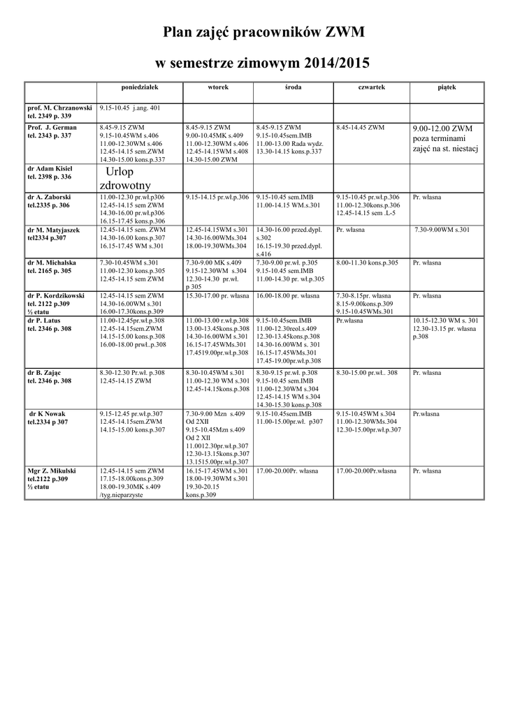 Plan zajęć pracowników ZWM w semestrze zimowym 2014/2015 poniedziałek prof. M. Chrzanowski tel. 2349 p. 339 9.15-10.45 j.ang. 401 Prof. J. German tel. 2343 p. 337 8.45-9.15 ZWM 9.15-10.45WM s.406 11.00-12.30WM s.406 12.45-14.15 sem.ZWM 14.30-15.00 kons.p.337 dr Adam Kisiel tel. 2398 p. 336 Urlop zdrowotny dr A. Zaborski tel.2335 p. 306 wtorek środa czwartek piątek 8.45-9.15 ZWM 9.00-10.45MK s.409 11.00-12.30WM s.406 12.45-14.15WM s.408 14.30-15.00 ZWM 8.45-9.15 ZWM 9.15-10.45sem.IMB 11.00-13.00 Rada wydz. 13.30-14.15 kons.p.337 8.45-14.45 ZWM 9.00-12.00 ZWM poza terminami zajęć na st. niestacj 11.00-12.30 pr.wł.p306 12.45-14.15 sem ZWM 14.30-16.00 pr.wł.p306 16.15-17.45 kons.p.306 12.45-14.15 sem. ZWM 14.30-16.00 kons.p.307 16.15-17.45 WM s.301 9.15-14.15 pr.wł.p.306 9.15-10.45 sem.IMB 11.00-14.15 WM.s.301 9.15-10.45 pr.wł.p.306 11.00-12.30kons.p.306 12.45-14.15 sem .L-5 Pr. własna 12.45-14.15WM s.301 14.30-16.00WMs.304 18.00-19.30WMs.304 Pr. własna 7.30-9.00WM s.301 dr M. Michalska tel. 2165 p. 305 7.30-10.45WM s.301 11.00-12.30 kons.p.305 12.45-14.15 sem ZWM 8.00-11.30 kons.p.305 Pr. własna dr P. Kordzikowski tel. 2122 p.309 ½ etatu dr P. Latus tel. 2346 p. 308 12.45-14.15 sem ZWM 14.30-16.00WM s.301 16.00-17.30kons.p.309 11.00-12.45pr.wł.p.308 12.45-14.15sem.ZWM 14.15-15.00 kons.p.308 16.00-18.00 prwł..p.308 7.30-9.00 MK s.409 9.15-12.30WM s.304 12.30-14.30 pr.wł. p 305 15.30-17.00 pr. własna 14.30-16.00 przed.dypl. s.302 16.15-19.30 przed.dypl. s.416 7.30-9.00 pr.wł. p.305 9.15-10.45 sem.IMB 11.00-14.30 pr. wł.p.305 16.00-18.00 pr. własna 7.30-8.15pr. własna 8.15-9.00kons.p.309 9.15-10.45WMs.301 Pr.własna Pr. własna dr B. Zając tel. 2346 p. 308 8.30-12.30 Pr.wł. p.308 12.45-14.15 ZWM 8.30-15.00 pr.wł.. 308 Pr. własna dr K Nowak tel.2334 p 307 9.15-12.45 pr.wł.p.307 12.45-14.15sem.ZWM 14.15-15.00 kons.p.307 9.15-10.45WM s.304 11.00-12.30WMs.304 12.30-15.00pr.wł.p.307 Pr.własna Mgr Z. Mikulski tel.2122 p.309 ½ etatu 12.45-14.15 sem ZWM 17.15-18.00kons.p.309 18.00-19.30MK s.409 /tyg.nieparzyste 17.00-20.00Pr.własna Pr. własna dr M. Matyjaszek tel2334 p.307 11.00-13.00 r.wł.p.308 13.00-13.45kons.p.308 14.30-16.00WM s.301 16.15-17.45WMs.301 17.4519.00pr.wł.p.308 9.15-10.45sem.IMB 11.00-12.30reol.s.409 12.30-13.45kons.p.308 14.30-16.00WM s. 301 16.15-17.45WMs.301 17.45-19.00pr.wł.p.308 8.30-10.45WM s.301 8.30-9.15 pr.wł. p.308 11.00-12.30 WM s.301 9.15-10.45 sem.IMB 12.45-14.15kons.p.308 11.00-12.30WM s.304 12.45-14.15 WM s.304 14.30-15.30 kons.p.308 7.30-9.00 Mzn s.409 9.15-10.45sem.IMB Od 2XII 11.00-15.00pr.wł. p307 9.15-10.45Mzn s.409 Od 2 XII 11.0012.30pr.wł.p.307 12.30-13.15kons.p.307 13.1515.00pr.wł.p.307 16.15-17.45WM s.301 17.00-20.00Pr. własna 18.00-19.30WM s.301 19.30-20.15 kons.p.309 10.15-12.30 WM s. 301 12.30-13.15 pr. własna p.308