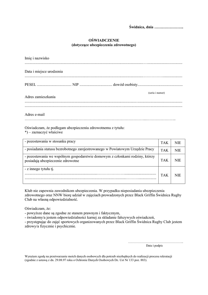 Świdnica, dnia ………………….. OŚWIADCZENIE (dotyczące ubezpieczenia zdrowotnego) Imię i nazwisko ............................................................................................................................….................................... Data i miejsce urodzenia ............................................................................................................................…………….................... PESEL .................................... NIP .................................. dowód osobisty............................................... (seria i numer) Adres zamieszkania .................................................................................................................................................................... .................................................................................................................................................................... Adres e-mail …………………………………………………………………………………...………………….. Oświadczam, że podlegam ubezpieczeniu zdrowotnemu z tytułu: *) – zaznaczyć właściwe - pozostawania w stosunku pracy TAK NIE - posiadania statusu bezrobotnego zarejestrowanego w Powiatowym Urzędzie Pracy TAK NIE - pozostawania we wspólnym gospodarstwie domowym z członkami rodziny, którzy posiadają ubezpieczenie zdrowotne TAK NIE TAK NIE - z innego tytułu tj. ............................................................................…………………................................. ..........................................................................................................………................... Klub nie zapewnia zawodnikom ubezpieczenia. W przypadku nieposiadania ubezpieczenia zdrowotnego oraz NNW biorę udział w zajęciach prowadzonych przez Black Griffin Świdnica Rugby Club na własną odpowiedzialność. Oświadczam, że: - powyższe dane są zgodne ze stanem prawnym i faktycznym, - świadomy/a jestem odpowiedzialności karnej za składanie fałszywych oświadczeń, - przystępując do zajęć sportowych organizowanych przez Black Griffin Świdnica Rugby Club jestem zdrowy/a fizycznie i psychicznie. …………………………………………….. Data i podpis Wyrażam zgodę na przetwarzanie moich danych osobowych dla potrzeb niezbędnych do realizacji procesu rekrutacji (zgodnie z ustawą z dn. 29.08.97 roku o Ochronie Danych Osobowych Dz. Ust Nr 133 poz. 883).