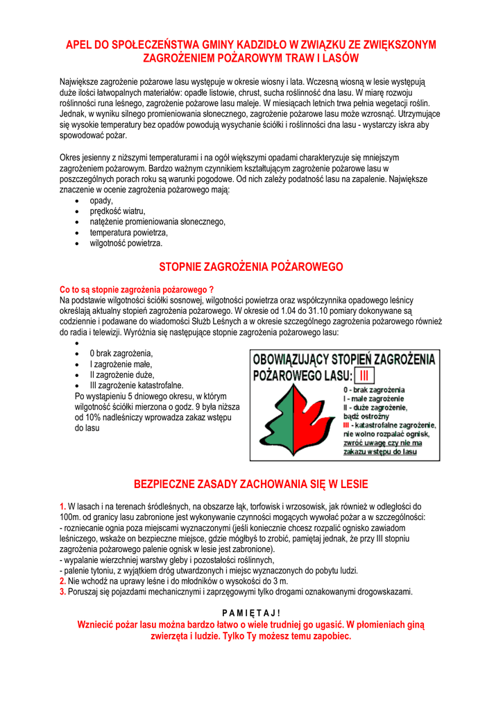 APEL DO SPO ECZE STWA GMINY KADZID O W ZWI ZKU ZE ZWI KSZONYM ZAGRO ENIEM PO AROWYM TRAW I LASÓW Najwi ksze zagro enie po arowe lasu wyst puje w okresie wiosny i lata. Wczesn wiosn w lesie wyst puj du e ilo ci atwopalnych materia ów: opad e listowie, chrust, sucha ro linno dna lasu. W miar rozwoju ro linno ci runa le nego, zagro enie po arowe lasu maleje. W miesi cach letnich trwa pe nia wegetacji ro lin. Jednak, w wyniku silnego promieniowania s onecznego, zagro enie po arowe lasu mo e wzrosn . Utrzymuj ce si wysokie temperatury bez opadów powoduj wysychanie ció ki i ro linno ci dna lasu - wystarczy iskra aby spowodowa po ar. Okres jesienny z ni szymi temperaturami i na ogó wi kszymi opadami charakteryzuje si mniejszym zagro eniem po arowym. Bardzo wa nym czynnikiem kszta tuj cym zagro enie po arowe lasu w poszczególnych porach roku s warunki pogodowe. Od nich zale y podatno lasu na zapalenie. Najwi ksze znaczenie w ocenie zagro enia po arowego maj : opady, pr dko wiatru, nat enie promieniowania s onecznego, temperatura powietrza, wilgotno powietrza. STOPNIE ZAGRO ENIA PO AROWEGO Co to s stopnie zagro enia po arowego ? Na podstawie wilgotno ci ció ki sosnowej, wilgotno ci powietrza oraz wspó czynnika opadowego le nicy okre laj aktualny stopie zagro enia po arowego. W okresie od 1.04 do 31.10 pomiary dokonywane s codziennie i podawane do wiadomo ci S b Le nych a w okresie szczególnego zagro enia po arowego równie do radia i telewizji. Wyró nia si nast puj ce stopnie zagro enia po arowego lasu: 0 brak zagro enia, I zagro enie ma e, II zagro enie du e, III zagro enie katastrofalne. Po wyst pieniu 5 dniowego okresu, w którym wilgotno ció ki mierzona o godz. 9 by a ni sza od 10% nadle niczy wprowadza zakaz wst pu do lasu BEZPIECZNE ZASADY ZACHOWANIA SI W LESIE 1. W lasach i na terenach ródle nych, na obszarze k, torfowisk i wrzosowisk, jak równie w odleg ci do 100m. od granicy lasu zabronione jest wykonywanie czynno ci mog cych wywo po ar a w szczególno ci: - rozniecanie ognia poza miejscami wyznaczonymi (je li koniecznie chcesz rozpali ognisko zawiadom le niczego, wska e on bezpieczne miejsce, gdzie móg by to zrobi , pami taj jednak, e przy III stopniu zagro enia po arowego palenie ognisk w lesie jest zabronione). - wypalanie wierzchniej warstwy gleby i pozosta ci ro linnych, - palenie tytoniu, z wyj tkiem dróg utwardzonych i miejsc wyznaczonych do pobytu ludzi. 2. Nie wchod na uprawy le ne i do m odników o wysoko ci do 3 m. 3. Poruszaj si pojazdami mechanicznymi i zaprz gowymi tylko drogami oznakowanymi drogowskazami. PAMI TAJ! Wznieci po ar lasu mo na bardzo atwo o wiele trudniej go ugasi . W p omieniach gin zwierz ta i ludzie. Tylko Ty mo esz temu zapobiec. Ustawianie stert stogów, brogów jest dopuszczalne pod warunkiem zachowania odleg ci: - 30 m od budynków wykonanych z materia ów palnych; - 20 m od budynków wykonanych z materia ów nie palnych i o pokryciu co najmniej trudno zapalnym; - 30 m od dróg publicznych i torów kolejowych; - 30 m od urz dze i przewodów linii elektrycznych wysokiego napi cia; - 100 m od lasów i terenów zadrzewionych; - 30 m pomi dzy stertami i stogami. WYPALANIE TRAW Wspó cze nie to ogólny termin oznaczaj cy wzniecenie ognia na obszarach nieu ytków, trawiastych i uprawnych w celu pozbycia si pozosta ci uschni tej ro linno ci. Wypalanie traw nie ma uzasadnienia, pozostaj c szkodliwym, a nawet niebezpiecznym prze ytkiem, w postaci mocno utrwalonych przyzwyczaje ludno ci wiejskiej, s dz cej e jest to dobry sposób na pozbycie si resztek z pola. W du ej liczbie przypadków wypalanie traw to nieodpowiedzialne zabawy dzieci. Podpalenia traw jest uznawane za akt bezmy lno ci i wandalizmu. Prawo Ustawa z dnia 16 kwietnia 2004 r. o ochronie przyrody (Dz. U. nr 92, poz. 880) okre la: Art. 124. Zabrania si wypalania k, pastwisk, nieu ytków, rowów, pasów przydro nych, szlaków kolejowych oraz trzcinowisk i szuwarów. Art. 131. Kto: (...) wypala ki, pastwiska, nieu ytki, rowy, pasy przydro ne, szlaki kolejowe, trzcinowiska lub szuwary – podlega karze aresztu albo grzywny. Prawo nie zabrania jednak wypalania s omy na polach uprawnych, li ci w ogrodach oraz wypalania zwi zanego z gospodark le lub pracami budowlanymi. Zagro enie po arowe Efektem wypalania s cz sto niekontrolowane po ary, skutkuj ce nieraz du ymi stratami materialnymi, a nawet ofiarami miertelnymi, spowodowane przerzuceniem si ognia na zabudowania lub lasy. Zagro one s te trzcinowiska i oczerety. Szczególnie niekorzystne s przerzuty po arów na torfowiska, które w wyniku po arów mog ulec ca kowitemu unicestwieniu, poniewa tl c si pod powierzchni s bardzo trudne do ugaszenia. Stanowi te zagro enie dla przebywaj cych na nich ludzi i zwierz t. Zwalczanie wypalania Walka z tym zjawiskiem jest przedmiotem akcji edukacyjnych przeprowadzanych przez s by le ne, Pa stwow Stra Po arn i organizacje ekologiczne przy wspó udziale m odzie y szkolnej. Od sierpnia 2004 r. sprzymierze cem w walce z wypalaniem traw sta y si przepisy dotycz ce dop at rolniczych. Uznaje si w nich, e wypalanie traw jest dzia aniem wbrew tzw. dobrej kulturze rolnej, a rolnicy dopuszczaj cy si takich praktyk mog zosta pozbawieni dop at bezpo rednich i rolno rodowiskowych z funduszów Unii Europejskiej. Skutki ekologiczne Zdaniem organizacji ekologicznych: brak jest uzasadnienia zarówno ekologicznego jak i rolniczego dla wypalania traw, wypalania skutkuj negatywnie poprzez straty we florze i faunie oraz degradacj ekosystemu przyrodniczego wa nego w nowoczesnej gospodarce rolnej. Podczas po aru niszczona jest cz niezb dnej dla yznej gleby materii organicznej, w wyniku czego zostaje spowolniony proces tworzenia próchnicy (humusu). W trakcie spalania, redukcji i wyparowaniu ulegaj zwi zki azotu, a zwi zki potasu i fosforu pozostaj w popiele. Cz soli mineralnych (fosforu i potasu) pozostaj cych w popiele mo e by roznoszona przez wiatr, a przy opadach deszczu sp ukiwana do rzek i zbiorników wodnych. Podczas wypal