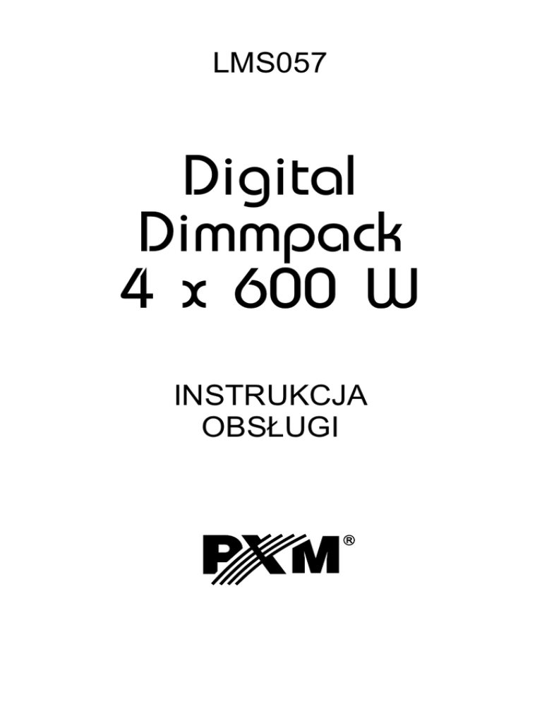 LMS057 Digital Dimmpack 4 x 600 W INSTRUKCJA OBSŁUGI R SPIS TREŚCI 1. Opis ogólny........................................................................................................1 2. Warunki bezpieczeństwa................................................................................... 1 3. Opis złączy i elementów sterowania................................................................. 2 4. Podłączenie sygnału DMX................................................................................ 3 5. Oznaczenia wyświetlanych komunikatów..........................................................3 6. Programowanie urządzenia...............................................................................3 7. Parametry programowalne................................................................................ 4 7.1. Parametry grupowe............................................................................4 7.2. Parametry indywidualne.....................................................................5 7.3. Programowanie scen i chaserów....................................................... 5 8. Wymiary bloku................................................................................................... 5 9. Specyfikacja techniczna.................................................................................... 5 10. Schemat menu ściemniacza............................................................................. 6 11. Deklaracja zgodności........................................................................................ 7 Producent zastrzega sobie możliwość wprowadzania zmian w funkcjonowaniu i obsłudze ściemniacza, mających na celu ulepszenie wyrobu. PXM s.c. tel.: (0 12) 626 46 92 ul. Przemysłowa 12 fax: (0 12) 626 46 94 E-mail: [email protected] 30-701 Kraków Internet: www.pxm.pl 1. OPIS OGÓLNY LMS057 jest cyfrowym ściemniaczem klasy AC o mocy 4 x 600 W przeznaczonym do montażu na szynie w rozdzielniach elektrycznych. Jest zasilany z jednej fazy. Umożliwia kontrolowanie czterech obwodów o obciążeniu 0,6 kW każdy. Zaawansowana elektronika pozwala na dowolne adresowanie każdego kanału, wybór charakterystyki sterowania (liniowa, liniowa odwrotna, logarytmiczna, eksponencjalna, przełączana on/off, trzy charakterystyki do sterowania neonami), ACL, czyli ustawianie napięć wyjściowych w zakresie 50 V - 230 V z dokładnością do 1 V, preheat, czyli podgrzewanie włókien żarówek ustawiane w zakresie 0 - 10 % oraz wybranie sposobu reakcji ściemniacza na zanik sygnału DMX (wyłączony, załączony na 100 %, powolne wyłączanie, ostatnio sterowana wartość, jedna z trzech scen lub jeden z dwu chaserów). Wbudowane układy "soft-start", "soft-on" i "even-off" zapewniają niezawodną pracę w najbardziej ekstremalnych warunkach. Bezpośrednia detekcja zera sieci gwarantuje wysoką odporność na zakłócenia. Moduł zaopatrzony jest w wejście sterujące w standardzie DMX-512. Obudowa do montażu szynowego o szerokości 150 mm. 2. WARUNKI BEZPIECZEŃSTWA Ściemniacz LMS057 jest urządzeniem zasilanym bezpośrednio z sieci energetycznej 230 V. Nieprzestrzeganie zasad bezpieczeństwa może grozić porażeniem i stanowić zagrożenie dla życia. W związku z tym, należy bezwzględnie stosować się do reguł przedstawionych poniżej: 1. Instalacja urządzenia, a w szczególności podłączenie zasilania powinno być wykonane przez osobę posiadającą odpowiednie uprawnienia, zgodnie z opisem w instrukcji. 2. Urządzenie może być podłączone wyłącznie do instalacji 3-żyłowej (osobny przewód ochronny). 3. Należy chronić wszystkie przewody przed uszkodzeniami mechanicznymi i termicznymi. 4. W przypadku uszkodzenia któregokolwiek z przewodów należy zastąpić go przewodem o takich samych danych technicznych i atestach. 5. Do podłączania urządzeń do ściemniacza stosować wyłącznie przewody 3-żyłowe o przekroju nie mniejszym niż 1,5 mm. 6. Ściemniacz może być instalowany wyłącznie w zamykanych rozdzielniach elektrycznych uniemożliwiających dostęp do niego osobom nie posiadającym uprawnień do obsługi urządzeń zasilanych napięciem 230 V. 7. Po wykonaniu instalacji sprawdzić skuteczność zerowania wszystkich sterowanych urządzeń. 8. Wszelkie naprawy, łącznie z wymianą bezpiecznika, mogą być wykonywane wyłącznie przy odłączonym zasilaniu. 9. Należy bezwzględnie chronić ściemniacz przed kontaktem z wodą i innymi płynami. 10. Unikać gwałtownych wstrząsów, a w szczególności upadków. 11. Nie wolno podłączać do zasilania ściemniacza z widocznymi uszkodzeniami mechanicznymi. 12. Nie włączać urządzeniach w pomieszczeniach o wilgotności powyżej 90%. 13. Urządzenia nie należy używać w pomieszczeniach o temperaturze niższej niż +2oC lub wyższej niż +40oC. 1 UWAGA!!! 1. Niewłaściwe podłączenie przewodu ochronnego grozi porażeniem. 2. Niewłaściwe podłączenie przewodu neutralnego spowoduje wadliwe działanie ściemniacza. 3. Ściemniacz może regulować wyłącznie obwody (obciążenia) o charakterze rezystancyjnym lub indukcyjnym. Ściemniacza nie wolno stosować do regulacji transformatorów elektronicznych, elektronicznych stateczników świetlówek i innych urządzeń zawierających układy elektroniczne, chyba, że ich producent wyraźnie zaznaczy taką możliwość. 3. OPIS ZŁĄCZY I ELEMENTÓW STEROWANIA Wejście DMX-512 RADIATOR (połączony wewnętrznie z pinem PE złącza mocy) DMX DMX + GND Kontrolka obecności sygnału DMX + DMX DIGITAL DIMMPACK CANCEL PREV Złącze wejścia sygnału sterującego DMX NEXT ENTER 4 x 600W ! WARNING ! 230 V SHOCK RISK 4xFUSE 3.15A fast FUSE Blok sterujący 315mA OUTPUT 230V AC L4 L3 L2 L1 N L PE Kontrolki obecności sygnałów wyjściowych L1-L4 Bezpieczniki wyjściowe 4 x 3.15A szybkie ZŁĄCZE WYJŚCIOWE MOCY PE uziemienie ochronne L wejście fazy sieciowej (gorący punkt) N zero sieci L1 L2 L3 L4 Bezpiecznik sterowan