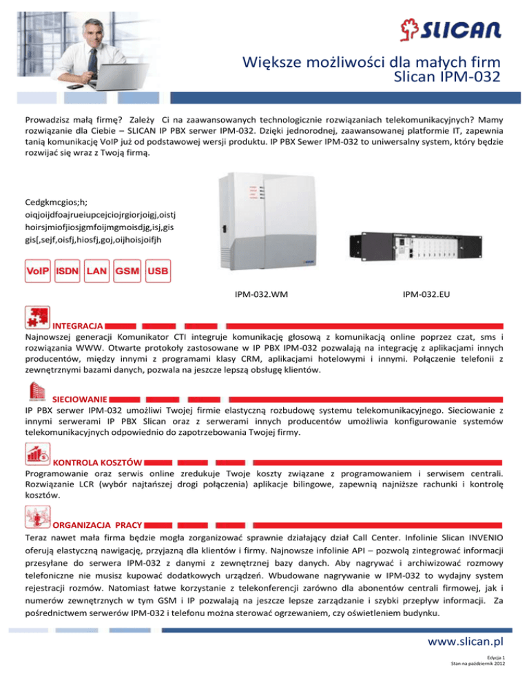 Większe możliwości dla małych firm Slican IPM-032 Prowadzisz małą firmę? Zależy Ci na zaawansowanych technologicznie rozwiązaniach telekomunikacyjnych? Mamy rozwiązanie dla Ciebie – SLICAN IP PBX serwer IPM-032. Dzięki jednorodnej, zaawansowanej platformie IT, zapewnia tanią komunikację VoIP już od podstawowej wersji produktu. IP PBX Sewer IPM-032 to uniwersalny system, który będzie rozwijać się wraz z Twoją firmą. Cedgkmcgios;h; oiqjoijdfoajrueiupcejciojrgiorjoigj,oistj hoirsjmiofjiosjgmfoijmgmoisdjg,isj,gis gis[,sejf,oisfj,hiosfj,goj,oijhoisjoifjh IPM-032.WM IPM-032.EU INTEGRACJA Najnowszej generacji Komunikator CTI integruje komunikację głosową z komunikacją online poprzez czat, sms i rozwiązania WWW. Otwarte protokoły zastosowane w IP PBX IPM-032 pozwalają na integrację z aplikacjami innych producentów, między innymi z programami klasy CRM, aplikacjami hotelowymi i innymi. Połączenie telefonii z zewnętrznymi bazami danych, pozwala na jeszcze lepszą obsługę klientów. SIECIOWANIE IP PBX serwer IPM-032 umożliwi Twojej firmie elastyczną rozbudowę systemu telekomunikacyjnego. Sieciowanie z innymi serwerami IP PBX Slican oraz z serwerami innych producentów umożliwia konfigurowanie systemów telekomunikacyjnych odpowiednio do zapotrzebowania Twojej firmy. KONTROLA KOSZTÓW Programowanie oraz serwis online zredukuje Twoje koszty związane z programowaniem i serwisem centrali. Rozwiązanie LCR (wybór najtańszej drogi połączenia) aplikacje bilingowe, zapewnią najniższe rachunki i kontrolę kosztów. ORGANIZACJA PRACY Teraz nawet mała firma będzie mogła zorganizować sprawnie działający dział Call Center. Infolinie Slican INVENIO oferują elastyczną nawigację, przyjazną dla klientów i firmy. Najnowsze infolinie API – pozwolą zintegrować informacji przesyłane do serwera IPM-032 z danymi z zewnętrznej bazy danych. Aby nagrywać i archiwizować rozmowy telefoniczne nie musisz kupować dodatkowych urządzeń. Wbudowane nagrywanie w IPM-032 to wydajny system rejestracji rozmów. Natomiast łatwe korzystanie z telekonferencji zarówno dla abonentów centrali firmowej, jak i numerów zewnętrznych w tym GSM i IP pozwalają na jeszcze lepsze zarządzanie i szybki przepływ informacji. Za pośrednictwem serwerów IPM-032 i telefonu można sterować ogrzewaniem, czy oświetleniem budynku. www.slican.pl Edycja 1 Stan na październik 2012 Większe możliwości dla małych firm Slican IPM-032 SERWER IPM-032.WM.A 24 12 12 1 64 ??? ??? 12 124 32 ??? 1 SERWER SERWER SERWER IPM-032.WM.L IPM-032.2U.A IPM-032.2U.L Porty analogowe AB 24 32 32 Linie miejskie POTS 12 16 16 ISDN BRA (wew. lub zewn.) 12 16 16 E 1/ ISDN PRA (wew. lub zewn.) --1 --Kanały VoIP 4 64 4 Translacje VoIP ??? ??? ??? Maksymalna pojemność Abonenci VoIP ??? ??? ??? Linie GSM 12 16 16 Porty systemowe CTS Up0 / IP 124 / 8 124 124 / 8 Kanały nagrywania rozmów 12 32 12 Dysk HDD ??? ??? ??? Karty pamięci SD 1 1 1 telefony systemowe Slican CTS Up0 / IP telefony Slican SIP VPS-2000P / 310P telefon Slican XL-2023ID telefon beztarczowy Slican HLP-22 Urządzenia współpracujące bramofony Slican DPH Multi Switch Box (MSB-1102) Multi Audio Box (MAB-1101) telefony systemowe Slican CTS Up0 / IP telefony Slican SIP VPS-2000P/ 310P pakiet aplikacji Slican CTI Aplikacje wspomagające pracę IPx Slican BillingMAN / BillingMAN.plus Slican RecordMAN.server / RecordMAN.client Obsługiwane protokoły ESSL, SIP 2.0 oraz kodeki: G.711, G.729 (opcja) Parametry VoIP Obsługiwani klienci VoIP do 100 urządzeń VoIP-SIP Tryb pracy Klient lub / i serwer VoIP ~110-230V;50-60 ~110-230V;50-60 ~110-230V;50-60 ~110-230V;50-60 Zasilanie Hz; < 150 VA Hz; < 150 VA Hz; < 150 VA Hz; < 150 VA Zasilanie buforowe opcja opcja PROTOKOŁY Protokoły komunikacji głosowej POTS / ISDN-EDSS1 / QSIG / SIP 2.0 / GSM900 / 1800 / Up0 Protokoły komunikacji z serwerem CTIP / HOTELP / TAPI / EbdRECP / HTTP / XML CECHY I ZALETY współpraca z telefonami systemowymi Slican Upo, IP i SIP współpraca z Komunikatorem Slican CTI- aplikacje do pracy stacjonarnej i mobilnej otwarte protokoły (HTTP / EbdRECP / TAPI / HOTELP / XML / CTIP) telefonia internetowa VoIP zaawansowane zarządzanie i kontrola kosztów zintegrowany GSM sieciowanie po LAN / WAN zintegrowane nagrywanie rozmów sterowanie urządzeniami zewnętrznymi obudowa naścienna i RACK www.slican.pl Edycja 1 Stan na październik 2012