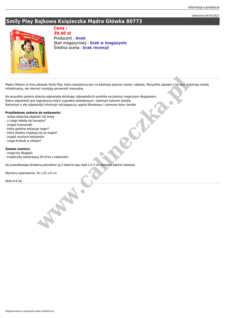Informacje o produkcie Utworzono 04-03-2017 Smily Play Bajkowa Książeczka Mądra Główka 80773 Cena : 39,40 zł Producent : Anek Stan magazynowy : brak w magazynie Średnia ocena : brak recenzji pl Mądra Główka to linia zabawek Smily Play, która nastawiona jest na edukację poprzez naukę i zabawę. Wszystkie zabawki z tej serii wspierają rozwój intelektualny, ale również rozwijają sprawność manualną. ec Zestaw zawiera: - magiczny długopis - książeczkę zawierającą 30 stron z zadaniami. in Przykładowe zadania do wykonania: - wskaż właściwą objętość lub masę - z czego składa się kanapka? - znajdź krasnoludki - którą godzinę wskazuje zegar? - które obiekty znajdują się na mapie? - znajdź ukrytych bohaterów - czego brakuje w sklepie? zk a. Na wszystkie pytania dziecko odpowiada dotykając odpowiednich punktów na planszy magicznym długopisem. Dobra odpowiedź jest nagrodzona miłym sygnałem dźwiękowym i zielonym kolorem światła. Natomiast o złej odpowiedzi informuje ostrzegawczy sygnał dźwiękowy i czerwony kolor światła. Wymiary opakowania: 24 x 25 x 6 cm w w w Wiek 4-6 lat. .c al Do prawidłowego działania potrzebne są 2 baterie typu AAA 1,5 V (w zestawie baterie testowe) Wygenerowano w programie www.oscGold.com