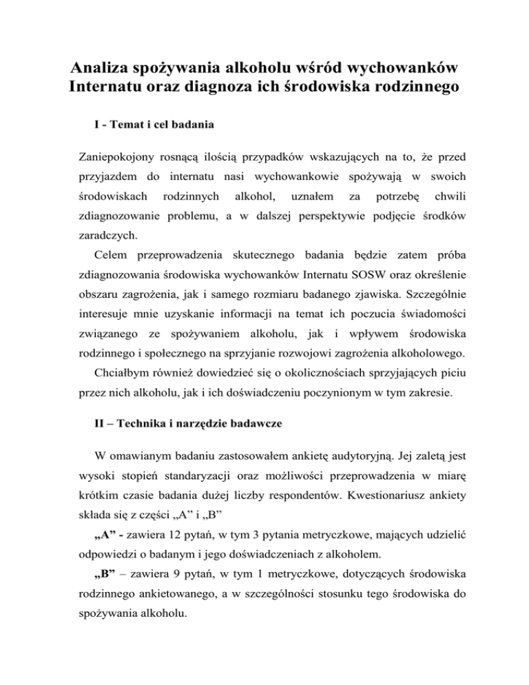 analiza spożywania alkoholu wśród wychowanków internatu oraz