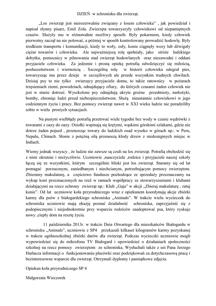 DZIEŃ w schronisku dla zwierząt. „Los zwierząt jest nierozerwalnie związany z losem człowieka” , jak powiedział i napisał słynny pisarz, Emil Zola. Zwierzęta towarzyszyły człowiekowi od niepamiętnych czasów. Służyły mu w różnorodnie możliwy sposób. Były pokarmem, kiedy człowiek pierwotny zaczął na nie polować, a później w sposób kontrolowany prowadzić hodowlę. Były środkiem transportu i komunikacji, kiedy to woły, osły, konie ciągnęły wozy lub dźwigały ciężar towarów i człowieka. Ale najważniejszą rolę spełniały, jako stróże ludzkiego dobytku, pomocnicy w pilnowaniu stad zwierząt hodowlanych oraz niezawodni i oddani przyjaciele człowieka. Za jedzenie i prostą opiekę potrafią odwdzięczyć się miłością, posłuszeństwem i wiernością . Szczególną rolę w historii człowieka odegrał pies, towarzysząc mu przez dzieje w szczęśliwych ale przede wszystkim trudnych chwilach. Dzisiaj psy to nie tylko zwierzęcy przyjaciele domu, to także ratownicy w pożarach trzęsieniach ziemi, powodziach, odnajdujący ofiary, do których czasami żaden człowiek nie jest w stanie dotrzeć. Wyszkolone psy odnajdują ukryte groźne przedmioty, narkotyki, bomby, chroniąc ludzi przed niebezpieczeństwem. Służą nieustannie człowiekowi w jego codziennym życiu i pracy. Bez pomocy zwierząt nawet w XXI wieku ludzie nie poradziliby sobie w wielu prostych sytuacjach. Na pustyni wielbłądy potrafią przetrwać wiele tygodni bez wody w czasie wędrówki z towarami z oazy do oazy. Osiołki wspinają się krętymi, wąskimi górskimi szlakami, gdzie nie dotrze żaden pojazd , przenosząc towary do ludzkich osad wysoko w górach np.: w Peru, Nepalu, Chinach. Słonie z potężną siłą przenoszą kłody drzew z niedostępnych miejsc w Indiach. Wiemy jednak wszyscy , że ludzie nie zawsze są czuli na los zwierząt. Potrafią obchodzić się z nimi okrutnie i nieżyczliwie. Uczniowie ,nauczyciele ,rodzice i przyjaciele naszej szkoły łączą się ze wszystkimi, którym szczególnie bliski jest los zwierząt. Staramy się od lat pomagać porzuconym, zaniedbanym i niechcianym, potrzebującym pomocy zwierzętom. Zbieramy makulaturę, a częściowo fundusze pochodzące ze sprzedaży przeznaczamy na wykup koni przeznaczonych na rzeź w ramach współpracy ze stowarzyszeniami i klubami działającymi na rzecz ochrony zwierząt np.: Klub „Gaja” w akcji „Zbieraj makulaturę , ratuj konie”. Od lat uczniowie koła przyrodniczego wraz z opiekunem koordynują akcje zbiórki karmy dla psów z białogardzkiego schroniska „Animals”. W trakcie wielu wycieczek do schroniska uczniowie mają okazję poznać działalność schroniska, zaprzyjaźnić się z podopiecznymi i niejednokrotnie przy wsparciu rodziców zaadoptować psa, który zyskuje nowy ,ciepły dom na resztę życia. 11 października 2013r. w trakcie Dnia Otwartego dla mieszkańców Białogardu w schronisku „Animals”, uczniowie z SP4 przekazali kilkaset kilogramów karmy pozyskanej w trakcie ogólnoszkolnej zbiórki darów dla zwierząt. Podczas wycieczki uczniowie mogli wypowiedzieć się do mikrofonu TV Białogard i opowiedzieć o działaniach społeczności szkolnej na rzecz pomocy zwierzętom ze schroniska. Wysłuchali także z ust Pana Jerzego Harłacza informacji o funkcjonowaniu placówki oraz podziękowań za dotychczasową pracę i bezinteresowne wsparcie dla zwierząt. Otrzymali dyplomy i pamiątkowe zdjęcia. Opiekun koła przyrodniczego SP 4 Małgorzata Wieczorek