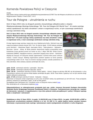 Komenda Powiatowa Policji w Cieszynie Źródło: http://www.cieszyn.slaska.policja.gov.pl/ka6/informacje/wiadomosci/17007,Tour-de-Pologne-utrudnienia-w-ruchu.html Wygenerowano: Sobota, 4 marca 2017, 14:17 Tour de Pologne - utrudnienia w ruchu Dziś 12 lipca 2012 roku na drogach powiatu cieszyńskiego odbędzie jeden z etapów Międzynarodowego Wyścigu Kolarskiego “69. Tour de Pologne UCI World Tour”. W czasie wyścigu należy spodziewać się wielu utrudnień i zmian w organizacji ruchu, w tym czasowego zamknięcia szeregu odcinków dróg. Dziś 12 lipca 2012 roku na drogach powiatu cieszyńskiego odbędzie jeden z etapów Międzynarodowego Wyścigu Kolarskiego “69. Tour de Pologne UCI World Tour”. W czasie wyścigu należy spodziewać się wielu utrudnień i zmian w organizacji ruchu, w tym czasowego zamknięcia szeregu odcinków dróg. III etap tegorocznego wyścigu rozpocznie się w Kędzierzynie Koźlu. Odcinek trasy jaki mają do przebycia kolarze wynosi 201,7 km. Po starcie (godz. 13:43) kolarze przejadą przez Racibórz – Wodzisław Śląski –Jastrzębie Zdrój – Zebrzydowice – Dębowiec – Skoczów– Ustroń – Wisłę. W Wiśle peleton dwukrotnie będzie przejeżdżał przez Kubalonkę (trasa górskiej premii od ronda na ulicy 1 Maja: DW 942- Wisła CzarneKubalonka–DW941). Następnie kolarze z powrotem pojadą przez Ustroń – Goleszów i dojadą do Cieszyna. W Cieszynie zostały zaplanowane 3 premie lotne przez centrum miasta i Czeski Cieszyn. Według organizatora peleton wjedzie na teren powiatu cieszyńskiego około 15.34. Trasa na terenie naszego powiatu została podzielona na kilka odcinków, które zostaną czasowo zamknięte dla ruchu. godz. 15.25 - zamknięcie odcinka I Jastrzębie - Skoczów, godz..15.40 – zamknięcie odcinka II Skoczów- Ustroń, godz. 16.10 – zamknięcie odcinka III Ustroń- Wisła (pętla) – Ustroń. Droga na odcinku DW 941 od skrzyżowania z ulicą Cieszyńską w Ustroniu do centrum Wisły będzie zamknięta do godz. 18.00. Przez blisko 2 godziny ruch na tym odcinku drogi będzie całkowicie wstrzymany. godz. 17.20 zamknięcie odcinka IV Ustroń - Goleszów – Cieszyn, Natomiast w Cieszynie zmian organizacji w ruchu oraz utrudnień należy się spodziewać już od 6.30 rano. Trasa przejazdu peletonu zostanie już zamknięta o godz. 15.00 na kilka godzin. Szczegółowy plan zamknięcia ulic i utrudnień ruchu w Cieszynie można znaleźć tutaj. Plan zamknięcia ulic w Skoczowie znajdziesz tutaj. Odpowiedzialnym za zabezpieczenie przejazdu jest asp. sztab. Ireneusz Korzonek Zastępca Naczelnika Wydziału Ruchu Drogowego Komendy Powiatowej Policji w Cieszynie. Funkcjonariusze zwracają się z apelem do kierowców i pieszych o respektowanie w tym dniu poleceń służb porządkowych i policji. Policjanci apelują także o cierpliwość i ostrożność! Dodatkowo w dniu 12 lipca 2012r. (w godz. 12.00/20.00) oraz 13 lipca 2012r. (w godz. 10.00/18.00) w KWP w Katowicach uruchomiona zostanie infolinia o nr tel. 32 200 11 11, gdzie będzie można uzyskać bieżące informacje o wyznaczonej trasie wyścigu i planowanym czasie występowania utrudnień w ruchu drogowym. Ocena: 0/5 (0) Tweetnij