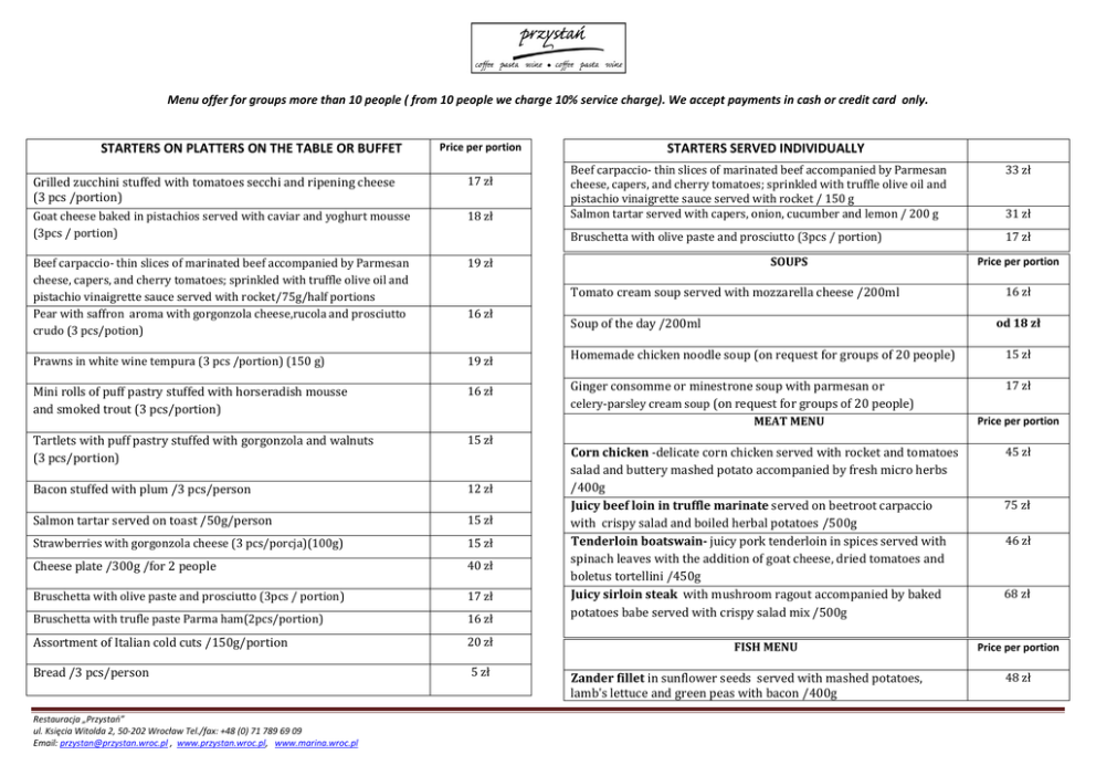 Menu offer for groups more than 10 people ( from 10 people we charge 10% service charge). We accept payments in cash or credit card only. STARTERS ON PLATTERS ON THE TABLE OR BUFFET Price per portion Grilled zucchini stuffed with tomatoes secchi and ripening cheese (3 pcs /portion) Goat cheese baked in pistachios served with caviar and yoghurt mousse (3pcs / portion) 17 zł Beef carpaccio- thin slices of marinated beef accompanied by Parmesan cheese, capers, and cherry tomatoes; sprinkled with truffle olive oil and pistachio vinaigrette sauce served with rocket/75g/half portions Pear with saffron aroma with gorgonzola cheese,rucola and prosciutto crudo (3 pcs/potion) 19 zł Prawns in white wine tempura (3 pcs /portion) (150 g) 19 zł Mini rolls of puff pastry stuffed with horseradish mousse and smoked trout (3 pcs/portion) 16 zł Tartlets with puff pastry stuffed with gorgonzola and walnuts (3 pcs/portion) 15 zł Bacon stuffed with plum /3 pcs/person 12 zł Salmon tartar served on toast /50g/person 15 zł Strawberries with gorgonzola cheese (3 pcs/porcja)(100g) 15 zł Cheese plate /300g /for 2 people 40 zł Bruschetta with olive paste and prosciutto (3pcs / portion) 17 zł Bruschetta with trufle paste Parma ham(2pcs/portion) 16 zł Assortment of Italian cold cuts /150g/portion 20 zł Bread /3 pcs/person 5 zł Restauracja „Przystań” ul. Księcia Witolda 2, 50-202 Wrocław Tel./fax: +48 (0) 71 789 69 09 Email: [email protected] , www.przystan.wroc.pl, www.marina.wroc.pl 18 zł STARTERS SERVED INDIVIDUALLY Beef carpaccio- thin slices of marinated beef accompanied by Parmesan cheese, capers, and cherry tomatoes; sprinkled with truffle olive oil and pistachio vinaigrette sauce served with rocket / 150 g Salmon tartar served with capers, onion, cucumber and lemon / 200 g 33 zł Bruschetta with olive paste and prosciutto (3pcs / portion) 17 zł SOUPS Tomato cream soup served with mozzarella cheese /200ml 16 zł 31 zł Price per portion 16 zł od 18 zł Soup of the day /200ml Homemade chicken noodle soup (on request for groups of 20 people) 15 zł Ginger consomme or minestrone soup with parmesan or celery-parsley cream soup (on request for groups of 20 people) MEAT MENU 17 zł Corn chicken -delicate corn chicken served with rocket and tomatoes salad and buttery mashed potato accompanied by fresh micro herbs /400g Juicy beef loin in truffle marinate served on beetroot carpaccio with crispy salad and boiled herbal potatoes /500g Tenderloin boatswain- juicy pork tenderloin in spices served with spinach leaves with the addition of goat cheese, dried tomatoes and boletus tortellini /450g Juicy sirloin steak with mushroom ragout accompanied by baked potatoes babe served with crispy salad mix /500g FISH MENU Zander fillet in sunflower seeds served with mashed potatoes, lamb's lettuce and green peas with bacon /400g Price per portion 45 zł 75 zł 46 zł 68 zł Price per portion 48 zł Menu offer for groups more than 10 people ( from 10 people we charge 10% service charge). We accept payments in cash or credit card only. DESSERTS Salmon steak in puff pastry served on a sugar snap and mango chutney /400g 47 zł Prawns in african birdseye chili pepper -Black Tiger prawns in a spicy wine-cream sauce with fresh vegetables, piri piri peppers and saffron basmati rice /400g 50 zł VEGETARIAN MENU Price per portion Tagliatelle pasta in a mellow-flavoured porcini mushroom sauce with an aromatic truffle accent /350g 33 zł Rocket and tomatoes salad- fresh rocket, home- made vinaigrette, 26 zł Ice cream-two scoops of vanilla ice-cream with whipped cream and seasonal fruits 20 zł Tiramisu or Creme brulee 16 zł Hot raspberries with ginger served with vanilla ice cream 16 zł Homemade cake- day offer 15 zł MENU FOR KIDS tomatoes and green olives topped with Grana Padano cheese / 350g SALADS Price per portion Chicken salad-juicy salad mix served with grilled chicken in delicious honey mustard sauce, with roasted Pine nuts, tomatoes, and breadsticks (grissini) sprinkled with croutons /350g 30 zł “Capitain” salad -grilled beef loin sticks served on fresh crispy salad with taleggio cheese, tomatoes, cucumber,roasted Pine nuts and yoghurt sauce 35 zł Liver salad- A variety of crispy salads served with chicken liver, pieces of apples, orange and avocado, sprinkled with shaved Parmesan /400g 30 zł Price per portion Juicy roasted chicken breast served with golden french fries /200g 20 zł Pasta in lightly seasoned tomato sauce /200g 15 zł DRINKS Amount Price Fruit juice 1 jar- 1 l 20 zł Mineral water – sparkling/non-sparkling 1 jar- 1 l 16 zł 1 caraf (0,5l) 40 zł CAVA sparkling semidry wine 1bottle/10 people 50 zł Prosecco ZONIN –white dry wine 1bottle/10 people 80 zł LAMBRUSCO DOLCE -lightly sparkling wine-red sweet 1bottle/10 people 50 zł 0,7 l/0,5 l 125 zł /110 zł Cake diameter 26 cm/12 people 180 zł House wine Vodka Wyborowa or Finlandia BIRTHDAY CAKE Restauracja „Przystań” ul. Księcia Witolda 2, 50-202 Wrocław Tel./fax: +48 (0) 71 789 69 09 Email: [email protected] , www.przystan.wroc.pl, www.marina.wroc.pl Price per portion Menu offer for groups more than 10 people ( from 10 people we charge 10% service charge). We accept payments in cash or credit card only. Fish menu 1. Zander fillets 150 g 2. Salmon steak 150 g DISHES SERVED ON PLATTERS 27 zł 28 zł Meat menu 1. Pork medallions with mushroom sauce 150 g 29 zł 2. Chicken roulade with soft cheese and pistachio nuts 150g 29 zł Beef tenderloin marinated in red wine in pepper sauce (180 g – 3 szt) 43 zł Additions Grilled potatoes, rice, french fries, gnocchi (100g) 9 zł Blanched vegetables 9 zł Insalata mista 15 zł Fresh polish salads 10 zł Restauracja „Przystań” ul. Księcia Witolda 2, 50-202 Wrocław Tel./fax: +48 (0) 71 789 69 09 Email: [email protected] , www.przystan.wroc.pl, www.marina.wroc.pl