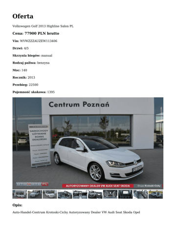 Oferta Volkswagen Golf 2013 Highline Salon PL Cena: 77900 PLN brutto Vin: WVWZZZAUZEW113406 Drzwi: 4/5 Skrzynia biegów: manual Rodzaj paliwa: benzyna Moc: 140 Rocznik: 2013 Przebieg: 22500 Pojemność skokowa: 1395 Opis: Auto-Handel-Centrum Krotoski-Cichy Autoryzowany Dealer VW Audi Seat Skoda Opel Oferujemy gwarancję na ten samochód. MOŻLIWOŚĆ SPRAWDZENIA POJAZDU W AUTORYZOWANEJ STACJI OBSŁUGI -----------------------------------------------------------------------------------------------------------------------------------------------------Uwaga: Miejsce ekspozycji pojazdu - Grupa Krotoski - Cichy Salon Volkswagen ul. Głogowska/Kowalewicka 3C, 60-002 Poznań - Komorniki Osoba kontaktowa tel: Romualda Kroll 601 751 199 Maciej Oblizajek 697 700 055 Maciej Śmigielski 781 440 157 tel.: +48 61 832 72 06 MOŻLIWA JAZDA PRÓBNA PO WCZEŚNIEJSZYM UZGODNIENIU TERMINU -----------------------------------------------------------------------------------------------------------------------------------------------------Kupiony w Polskim salonie VW Silnik 1.4 TSI 140KM Volkswagen Safe+ - dodatkowe 2 lata gwarancji Wersja wyposażenia HIGHLINE Wyposażenie: ESP - system stabilizacji toru jazdy wraz z ASR, ABS, EDS, MSR, asystentem siły hamowania Autoalarm z niezależnym zasilaniem (Back-up-Horn), funkcją dozoru wnętrza i czujnikiem przechyłu Immobiliser Poduszki powietrzne (siedem): dwie czołowe, dwie boczne, dwie kurtynowe i kolanowa dla kierowcy Wspomaganie układu kierowniczego, elektromechaniczne, zależne od prędkości samochodu Komputer pokładowy "Premium" z kolorowym wyświetlaczem TFT - funkcja wyświetlania informacji z systemów asystujących, audio, nawigacji oraz telefonu Lusterka zewnętrzne, elektrycznie składane - automatycznie obniżane lusterko zewnętrzne po stronie pasażera przy włączonym biegu wstecznym - oświetlenie przestrzeni wokół pojazdu Szyby elektrycznie sterowane z przodu i z tyłu Sportowe fotele ergoActive - regulacja fotela kierowcy w 14 kierunkach - fotele przednie sportowe, podgrzewane - regulacja podparcia pod uda dla fotela kierowcy - funkcja masażu dla fotela kierowcy z elektryczną regulacją podparcia odcinka lędźwiowego kręgosłupa - szuflada pod fotelem pasażera - tapicerka siedzeń "New York" / z elementami skóry "Vienna" Centralny zamek Dach szklany, panoramiczny - elektrycznie sterowany, uchylany i przesuwany Klimatyzacja z regulacją automatyczną "Climatronic" System nawigacji satelitarnej "Discover Media" - obsługa za pośrednictwem 5,8-calowego, kolorowego ekranu dotykowego z czujnikiem zbliżeniowym - radio z odtwarzaczem CD, MP3, WMA - czytnik kart SD x 2 - 8 głośników - instalacja telefoniczna (bluetooth) - Mapa Europy z 3 letnią, bezpłatną aktualizacją - Złącze multimedialne Media in (do podłączenia urządzeń typu iPod System "Rear Assist" - kamera cofania System ?Park Pilot? - czujniki parkowania z przodu i z tyłu z wizualizacją odległości na ekranie radia Reflektory bi-ksenonowe Top ze światłami do jazdy dziennej w technologii LED - spryskiwacze reflektorów - kontrolka poziomu płynu spryskiwaczy - dynamiczna regulacja zasięgu - dynamiczne i statyczne doświetlanie zakrętów Pakiet "Czujnik deszczu" - czujnik deszczu - automatycznie przyciemniane lusterko wsteczne - funkcja świateł - Coming / Leaving Home - czujnik zmierzchu - funkcja automatycznego włączania świateł Szyba tylna oraz boczne tylne dodatkowo przyciemniane Obręcze aluminiowe "Durban" - 4 obręcze ze stopu metali lekkich 7,5J x 18 - opony 225/40 R 18 - sportowe zawieszenie - dojazdowe koło zapasowe - śruby kół z zabezpieczeniem antykradzieżowym "Thatcham" Kierownica 3-ramienna, multifunkcyjna, obszyta skórą Tempomat Komputer pokładowy "Plus" z monochromatycznym wyświetlaczem TFT - funkcja wyświetlania informacji z systemów asystujacych,audio, nawigacji, oraz telefonu i inne -----------------------------------------------------------------------------------------------------------------------------------------------------Oferujemy kompleksową obsługę sprzedaży ratalnej na bardzo dogodnych warunkach - w celu bliższego zapoznania się z aktualną ofertą finansowania prosimy o kontakt : Maciej Oblizajek 697-700-055. Oferujemy ubezpieczenia samochodowe z wiodących na rynku ubezpieczalni - możliwość zakupu pakietu ubezpieczeniowego na miejscu. Oferujemy możliwość jazdy próbnej przed zakupem oraz usługę inspekcji pojazdu w autoryzowanym serwisie Skoda. Przyjmujemy również w rozliczeniu każdy pojazd. -----------------------------------------------------------------------------------------------------------------------------------------------------Godziny otwarcia: pon - pt 9.00 - 19.00 sob 9.00 - 14.00 Uwaga: Miejsce ekspozycji pojazdu - Grupa Krotoski - Cichy Salon Volkswagen ul. Głogowska/Kowalewicka 3C, 60-002 Poznań - Komorniki Osoba kontaktowa tel: Romualda Kroll 601 751 199 Maciej Oblizajek 697 700 055 Maciej Śmigielski 781 440 157 tel.: +48 61 832 72 06 -----------------------------------------------------------------------------------------------------------------------------------------------------Ogłoszenie ma charakter informacyjny i stanowi zaproszenie do zawarcia umowy (art. 71 Kodeksu cywilnego); nie stanowi natomiast oferty handlowej w rozumieniu art. 66 § 1 Kodeksu cywilnego. W celu sprawdzenia zgodności oferty oraz uzyskania wszelkich informacji prosimy kontaktować się z handlowcem d.s. samochodów używanych Auto możesz zobaczyć: ul. Głogowska/Kowalewicka 3 60-002 Poznań tel: 61 832 72 05 Maciej Śmigielski GSM: 781-440-157 e-mail: [email protected] Romualda Kroll GSM: 601-751-199 e-mail: [email protected] Maciej Oblizajek GSM: 697-700-055 e-mail: [email protected]