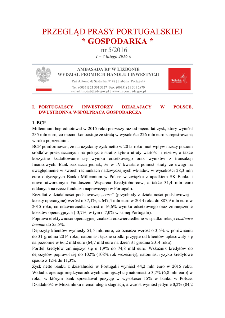 PRZEGLĄD PRASY PORTUGALSKIEJ * GOSPODARKA * nr 5/2016 1 – 7 lutego 2016 r. AMBASADA RP W LIZBONIE WYDZIAŁ PROMOCJI HANDLU I INWESTYCJI Rua António de Saldanha Nº 48 | Lizbona | Portugalia Tel. (00351) 21 301 3327 | Fax. (00351) 21 301 2870 e-mail: [email protected] | www.lisbon.trade.gov.pl I. PORTUGALSCY INWESTORZY DZIAŁAJĄCY DWUSTRONNA WSPÓŁPRACA GOSPODARCZA W POLSCE, 1. BCP Millennium bcp odnotował w 2015 roku pierwszy raz od pięciu lat zysk, który wyniósł 235 mln euro, co mocno kontrastuje ze stratą w wysokości 226 mln euro zarejestrowaną w roku poprzednim. BCP poinformował, że na uzyskany zysk netto w 2015 roku miał wpływ niższy poziom środków przeznaczanych na pokrycie strat z tytułu utraty wartości i rezerw, a także korzystne kształtowanie się wyniku odsetkowego oraz wyników z transakcji finansowych. Bank zaznacza jednak, że w IV kwartale poniósł straty ze uwagi na uwzględnienie w swoich rachunkach nadzwyczajnych wkładów w wysokości 28,3 mln euro dotyczących Banku Millennium w Polsce w związku z upadkiem SK Banku i nowo utworzonym Funduszem Wsparcia Kredytobiorców, a także 31,4 mln euro oddanych na rzecz funduszu naprawczego w Portugalii. Rezultat z działalności podstawowej „core” (przychody z działalności podstawowej – koszty operacyjne) wzrósł o 37,1%, z 647,4 mln euro w 2014 roku do 887,9 mln euro w 2015 roku, co odzwierciedla wzrost o 16,6% wyniku odsetkowego oraz zmniejszenie kosztów operacyjnych (-3,7%, w tym o 7,0% w samej Portugalii). Poprawa efektywności operacyjnej znalazła odzwierciedlenie w spadku relacji cost/core income do 55,5%. Depozyty klientów wyniosły 51,5 mld euro, co oznacza wzrost o 3,5% w porównaniu do 31 grudnia 2014 roku, natomiast łączne środki przyjęte od klientów uplasowały się na poziomie w 66,2 mld euro (64,7 mld euro na dzień 31 grudnia 2014 roku). Portfel kredytów zmniejszył się o 1,9% do 74,8 mld euro. Wskaźnik kredytów do depozytów poprawił się do 102% (108% rok wcześniej), natomiast ryzyko kredytowe spadło z 12% do 11,3%. Zysk netto banku z działalności w Portugalii wyniósł 44,2 mln euro w 2015 roku. Wkład z operacji międzynarodowych zmniejszył się natomiast o 3,7% (6,8 mln euro) w roku, w którym bank sprzedawał pozycję w wysokości 15% w banku w Polsce. Działalność w Mozambiku niemal uległa stagnacji, a wzrost wyniósł jedynie 0,2% (84,2 PRZEGLĄD PRASY PORTUGALSKIEJ “GOSPODARKA” - nr 5/2016 mln euro), podczas gdy w Angoli wzrosła o 50,1% (75,7 mln euro) - pomimo kryzysu finansowego, jaki ten kraj doświadcza z powodu spadku cen ropy naftowej. Wynik z tytułu odsetek wyniósł 1,3 mld euro w 2015 roku, co oznacza wzrost o 16,6% w porównaniu do 1,1 mld euro w 2014 roku, głównie dzięki pozytywnym wynikom z działalności na terenie Portugalii. Wynik z tytułu prowizji wzrósł o 1,8% rdr, do 692,9 mln euro, a przychody operacyjne wzrosły o 9,2% w stosunku do poprzedniego roku, do 2,5 mld euro. Bank BCP zamknął rok 2015 wskaźnikiem kapitałowym common equity tier I phased in na poziomie 13,3% i fully implemented w wysokości 10,2%. Bank BCP ogłosił również, że zamierza w roku bieżącym w pełni spłacić obligacje CoCo bonds subskrybowane przez państwo. Bank ma czas na spłatę tych obligacje do 2017 roku, ale chce to uczynić wcześniej. BCP otrzymał w 2012 roku 3 mld euro od państwa za pośrednictwem CoCo bonds. Bank spłacił już 2250 mln euro i pozostaje zwrot 750 mln euro. Jednocześnie zarząd BPC ogłosił, że ma zamiar wprowadzić nową strategię rozwoju na najbliższe trzy lata w celu dostosowania instytucji do nowej rzeczywistości i nadzoru na rynku finansowym. Strategia ta będzie obejmować między innymi zamknięcie około stu oddziałów. W 2018 roku bank zamierza dysponować 570 oddziałami, posiadać 35% klientów z dostępem cyfrowym, 50% transakcji dokonywanych cyfrowo, osiągnąć pozycję lidera pod względem satysfakcji klienta. Ponadto bank chce osiągnąć wskaźnik kapitałowy Tier I common equity tier I fully implemented równy lub większy od 11%, wskaźnik kredytów do depozytów poniżej 100% i relację cost/income na poziomie 43%. Wskaźnik rentowności kapitału własnego powinien przekroczyć natomiast 11%, w porównaniu z obecnie 5,3%. BCP ze względu na otrzymaną pomoc państwowa nie może ubiega się o zakup Novo Banco. Prezes banku Nuno Amado potwierdził, że bank mógłby starać się o specjalną autoryzację Brukseli w tej kwestii, ale z pewnością by jej nie otrzymał, dlatego zarząd nie brał nawet tej możliwości pod uwagę. Amado podkreślił jednak, że najlepszym rozwiązaniem dla Novo Banco i całego sektora finansowego w Portugalii byłaby sprzedaż tej instytucji na rzecz podmiotu już zainstalowanego na rynku portugalskim i za odpowiednią cenę. (Diário Económico, Jornal de Negócios, Jornal I) 2. Bank Millennium Bank Millennium w Polsce osiągnął skonsolidowane przychody w wysokości 546,5 mln zł (130,7 mln euro) w 2015 roku. Liczba ta stanowi spadek o 16% w porównaniu z zyskiem netto w wysokości 651 mln zł (155,2 mln euro) uzyskanym w 2014 r. W oświadczeniu przekazanym do portugalskiej Komisji ds. Rynku Papierów Wartościowych (CMVM), BCP informuje, że roczny zysk netto wyniósłby 667,4 mln zł (159,6 mln euro), gdyby pominąć zdarzenia nadzwyczajne, które miały miejsce w IV kwartale 2015 roku. 2| PRZEGLĄD PRASY PORTUGALSKIEJ “GOSPODARKA” - nr 5/2016 W swoim oświadczeniu BCP przytacza cztery zdarzenia nadzwyczajne, który wpłynęły ujemnie na rachunki instytucji w Polsce: - wkład ekstra do Bankowego Funduszu Gwarancyjnego (BFG), w wysokości 102,5 mln zł (24,5 mln euro) z powodu upadku SK Bank, - wkład do nowo utworzonego Funduszu Wsparcia Kredytobiorców (FWK) w wysokości 15,6 mln zł (3,7 mln euro) - kara wymierzona przez Urząd Ochrony Konkurencji i Konsumentów (UOKiK) z związku z opłatami interchange w wysokości 12,2 mln zł (2,9 mln euro) o