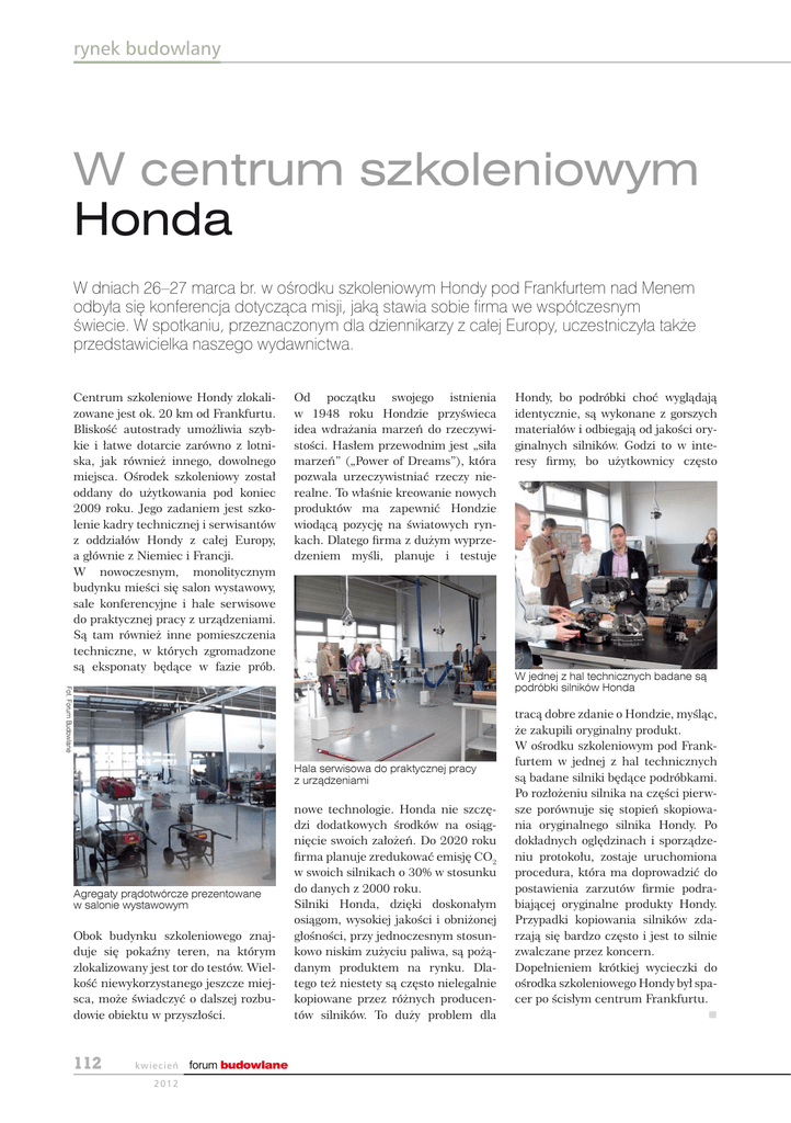 rynek budowlany W centrum szkoleniowym Honda W dniach 26–27 marca br. w ośrodku szkoleniowym Hondy pod Frankfurtem nad Menem odbyła się konferencja dotycząca misji, jaką stawia sobie firma we współczesnym świecie. W spotkaniu, przeznaczonym dla dziennikarzy z całej Europy, uczestniczyła także przedstawicielka naszego wydawnictwa. Centrum szkoleniowe Hondy zlokalizowane jest ok. 20 km od Frankfurtu. Bliskość autostrady umożliwia szybkie i łatwe dotarcie zarówno z lotniska, jak również innego, dowolnego miejsca. Ośrodek szkoleniowy został oddany do użytkowania pod koniec 2009 roku. Jego zadaniem jest szkolenie kadry technicznej i serwisantów z oddziałów Hondy z całej Europy, a głównie z Niemiec i Francji. W nowoczesnym, monolitycznym budynku mieści się salon wystawowy, sale konferencyjne i hale serwisowe do praktycznej pracy z urządzeniami. Są tam również inne pomieszczenia techniczne, w których zgromadzone są eksponaty będące w fazie prób. Od początku swojego istnienia w 1948 roku Hondzie przyświeca idea wdrażania marzeń do rzeczywistości. Hasłem przewodnim jest „siła marzeń” („Power of Dreams”), która pozwala urzeczywistniać rzeczy nierealne. To właśnie kreowanie nowych produktów ma zapewnić Hondzie wiodącą pozycję na światowych rynkach. Dlatego firma z dużym wyprzedzeniem myśli, planuje i testuje Fot. Forum Budowlane W jednej z hal technicznych badane są podróbki silników Honda Hala serwisowa do praktycznej pracy z urządzeniami Agregaty prądotwórcze prezentowane w salonie wystawowym Obok budynku szkoleniowego znajduje się pokaźny teren, na którym zlokalizowany jest tor do testów. Wielkość niewykorzystanego jeszcze miejsca, może świadczyć o dalszej rozbudowie obiektu w przyszłości. 112 k w i ec i e ń 2 01 2 forum budowlane Hondy, bo podróbki choć wyglądają identycznie, są wykonane z gorszych materiałów i odbiegają od jakości oryginalnych silników. Godzi to w interesy firmy, bo użytkownicy często nowe technologie. Honda nie szczędzi dodatkowych środków na osiągnięcie swoich założeń. Do 2020 roku firma planuje zredukować emisję CO2 w swoich silnikach o 30% w stosunku do danych z 2000 roku. Silniki Honda, dzięki doskonałym osiągom, wysokiej jakości i obniżonej głośności, przy jednoczesnym stosunkowo niskim zużyciu paliwa, są pożądanym produktem na rynku. Dlatego też niestety są często nielegalnie kopiowane przez różnych producentów silników. To duży problem dla tracą dobre zdanie o Hondzie, myśląc, że zakupili oryginalny produkt. W ośrodku szkoleniowym pod Frankfurtem w jednej z hal technicznych są badane silniki będące podróbkami. Po rozłożeniu silnika na części pierwsze porównuje się stopień skopiowania oryginalnego silnika Hondy. Po dokładnych oględzinach i sporządzeniu protokołu, zostaje uruchomiona procedura, która ma doprowadzić do postawienia zarzutów firmie podrabiającej oryginalne produkty Hondy. Przypadki kopiowania silników zdarzają się bardzo często i jest to silnie zwalczane przez koncern. Dopełnieniem krótkiej wycieczki do ośrodka szkoleniowego Hondy był spacer po ścisłym centrum Frankfurtu.