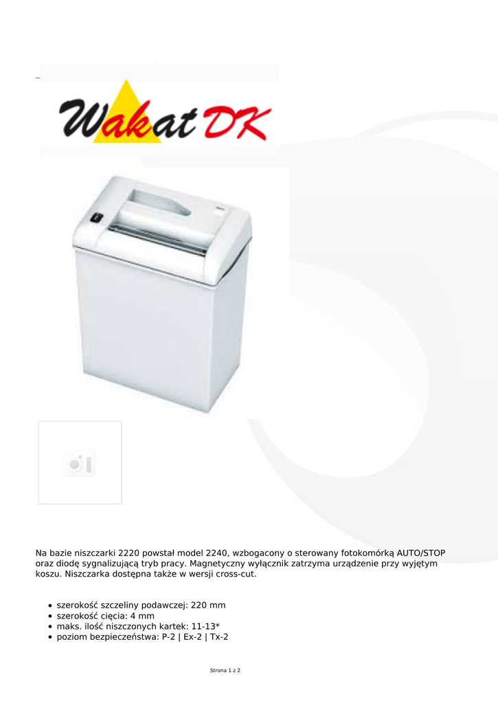 Na bazie niszczarki 2220 powstał model 2240, wzbogacony o sterowany fotokomórką AUTO/STOP oraz diodę sygnalizującą tryb pracy. Magnetyczny wyłącznik zatrzyma urządzenie przy wyjętym koszu. Niszczarka dostępna także w wersji cross-cut. szerokość szczeliny podawczej: 220 mm szerokość cięcia: 4 mm maks. ilość niszczonych kartek: 11-13* poziom bezpieczeństwa: P-2 | Ex-2 | Tx-2 Strona 1 z 2 automatyczny „start/stop” (fotokomórka) trójpozycyjny przełącznik (start/stop/rewers) podwójne zabezpieczenie silnika przed przegrzaniem automatyczne wyłączenie po zdjęciu głowicy tnącej rewers pojemność kosza: 20 l wymiary (W x S x G): 452 x 345 x 215 mm ciężar: 6 kg * próby wykonano na papierze 70 g/m2 Strona 2 z 2