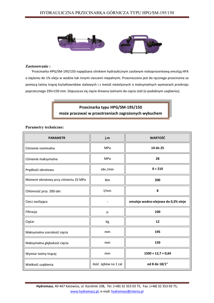 HYDRAULICZNA PRZECINARKA GÓRNICZA TYPU HPG/SM-195/150 Zastosowanie : Przecinarka HPG/SM-195/150 napędzana silnikiem hydraulicznym zasilanym niskoprocentową emulsją HFA o stężeniu do 1% oleju w wodzie lub innymi cieczami niepalnymi. Przeznaczona jest do ręcznego przecinania za pomocą taśmy tnącej kształtowników stalowych i z metali nieżelaznych o maksymalnych wymiarach przekroju poprzecznego 195×150 mm. Dopuszcza się cięcie drewna taśmami do cięcia stali (o podobnym uzębieniu). Przecinarka typu HPG/SM-195/150 może pracować w przestrzeniach zagrożonych wybuchem Parametry techniczne: PARAMETR j.m WARTOŚĆ Ciśnienie nominalne MPa 14 do 25 Ciśnienie maksymalne MPa 28 obr./min 0 ÷ 210 Nm płynna regulacja obrotów 200 l/min 8 Ciecz zasilająca - emulsja wodno-olejowa do 0,3% oleje Filtracja μ 100 Ciężar kg 12 Maksymalna szerokość cięcia mm 195 Maksymalna głębokość cięcia mm 150 Wymiar taśmy tnącej mm 1500 × 12,7 × 0,64 ilość zębów na 1 cal od 8 do 18/1" Prędkość obrotowa Moment obrotowy przy ciśnieniu 25 MPa Chłonność przy 200 obr. Wielkość uzębienia Hydromasz, 40-467 Katowice, ul. Karolinki 10B, Tel. (+48) 32 353 03 75, Fax. (+48) 32 353 03 75, www.hydromasz.pl, e-mail: [email protected]