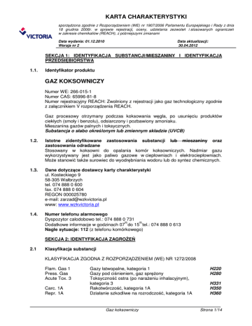 KARTA CHARAKTERYSTYKI sporządzona zgodnie z Rozporządzeniem (WE) nr 1907/2006 Parlamentu Europejskiego i Rady z dnia 18 grudnia 2006r. w sprawie rejestracji, oceny, udzielania zezwoleń i stosowanych ograniczeń w zakresie chemikaliów (REACH), z późniejszymi zmianami Data wydania: 01.12.2010 Wersja nr 2 Data aktualizacji: 30.04.2012 SEKCJA 1: IDENTYFIKACJA SUBSTANCJI/MIESZANINY I IDENTYFIKACJA PRZEDSIĘBIORSTWA 1.1. Identyfikator produktu GAZ KOKSOWNICZY Numer WE: 266-015-1 Numer CAS: 65996-81-8 Numer rejestracyjny REACH: Zwolniony z rejestracji jako gaz technologiczny zgodnie z załącznikiem V rozporządzenia REACH. Gaz procesowy otrzymany podczas koksowania węgla, po usunięciu produktów ciekłych (smoły i benzolu), odsiarczony i pozbawiony amoniaku. Mieszanina gazów palnych i toksycznych. Substancja o słabo określonym lub zmiennym składzie (UVCB) 1.2. Istotne zidentyfikowane zastosowania substancji lub mieszaniny oraz zastosowania odradzane Stosowany w koksowni do opalania komór koksowniczych. Nadmiar gazu wykorzystywany jest jako paliwo gazowe w ciepłowniach i elektrociepłowniach. Może stanowić także surowiec do wyodrębniania wodoru lub do syntez chemicznych. 1.3. Dane dotyczące dostawcy karty charakterystyki ul. Kosteckiego 9 58-305 Wałbrzych tel. 074 888 0 600 fax. 074 888 0 604 REGON 000025780 e-mail: [email protected] www: www.wzkvictoria.pl 1.4. Numer telefonu alarmowego Dyspozytor całodobowo tel.: 074 888 0 731 00 00 Dodatkowe informacje w godzinach 07 do 15 tel.: 074 888 0 613 Nagłe sytuacje: 112 (z telefonu komórkowego) SEKCJA 2: IDENTYFIKACJA ZAGROŻEŃ 2.1 Klasyfikacja substancji KLASYFIKACJA ZGODNA Z ROZPORZĄDZENIEM (WE) NR 1272/2008 Flam. Gas 1 Press. Gas Acute Tox. 3 Carc. 1A Repr. 1A Gazy łatwopalne, kategoria 1 Gazy pod ciśnieniem, gaz sprężony Toksyczność ostra (po narażeniu inhalacyjnym), kategoria 3 Rakotwórczość, kategoria 1A Działanie szkodliwe na rozrodczość, kategoria 1A Gaz koksowniczy H220 H280 H331 H350 H360 Strona 1/14 KARTA CHARAKTERYSTYKI sporządzona zgodnie z Rozporządzeniem (WE) nr 1907/2006 Parlamentu Europejskiego i Rady z dnia 18 grudnia 2006r. w sprawie rejestracji, oceny, udzielania zezwoleń i stosowanych ograniczeń w zakresie chemikaliów (REACH), z późniejszymi zmianami Data wydania: 01.12.2010 Wersja nr 2 STOT RE 1 Aquatic Acute 1 Data aktualizacji: 30.04.2012 Działanie toksyczne na narządy docelowe – narażenie powtarzane, kategoria 1 Stwarzające zagrożenie dla środowiska wodnego – zagrożenie ostre, kategoria 1 H372 H400 KLASYFIKACJA ZGODNA Z DYREKTYWĄ NR 67/548/EWG Substancja skrajnie łatwopalna Substancja toksyczna Substancja działająca szkodliwie na rozrodczość kat. 1 Substancja rakotwórcza kat. 1 Substancja niebezpieczna dla środowiska (F+, R12) (T, R23, 48/23) (T, R61) (T, R45) (N, R50) Rodzaje zagrożenia: R 12 Produkt skrajnie łatwopalny R 23 Działa toksycznie przez drogi oddechowe R45 Może powodować raka R48/23 Działa toksycznie przez drogi oddechowe; stwarza poważne zagrożenie dla zdrowia w następstwie długotrwałego narażenia R50 Działa bardzo toksycznie na organizmy wodne R61 Może działać szkodliwie na dziecko w łonie matki 2.2 Elementy oznakowania Piktogramy określające rodzaj zagrożenia: GHS 02 GHS 04 GHS 06 GHS 08 GHS 09 Hasło ostrzegawcze: Niebezpieczeństwo Zwroty określające rodzaj zagrożenia: H220 Skrajnie łatwopalny gaz H280 Zawiera gaz pod ciśnieniem; ogrzanie grozi wybuchem H331 Działa toksycznie w następstwie wdychania H350 Może powodować raka H360 Może działać szkodliwie na płodność lub na dziecko w łonie matki H372 Powoduje uszkodzenie narządów poprzez długotrwałe lub powtarzane narażenie H400 Działa bardzo toksycznie na organizmy wodne Zwroty wskazujące środki ostrożności: Gaz koksowniczy Strona 2/14 KARTA CHARAKTERYSTYKI sporządzona zgodnie z Rozporządzeniem (WE) nr 1907/2006 Parlamentu Europejskiego i Rady z dnia 18 grudnia 2006r. w sprawie rejestracji, oceny, udzielania zezwoleń i stosowanych ograniczeń w zakresie chemikaliów (REACH), z późniejszymi zmianami Data wydania: 01.12.2010 Wersja nr 2 Zapobieganie P201 P202 P210 P260 P273 P281 Reagowanie P321 P304 + P340 P308 + P313 P377 P381 Przechowywanie P405 Usuwanie P501 2.3 Data aktualizacji: 30.04.2012 Przed użyciem zapoznać się ze specjalnymi środkami ostrożności. Nie używać przed zapoznaniem się i zrozumieniem wszystkich środków bezpieczeństwa. Przechowywać z dala od źródeł ciepła/iskrzenia/otwartego ognia/gorących powierzchni. Palenie wzbronione. Nie wdychać pyłu/dymu/gazu/mgły/par/rozpylonej cieczy. Unikać uwolnienia do środowiska. Stosować wymagane środki ochrony indywidualnej. Zastosować określone leczenie (patrz … na etykiecie). W PRZYPADKU DOSTANIA SIĘ DO DRÓG ODDECHOWYCH: wyprowadzić lub wynieść poszkodowanego na świeże powietrze i zapewnić warunki do odpoczynku w pozycji umożliwiającej swobodne oddychanie. W przypadku narażenia lub styczności: Zasięgnąć porady/zgłosić się pod opiekę lekarza. W przypadku płonięcia wyciekającego gazu: Nie gasić, jeżeli nie można bezpiecznie zahamować wycieku. Wyeliminować wszystkie źródła zapłonu, jeżeli jest to bezpieczne. Przechowywać pod zamknięciem. Zawartość/pojemnik usuwać zgodnie z obowiązującymi lokalnymi/regionalnymi/międzynarodowymi przepisami. Inne zagrożenia Gaz toksyczny, palny, z powietrzem tworzy mieszaninę wybuchową. Gaz koksowniczy zwolniony jest z rejestracji, w związku z powyższym ocena czy substancja należy do kategorii PBT i vPvB nie jest wymagana. SEKCJA 3: SKŁAD/INFORMACJA O SKŁADNIKACH 3.1. Substancje Niebezpieczne składniki Wodór Metan Nr WE Nr CAS Ilość * [% v/v] 215-605-7 1333-74-0 200-812-7 74-82-8 Klasyfikacja** Dyrektywa nr 67/548/EWG 50-65 F+; R12 20-30 F+; R12 Gaz koksowniczy Rozporządzenie (WE) nr 1272/2008 Flam. Gas 1; H220 Press. Gas Flam. Gas 1; H220 Press. Gas Strona 3/14 KARTA CHARAKTERYSTYKI spo