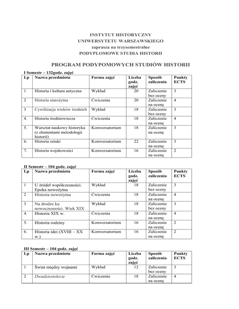INSTYTUT HISTORYCZNY UNIWERSYTETU WARSZAWSKIEGO zaprasza na trzysemestralne PODYPLOMOWE STUDIA HISTORII PROGRAM PODYPOMOWYCH STUDIÓW HISTORII I Semestr – 132godz. zajęć Lp Nazwa przedmiotu Forma zajęć 1 Historia i kultura antyczna Wykład 2 Historia starożytna Ćwiczenia 20 3 Cywilizacja wieków średnich Wykład 18 4. Historia średniowiecza Ćwiczenia 18 5. Konwersatorium 18 6. Warsztat naukowy historyka (z elementami metodologii historii) Historia sztuki Konwersatorium 22 7. Historia wojskowości Konwersatorium 16 II Semestr – 104 godz. zajęć Lp Nazwa przedmiotu Forma zajęć Liczba godz. zajęć 20 Liczba godz. zajęć 18 U źródeł współczesności. Epoka nowożytna Historia nowożytna Wykład Ćwiczenia 18 Wykład 18 4. Na drodze ku nowoczesności. Wiek XIX Historia XIX w. Ćwiczenia 18 5. Historia rodziny Konwersatorium 16 6. Historia idei (XVIII – XX w.) Konwersatorium 16 1 2 3 III Semestr – 104 godz. zajęć Lp Nazwa przedmiotu Forma zajęć 1 Świat między wojnami Wykład 2 Dwudziestolecie Ćwiczenia Liczba godz. zajęć 12 18 Sposób zaliczenia Punkty ECTS Zaliczenie bez oceny Zaliczenie na ocenę Zaliczenie bez oceny Zaliczenie na ocenę Zaliczenie na ocenę 3 Zaliczenie na ocenę Zaliczenie na ocenę 3 Sposób zaliczenia Punkty ECTS Zaliczenie bez oceny Zaliczenie na ocenę Zaliczenie bez oceny Zaliczenie na ocenę Zaliczenie na ocenę Zaliczenie na ocenę 3 Sposób zaliczenia Punkty ECTS Zaliczenie bez oceny Zaliczenie na ocenę 3 4 3 4 3 2 4 3 4 2 2 4 3 międzywojenne Polska i świat po 1945 r. Wykład 18 4. Historia najnowsza Ćwiczenia 18 5. Historia gospodarcza Konwersatorium 16 6. Obcy czy swoi? Relacje narodowościowe na ziemiach polskich Seminarium dyplomowe Konwersatorium 16 Seminarium 24 7. Zaliczenie bez oceny Zaliczenie na ocenę Zaliczenie na ocenę Zaliczenie na ocenę 3 Zaliczenie bez oceny 6 4 2 2 Razem: 358 godz. zajęć – 64 ECTS PROGRAM FAKULTATYWNEJ SPECJALIZACJI NAUCZYCIELSKIEJ Lp Nazwa przedmiotu Forma zajęć 1. Dydaktyka przedmiotu historia i społeczeństwo w szkole podstawowej Dydaktyka historii – gimnazjum Dydaktyka historii – szkoły ponadgimnazjalne Dydaktyka przedmiotu Historia i społeczeństwo – szkoły ponadgimnazjalne Praktyka w szkole podstawowej Praktyka w gimnazjum Ćwiczenia 2. 3. 4. 5. 5. 6. Praktyka w szkole ponadgimnazjalnej Ćwiczenia Ćwiczenia Ćwiczenia Liczba godz. zajęć 14 (I semestr) Sposób zaliczenia Zaliczenie na ocenę Punkty ECTS 2 20 (II semestr) 16 (II semestr) 20 (III semestr) 20 (I semestr) 20 (II semestr) 20 (III semestr) Zaliczenie na ocenę Zaliczenie na ocenę Zaliczenie na ocenę 3 Zaliczenie na ocenę Zaliczenie na ocenę Zaliczenie na ocenę 1,5 2 3 1,5 1,5 Razem: 70 godz. zajęć, 60 godz. praktyk – 14,5 ECTS