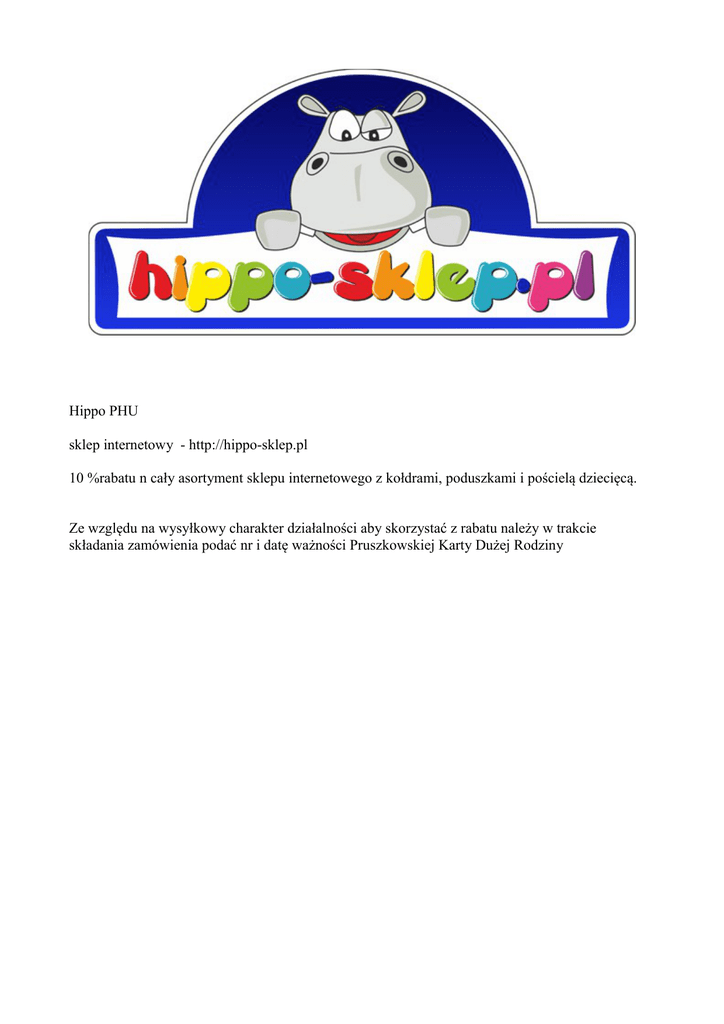 Hippo PHU sklep internetowy - http://hippo-sklep.pl 10 %rabatu n cały asortyment sklepu internetowego z kołdrami, poduszkami i pościelą dziecięcą. Ze względu na wysyłkowy charakter działalności aby skorzystać z rabatu należy w trakcie składania zamówienia podać nr i datę ważności Pruszkowskiej Karty Dużej Rodziny