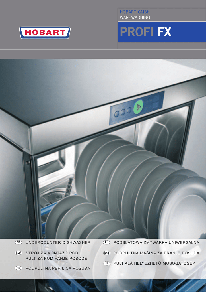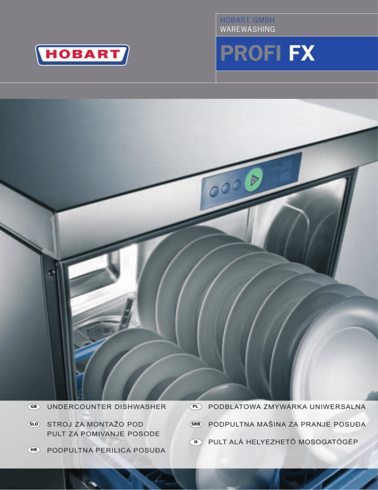 HOBART GMBH WAREWASHING PROFI FX GB UNDERCOUNTER DISHWASHER PL PODBLATOWA ZMYWARKA UNIWERSALNA SLO STROJ ZA MONTAŽO POD PULT ZA POMIVANJE POSODE SRB PODPULTNA MAŠINA ZA PRANJE POSUĐA H HR PODPULTNA PERILICA POSUĐA PULT ALÁ HELYEZHETŐ MOSOGATÓGÉP GB FX is an ideal undercounter model for plates and glasses. Suitable for high capacities in continuous operation. SLO Model FX za montažo pod pult je idealen za pomivanje kozarcev in krožnikov. Primeren za nepretrgano pomivanje velikih kapacitet. HR FX je idealni podpultni model za pranje tanjura i čaša. Prikladan je za velike kapacitete kroz kontinuirani rad. PL Model FX jest doskonałą zmywarką podblatową przeznaczoną do mycia dużych ilości talerzy i szkła podczas intensywnego użytkowania. SRB FX je idealna podpultna mašina za pranje tanjira i čaša. Pogodna za veliki kapacitet kontinualnog rada. H Az FX modell tányérok és poharak mosogatásának ideális eszköze. Folyamatos üzemben nagy mennyiség elmosogatására alkalmas. GB PRODUCT FEATURES • Fine filter system GENIUS-X²: advanced filter system with pre-wash function, reduces detergent consumption up to 30 % • Single button operation SMARTRONIC: colour coded status with indication of remaining cycle time, for easy operation and handling • Rinse pump ACCURINSE: guarantees rinse with constantly 2.5 l, independent from on-site pressure. Saves up to 30 % water, energy and chemicals • Strainer control PROOF: prevents operation without tank strainer and ensures so best results • X-change cycle AQUA-NEW: switchable wash cycle, drains the tank completely and fills via fresh water rinse. Ideal to wash heavily soiled items or change of chemicals • Wash system ROTOR: separately turning wash and rinse arms for dynamic wash power • Wide angle wash jets FAN: distributes wash water equally into the wash chamber • Water softener NONSTOP: regenerates simultaneously to the wash cycle without interrupting the cycle duration HOBART GMBH WAREWASHING PROFI FX SLO UPORABNIKOVE PREDNOSTI • Fini filtrirni sistem GENIUS-X2: napreden filtrirni sistem s funkcijo predpranja zniža porabo detergenta za do 30 % • Upravljanje z enim gumbom SMARTRONIC: barvni prikaz stanja z indikacijo časa do konca cikla zagotavlja enostavno delovanje in upravljanje • Splakovalna črpalka ACCURINSE: zagotavlja splakovanje s stalnima 2,5 litra, neodvisna od pritiska na lokaciji. Prihrani do 30 % vode, energije in kemičnih sredstev • Nadzor cedila PROOF: prepreči delovanje brez cedila v cisterni in zagotavlja najboljše rezultate HR • Cikel AQUA-NEW: preklopni pomivalni cikel, ki popolnoma izprani cisterno in polni preko spakovanja s svežo vodo. Idealen za zelo umazano posodo ali pri zamenjavi kemičnih sredstev • Sistem pomivanja z ROTOR: ločeno obrača pralne in splakovalne roke in tako zagotavlja dinamično moč pomivanja • FAN s pomivalnimi šobami velikega kota razdeli pomivalno vodo enakomerno po pomivalni komori • Mehčalec vode NONSTOP: regeneracija poteka hkrati s pomivalnim ciklom brez prekinitve le-tega PREDNOSTI MAŠINE • Fini filter sustav GENIUS-X²: napredni filter sustav s funkcijom predpranja, smanjuje potrošnju detergenta do 30 % • Upravljanje kroz jednu tipku SMARTRONIC: raznobojni pokazivač statusa; pokazuje preostalo vrijeme ciklusa, za lakše rukovanje i rad • Pumpa ispiranja ACCURINSE: garantira konstantno ispiranje sa 2.5 l, neovisno o pritisku. Štedi do 30% vode, energije i kemijskih sredstava • Kontrola prisutnosti sita PROOF: onemogućava rad bez postavljenog sita tanka i tako osigurava najbolje rezultate • X-change ciklus AQUA-NEW: promjenjivi ciklus pranja, kroz potpuno pražnjenje tanka i punjenje kroz dotok svježe vode. Idealno za pranje teških naslaga ili kod promjene kemijskih sredstava • Sustav pranja ROTOR: odvojeno okreće ruke pranja i ruke ispiranja kako bi snaga pranja bilo jača i učinkovitija • Široke mlaznice pranja FAN: distribuiraju vodu za pranje ravnomjerno u komori pranja • Omekšivač vode NONSTOP: simultana regeneracija uz ciklus pranja, bez prekida trajanja ciklusa SRB PREDNOST PROZVODA • Sistem za fino filtriranje GENIUS-X²: napredni sistem filtriranja sa funkcijom predpranja smanjuje potrošnju deterdženta do 30 % • Upravljanje preko jednog dugmeta SMARTRONIC: trenutni režim rada kodiran bojama, sa indikacijom preostalog vremena ciklusa za lakši rad i rukovanje • Pumpa za ispiranje ACCURINSE: ispiranje vrši konstantnim protokom od 2,5 l, nezavisno od pritiska vode na lokaciji. Štedi do 30 % vode, energije i hemijskih sredstava • Sistem kontrole filtera dokazuje PROOF: preventivni rad za ciscenje rezervoara i tako garantuje najbolje rezultate PL • Izmenljivi ciklus AQUA-NEW: ubacivanje ciklusa pranja, potpuno prazni rezervoar i puni ga svežom vodom za ispiranje. Idealno za jako zaprljano posuđe ili promenu hemikalija • Sistem pranja ROTOR: posebno okreće krake za pranje i ispiranje radi dinamične snage pranja • Širokougaone mlaznice za pranje FAN ravnomerno distribuiraju vodu u komori za pranje • Omekšivač vode NONSTOP regeneriše vodu u toku ciklusa pranja bez produžavanja trajanja ciklusa ZALETY PRODUKTU • System GENIUS-X²: zaawansowany system filtrowania z funkcją mycia wstępnego obniża zużycie środków myjących do 30 % • Obsługa urządzenia jednym przyciskiem SMARTRONIC: Kolorowo podświetlany przycisk, wskazuje na tryb pracy oraz czas pozostały do zakończenia cyklu, znacznie ułatwia obsługę • Pompa płucząca ACCURINSE: gwarantuje spłukiwanie stałą ilością wody 2,5 litra, niezależnie od ciśnienia wody na miejscu. Pozwala zaoszczędzić do 30 % wody, energii oraz środków myjących • Kontrola właściwej pozycji sitka PROOF: zapobiega rozpoczęciu pracy zmywarki bez właściwie zainstalowanego sitka, gwarantując znakomity rezultat mycia • Cykl AQUA-NEW: opcjonalny cykl mycia opróżnia całkowicie zbiornik po czym napełnia go czystą wod