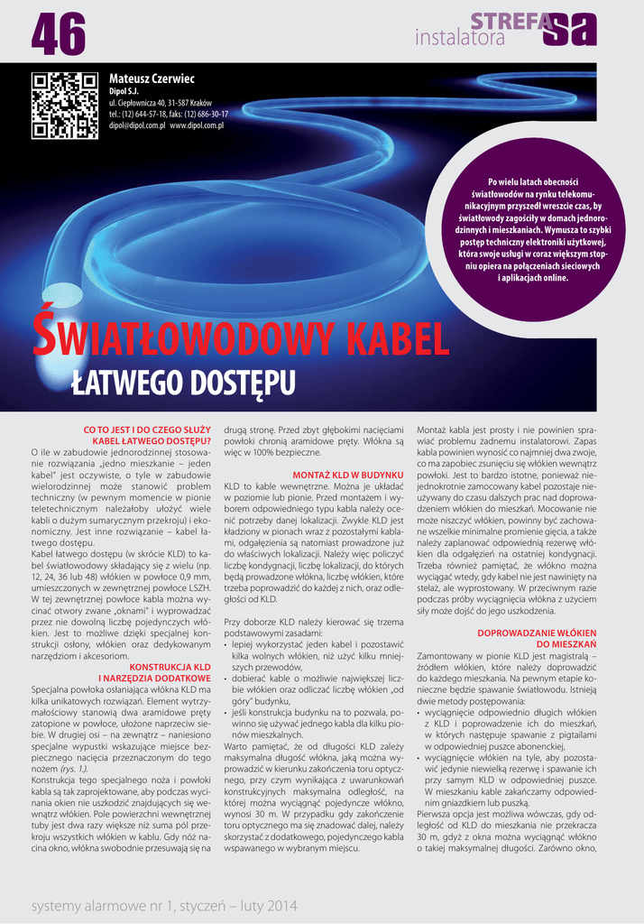 46 strefa instalatora Mateusz Czerwiec Dipol S.J. ul. Ciepłownicza 40, 31-587 Kraków tel.: (12) 644-57-18, faks: (12) 686-30-17 [email protected] www.dipol.com.pl Po wielu latach obecności światłowodów na rynku telekomunikacyjnym przyszedł wreszcie czas, by światłowody zagościły w domach jednorodzinnych i mieszkaniach. Wymusza to szybki postęp techniczny elektroniki użytkowej, która swoje usługi w coraz większym stopniu opiera na połączeniach sieciowych i aplikacjach online. Światłowodowy kabel łatwego dostępu Co to jest i do czego służy kabel łatwego dostępu? O ile w zabudowie jednorodzinnej stosowanie rozwiązania „jedno mieszkanie – jeden kabel” jest oczywiste, o tyle w zabudowie wielorodzinnej może stanowić problem techniczny (w pewnym momencie w pionie teletechnicznym należałoby ułożyć wiele kabli o dużym sumarycznym przekroju) i ekonomiczny. Jest inne rozwiązanie – kabel łatwego dostępu. Kabel łatwego dostępu (w skrócie KLD) to kabel światłowodowy składający się z wielu (np. 12, 24, 36 lub 48) włókien w powłoce 0,9 mm, umieszczonych w zewnętrznej powłoce LSZH. W tej zewnętrznej powłoce kabla można wycinać otwory zwane „oknami” i wyprowadzać przez nie dowolną liczbę pojedynczych włókien. Jest to możliwe dzięki specjalnej konstrukcji osłony, włókien oraz dedykowanym narzędziom i akcesoriom. Konstrukcja KLD i narzędzia dodatkowe Specjalna powłoka osłaniająca włókna KLD ma kilka unikatowych rozwiązań. Element wytrzymałościowy stanowią dwa aramidowe pręty zatopione w powłoce, ułożone naprzeciw siebie. W drugiej osi – na zewnątrz – naniesiono specjalne wypustki wskazujące miejsce bezpiecznego nacięcia przeznaczonym do tego nożem (rys. 1.). Konstrukcja tego specjalnego noża i powłoki kabla są tak zaprojektowane, aby podczas wycinania okien nie uszkodzić znajdujących się wewnątrz włókien. Pole powierzchni wewnętrznej tuby jest dwa razy większe niż suma pól przekroju wszystkich włókien w kablu. Gdy nóż nacina okno, włókna swobodnie przesuwają się na drugą stronę. Przed zbyt głębokimi nacięciami powłoki chronią aramidowe pręty. Włókna są więc w 100% bezpieczne. Montaż KLD w budynku KLD to kable wewnętrzne. Można je układać w poziomie lub pionie. Przed montażem i wyborem odpowiedniego typu kabla należy ocenić potrzeby danej lokalizacji. Zwykle KLD jest kładziony w pionach wraz z pozostałymi kablami, odgałęzienia są natomiast prowadzone już do właściwych lokalizacji. Należy więc policzyć liczbę kondygnacji, liczbę lokalizacji, do których będą prowadzone włókna, liczbę włókien, które trzeba poprowadzić do każdej z nich, oraz odległości od KLD. Przy doborze KLD należy kierować się trzema podstawowymi zasadami: • lepiej wykorzystać jeden kabel i pozostawić kilka wolnych włókien, niż użyć kilku mniejszych przewodów, • dobierać kable o możliwie największej liczbie włókien oraz odliczać liczbę włókien „od góry” budynku, • jeśli konstrukcja budynku na to pozwala, powinno się używać jednego kabla dla kilku pionów mieszkalnych. Warto pamiętać, że od długości KLD zależy maksymalna długość włókna, jaką można wyprowadzić w kierunku zakończenia toru optycznego, przy czym wynikająca z uwarunkowań konstrukcyjnych maksymalna odległość, na której można wyciągnąć pojedyncze włókno, wynosi 30 m. W przypadku gdy zakończenie toru optycznego ma się znadować dalej, należy skorzystać z dodatkowego, pojedynczego kabla wspawanego w wybranym miejscu. systemy alarmowe nr 1, styczeń – luty 2014 Montaż kabla jest prosty i nie powinien sprawiać problemu żadnemu instalatorowi. Zapas kabla powinien wynosić co najmniej dwa zwoje, co ma zapobiec zsunięciu się włókien wewnątrz powłoki. Jest to bardzo istotne, ponieważ niejednokrotnie zamocowany kabel pozostaje nieużywany do czasu dalszych prac nad doprowadzeniem włókien do mieszkań. Mocowanie nie może niszczyć włókien, powinny być zachowane wszelkie minimalne promienie gięcia, a także należy zaplanować odpowiednią rezerwę włókien dla odgałęzień na ostatniej kondygnacji. Trzeba również pamiętać, że włókno można wyciągać wtedy, gdy kabel nie jest nawinięty na stelaż, ale wyprostowany. W przeciwnym razie podczas próby wyciągnięcia włókna z użyciem siły może dojść do jego uszkodzenia. Doprowadzanie włókien do mieszkań Zamontowany w pionie KLD jest magistralą – źródłem włókien, które należy doprowadzić do każdego mieszkania. Na pewnym etapie konieczne będzie spawanie światłowodu. Istnieją dwie metody postępowania: • wyciągnięcie odpowiednio długich włókien z KLD i poprowadzenie ich do mieszkań, w których następuje spawanie z pigtailami w odpowiedniej puszce abonenckiej, • wyciągnięcie włókien na tyle, aby pozostawić jedynie niewielką rezerwę i spawanie ich przy samym KLD w odpowiedniej puszce. W mieszkaniu kable zakańczamy odpowiednim gniazdkiem lub puszką. Pierwsza opcja jest możliwa wówczas, gdy odległość od KLD do mieszkania nie przekracza 30 m, gdyż z okna można wyciągnąć włókno o takiej maksymalnej długości. Zarówno okno, jak i gołe włókno muszą być chronione przed ewentualnym uszkodzeniem. Na kablu należy zamontować osłonę odgałęzienia, a włókno umieścić w osłonie. Osłona może być prowadzona pod lub nad tynkiem. Jeśli zdecydujemy się prowadzić światłowody w ścianach, należy przemyśleć ich ścieżkę. Późniejsze wykrycie światłowodu jakimkolwiek detektorem nie będzie możliwe i wówczas będzie potrzebna dokładna dokumentacja. Jeśli punkty doprowadzenia włókien znajdują się w odległości większej niż 30 m, wówczas najlepszym rozwiązaniem jest przygotowanie gotowych pigtaili, które mogą być wspawane do włókien przy samym kablu. Wtedy w bezpośrednim sąsiedztwie przewodu należy umieścić p