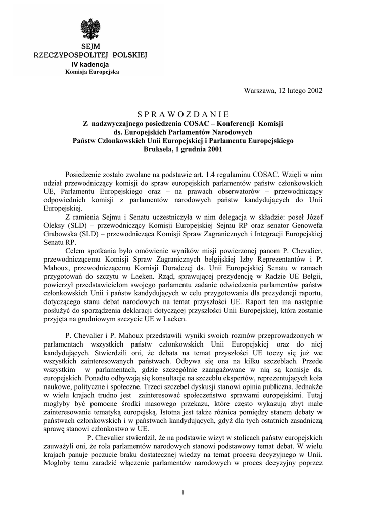 IV kadencja Komisja Europejska Warszawa, 12 lutego 2002 SPRAWOZDANIE Z nadzwyczajnego posiedzenia COSAC – Konferencji Komisji ds. Europejskich Parlamentów Narodowych Państw Członkowskich Unii Europejskiej i Parlamentu Europejskiego Bruksela, 1 grudnia 2001 Posiedzenie zostało zwołane na podstawie art. 1.4 regulaminu COSAC. Wzięli w nim udział przewodniczący komisji do spraw europejskich parlamentów państw członkowskich UE, Parlamentu Europejskiego oraz – na prawach obserwatorów – przewodniczący odpowiednich komisji z parlamentów narodowych państw kandydujących do Unii Europejskiej. Z ramienia Sejmu i Senatu uczestniczyła w nim delegacja w składzie: poseł Józef Oleksy (SLD) – przewodniczący Komisji Europejskiej Sejmu RP oraz senator Genowefa Grabowska (SLD) – przewodnicząca Komisji Spraw Zagranicznych i Integracji Europejskiej Senatu RP. Celem spotkania było omówienie wyników misji powierzonej panom P. Chevalier, przewodniczącemu Komisji Spraw Zagranicznych belgijskiej Izby Reprezentantów i P. Mahoux, przewodniczącemu Komisji Doradczej ds. Unii Europejskiej Senatu w ramach przygotowań do szczytu w Laeken. Rząd, sprawującej prezydencję w Radzie UE Belgii, powierzył przedstawicielom swojego parlamentu zadanie odwiedzenia parlamentów państw członkowskich Unii i państw kandydujących w celu przygotowania dla prezydencji raportu, dotyczącego stanu debat narodowych na temat przyszłości UE. Raport ten ma następnie posłużyć do sporządzenia deklaracji dotyczącej przyszłości Unii Europejskiej, która zostanie przyjęta na grudniowym szczycie UE w Laeken. P. Chevalier i P. Mahoux przedstawili wyniki swoich rozmów przeprowadzonych w parlamentach wszystkich państw członkowskich Unii Europejskiej oraz do niej kandydujących. Stwierdzili oni, że debata na temat przyszłości UE toczy się już we wszystkich zainteresowanych państwach. Odbywa się ona na kilku szczeblach. Przede wszystkim w parlamentach, gdzie szczególnie zaangażowane w nią są komisje ds. europejskich. Ponadto odbywają się konsultacje na szczeblu ekspertów, reprezentujących koła naukowe, polityczne i społeczne. Trzeci szczebel dyskusji stanowi opinia publiczna. Jednakże w wielu krajach trudno jest zainteresować społeczeństwo sprawami europejskimi. Tutaj mogłyby być pomocne środki masowego przekazu, które często wykazują zbyt małe zainteresowanie tematyką europejską. Istotna jest także różnica pomiędzy stanem debaty w państwach członkowskich i w państwach kandydujących, gdyż dla tych ostatnich zasadniczą sprawę stanowi członkostwo w UE. P. Chevalier stwierdził, że na podstawie wizyt w stolicach państw europejskich zauważyli oni, że rola parlamentów narodowych stanowi podstawowy temat debat. W wielu krajach panuje poczucie braku dostatecznej wiedzy na temat procesu decyzyjnego w Unii. Mogłoby temu zaradzić włączenie parlamentów narodowych w proces decyzyjny poprzez 1 stworzenie drugiej izby Parlamentu Europejskiego. Jednakże zdaniem parlamentarzystów belgijskich, parlamenty narodowe powinny wypełniać swoje funkcje na poziomie narodowym, a nie europejskim. Ponadto uważają oni, że nowa instytucja nie służyłaby uproszczeniu działalności UE. Według P. Chevaliera wyłaniają się dwa modele. W pierwszym parlamenty narodowe działają tylko za pomocą swych struktur narodowych, a więc poprzez wpływ, jaki wywierają za pomocą instrumentów kontroli rządu. Drugi model bezpośrednio wiąże Parlament Europejski poprzez reprezentacje w parlamentach narodowych. Obecnie stosowany jest pierwszy model, i to do niego przychyla się większość rozmówców. Kolejnym poruszanym podczas rozmów tematem był problem wzmocnienia roli COSAC poprzez ustanowienie stałego sekretariatu, który stworzyłby możliwość wypełniania funkcji subsydiarności. Drugą możliwością wzmocnienia COSAC może być wzmocnienie reprezentacji komisji. Trzecia możliwość pociąga za sobą włączenie przedstawicieli parlamentów narodowych do Rady Ministrów. Zabierając głos w dyskusji przewodniczący Komisji Europejskiej Sejmu, poseł Józef Oleksy podkreślił wagę decyzji o włączeniu państw kandydujących w prace nad przyszłością Unii Europejskiej. Wyraził oczekiwanie, że szczyt w Laeken potwierdzi ustalenia w sprawie Konwentu. Wezwał państwa członkowskie do przyznania państwom kandydującym takich samych praw, jakimi będą dysponowały państwa członkowskie podczas prac w Konwencie. Odnosząc się do rozdziału kompetencji między UE a państwa członkowskie przewodniczący Oleksy stwierdził, że rozwiązanie tego problemu nie leży w pierwszym rzędzie w prostym rozdzieleniu kompetencji Unii i państw członkowskich. Zwrócił uwagę na to, że wynikiem dyskusji nad podziałem kompetencji nie może być regres integracji europejskiej, polegający na renacjonalizacji ważnych obszarów – na przykład polityki rolnej czy regionalnej, czy też przeniesienie niektórych problemów na płaszczyznę negocjacji akcesyjnych. W ocenie J. Oleksego w kwestii przyszłego statusu Karty Praw Podstawowych zasadniczym problemem pozostaje wprowadzenie wspólnych wartości do traktatów ustanawiających Wspólnoty i Unię. Stąd też wprowadzenie Karty – po niezbędnych udoskonaleniach – do „traktatu konstytucyjnego” uznał za sprawę o zasadniczej wadze. Celem uproszczenia traktatów ustanawiających Wspólnoty i Unię – zdaniem przewodniczącego sejmowej Komisji Europejskiej - powinno być skonstruowanie jednego Traktatu o UE – owego „traktatu konstytucyjnego”, zawierającego działy jasno precyzujące zasady nowoczesnej demokracji. Przewodniczący J. Oleksy stwierdził ponadto, że wynik dyskusji na temat roli parlamentów narodowych w przyszłej architekturze europejskiej będzie miał bezpośredni wpływ na zakres legitymacji demokratycznej procesu integracji. Zwrócił uwagę na fakt, że wysuwane na obecnym etapie konce