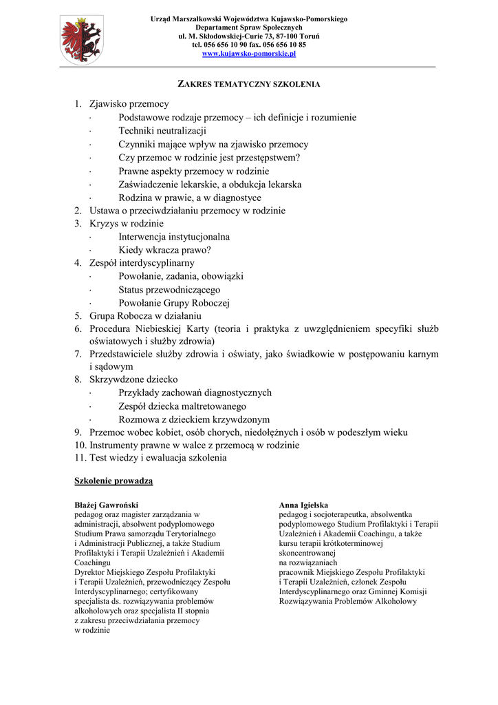Urząd Marszałkowski Województwa Kujawsko-Pomorskiego Departament Spraw Społecznych ul. M. Skłodowskiej-Curie 73, 87-100 Toruń tel. 056 656 10 90 fax. 056 656 10 85 www.kujawsko-pomorskie.pl ZAKRES TEMATYCZNY SZKOLENIA 1. Zjawisko przemocy ⋅ Podstawowe rodzaje przemocy – ich definicje i rozumienie ⋅ Techniki neutralizacji ⋅ Czynniki mające wpływ na zjawisko przemocy ⋅ Czy przemoc w rodzinie jest przestępstwem? ⋅ Prawne aspekty przemocy w rodzinie ⋅ Zaświadczenie lekarskie, a obdukcja lekarska ⋅ Rodzina w prawie, a w diagnostyce 2. Ustawa o przeciwdziałaniu przemocy w rodzinie 3. Kryzys w rodzinie ⋅ Interwencja instytucjonalna ⋅ Kiedy wkracza prawo? 4. Zespół interdyscyplinarny ⋅ Powołanie, zadania, obowiązki ⋅ Status przewodniczącego ⋅ Powołanie Grupy Roboczej 5. Grupa Robocza w działaniu 6. Procedura Niebieskiej Karty (teoria i praktyka z uwzględnieniem specyfiki służb oświatowych i służby zdrowia) 7. Przedstawiciele służby zdrowia i oświaty, jako świadkowie w postępowaniu karnym i sądowym 8. Skrzywdzone dziecko ⋅ Przykłady zachowań diagnostycznych ⋅ Zespół dziecka maltretowanego ⋅ Rozmowa z dzieckiem krzywdzonym 9. Przemoc wobec kobiet, osób chorych, niedołężnych i osób w podeszłym wieku 10. Instrumenty prawne w walce z przemocą w rodzinie 11. Test wiedzy i ewaluacja szkolenia Szkolenie prowadzą Błażej Gawroński pedagog oraz magister zarządzania w administracji, absolwent podyplomowego Studium Prawa samorządu Terytorialnego i Administracji Publicznej, a także Studium Profilaktyki i Terapii Uzależnień i Akademii Coachingu Dyrektor Miejskiego Zespołu Profilaktyki i Terapii Uzależnień, przewodniczący Zespołu Interdyscyplinarnego; certyfikowany specjalista ds. rozwiązywania problemów alkoholowych oraz specjalista II stopnia z zakresu przeciwdziałania przemocy w rodzinie Anna Igielska pedagog i socjoterapeutka, absolwentka podyplomowego Studium Profilaktyki i Terapii Uzależnień i Akademii Coachingu, a także kursu terapii krótkoterminowej skoncentrowanej na rozwiązaniach pracownik Miejskiego Zespołu Profilaktyki i Terapii Uzależnień, członek Zespołu Interdyscyplinarnego oraz Gminnej Komisji Rozwiązywania Problemów Alkoholowy Urząd Marszałkowski Województwa Kujawsko-Pomorskiego Departament Spraw Społecznych ul. M. Skłodowskiej-Curie 73, 87-100 Toruń tel. 056 656 10 90 fax. 056 656 10 85 www.kujawsko-pomorskie.pl AGENDA CZASOWA 7 października 2013 r. 930- 1000 Rejestracja uczestników / zakwaterowanie 00 30 10 - 11 Rozpoczęcie szkolenia Blok I 1130- 1200 Przerwa kawowa 00 00 Blok II 12 - 14 00 00 14 - 15 Obiad 30 00 15 - 17 Blok III 00 15 Przerwa kawowa 17 - 17 15 15 17 - 18 Blok IV 30 18 Kolacja 8 października 2013 r. 800- 900 Śniadanie 00 30 9 - 10 Blok V 30 00 Przerwa kawowa 10 - 11 00 00 11 - 13 Blok VI 00 00 Obiad 13 - 14 00 00 14 - 16 Blok VII 00 15 16 - 16 Przerwa kawowa 15 15 Blok VIII 16 - 18 30 18 Kolacja 9 października 2013 r. 800- 900 Śniadanie 00 30 9 - 10 Blok IX 30 00 10 - 11 Przerwa kawowa 00 00 11 - 13 Blok X 00 00 Obiad 13 - 14 00 00 14 - 16 Blok XI Zakończenie szkolenia