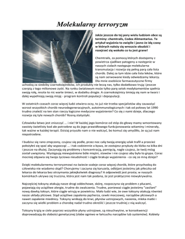 Molekularny terroryzm Jakże jeszcze do tej pory wielu ludziom obce są terminy: chemtrails, Codex Alimentarius. Te artykuł wyjaśnia to zwięźle i jasno że idą czasy w których należy się wreszcie obudzid i rozejrzed się wokoło co tu jest grane! Chemtrails, za pomocą których dostajemy z powietrza zjadliwe patogeny a następnie w naszych cialach następuje molekularna transmutacja i rozwija się pełną parą cała lista chorób. Dalej za tym idzie cała lista leków, które są nam serwowane kiedy odwiedzamy lekarzy. Dla mnie osobiście farmaceutyczne firmy uchodzą za siedziby czarnoksiężników, ich produkty nie leczą nas, tylko dodatkowo trują i jeszcze czerpią z tego milionowe zyski. Na rynku światowym może tylko parę setek medykamentów spełnia swoją rolę, reszta to nic warte śmieci, w dodatku drogie. A czarnoksiężnicy śmieją się nam w twarz i dalej wypełniają swoją misję - program kontroli populacji i depopulacji. W ostatnich czasach coraz więcej ludzi otwiera oczy, to już nie trzeba specjalistów aby zauważyd wzrost wszystkich chorób neurodegeneracyjnych, autoimmunologicznych i tak od połowy lat 1990 trudno znaleźd na ten stan rzeczy logiczne medyczne wyjaśnienie? Co się z nami dzieje, dlaczego rozwija się tyle nowych chorób? Rosną statystyki. Człowieka łatwo jest zniszczyd ... i nie! W każdej jego komórce od stóp do głowy mamy wmontowany swoisty świetlisty kod ale potrzebne są do jego prawidłowego funkcjonowania witaminy i minerały, tak ważne w każdej terapii. Dzisiaj przyszło nam o nie walczyd, bo komuś się umyśliło, że są już nam niepotrzebne. I budzisz się rano zmęczony, czujesz się podle, przez noc całą twoją energię szlak trafił a przecież położyłeś się spad aby wypocząd ... i tak codziennie a bywa, że zostajesz przykuty do łóżka na kilka dni i jeszcze na dłużej. Zaczynają się problemy z koncentracją, pamięcią, nagle czujesz, że twój mózg został uwięziony. Występują niewyjaśnione bóle mięśni, stawów i nie czujesz aby była to grypa. Coraz mocniej objawia się twoja życiowa nieudolnośd i ciągle brakuje wyjaśnienia - co się ze mną dzieje? Dzięki molekularnemu terroryzmowi na świecie szaleje coraz więcej chorób, które przychodzą do człowieka nie wiadomo skąd? Chorujemy i zaczyna się karuzela, odbijani jesteśmy jak piłeczka od lekarza do lekarza bez otrzymania jakiejkolwiek diagnozy? A odpowiedź jest prosta; w naszych komórkach ukrywa się trucizna, która jest nam tak podana, że jest praktycznie niewykrywalna. Najczęściej toksyny atakują nasze drogi oddechowe, skórę, rozpoczyna się problem z płucami, pojawiają się uciążliwe alergie, trudne do zwalczenia. Trudne, ponieważ ciągle jesteśmy "zasilani" nową dawką toksyn, które ciągle wirują w powietrzu. Mało ludzi wie, że owe toksyny atakują również nasze układy płciowe. Stąd uciążliwe zapalenia pęcherza, cewki moczowej, narządów płciowych a nawet zapalenie miednicy. Toksyny wnikają do krwi, płynów ustrojowych, nasienia, mleka matki i zaczyna się wielki problem a chorobę nadal trudno określid i jeszcze trudniej z nią walczyd. Toksyny krążą w ciele poprzez wszystkie płyny ustrojowe, są nieuchwytne, w konsekwencji doprowadzają do słabości genetycznej (słabe ogniwo w łaocuchu narządów lub systemów). Kobiety mają coraz większy problem z cyklem miesiączkowym, z ciążą. Jeśli toksyna wnika w rdzeo kręgowy dochodzi do uszkodzeo tkanki mózgowej; stąd brak pamięci, demencje, Alzheimer, Parkinson, choroba Creutzfeldta-Jakoba i zaburzenia funkcji poznawczych, wszystko zależy od obszaru mózgu, który został z terroryzowany toksyną. Podobnie ma się sprawa z cukrzycami, których ostatnio mnoży się jak grzybów po deszczu. Słabsze mamy serca, wątrobę, jelita. Coraz częściej objawia się schizofrenia, dwubiegunowe depresje. I tak po karuzeli z lekarzami, przetestowaniem wszystkich przez nich zalecanych leków, z bezsilności opadają nam ręce, co robid dalej? Należy bardzo starannie oczyścid ciało, robid to systematycznie, trucizny cały czas krążą w powietrzu, wodzie, w pożywieniu. Potrzebne są nam witaminy i odpowiednie suplementy, nie pozwólmy zabrad sobie naszych ziół, które od tysiącleci ratują nasze zdrowie. Nie wierzmy w cudowne przeciwbólowe działanie narkotyków serwowanych nam na każdą okazję. Te tylko tłumią problemy ale nie leczą, a jeszcze pogłębiają nasz i tak nieciekawy obraz naszego zdrowia. Zobaczmy co się dzieje na naszym rynku naturalnych leków? Ile obecnie kosztuje cynk, ile Echinacea (starożytne zioło na wzmocnienie układu immunologicznego)? Zobaczmy co zostało włożone na zakazaną listę a co jest nam polecane w zamian? Prawie każdego dnia pojawiają się nad naszymi głowami tajemnicze samoloty. Znaczą na niebie swoje smugi, coraz mocniej je zagęszczają. Tak się zastanawiam: ile nas kosztuje ten program? Tak, tak, niestety to są nasze wydatki! Latem podróżowałam sporo po Brytyjskiej Kolumbii i co zauważyłam; masowo wysychają lasy, nawet tam, gdzie nie ma przemysłu i sporadycznie docierają ludzie, lecz na tych bezludnych obszarach na niebie dostrzegłam dobrze znane mi ślady. Spryskiwanie to nie wszystko ....jesteśmy każdego dnia narażani na inne promieniowania poprzez naszą elektronikę i potężniejsze programy: MK-Ultra, Pandora. Czas, rozejrzyjmy się wokół, dowody mamy przed własnymi oczami. Popatrzmy na swoje telefony komórkowe - dodatkowy element kontroli naszego umysłu. Kontroli umysłu czy przymusu? Coraz częściej mówi się o implantach, póki co największy eksperyment trwa na zwierzętach. Macki czarnoksiężników rozszerzają się na inne dziedziny, coraz mocniej zaciskają się wokół nas i już nikt nie może uniknąd tego ataku. Tylko nasza masowa świadomośd może powstrzymad molekularny terroryzm. Tylko poprzez usunięcie szkodliwych substancji może zakoo