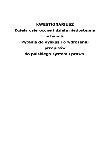 KWESTIONARIUSZ Dzieła osierocone i dzieła niedostępne w handlu Pytania do dyskusji o wdrożeniu przepisów do polskiego systemu prawa Warszawa, 30 kwietnia 2013 r. Centrum Cyfrowe Projekt: Polska w ubiegłym roku złożyło stanowisko w ramach konsultacji na temat projektu dyrektywy w sprawie niektórych dozwolonych możliwości wykorzystywania utworów osieroconych. W nowym kwestionariuszu MKiDN Centrum Cyfrowe jako członek Koalicji Otwartej Edukacji pragnie podzielić wspólne stanowisko złożone w ramach konsultacji, jak również zgłosić dodatkowe uwagi szczegółowe. 1. Dzieła osierocone 1. Jakie są główne problemy praktyczne, z punktu widzenia działalności Państwa organizacji lub jej członków związane z problemem dzieł osieroconych? Centrum Cyfrowe we własnej bieżącej działalności nie spotyka się z problemem dzieł osieroconych. Jednak podczas spotkań i debat w instytucjach kultury, słyszymy wiele głosów jak istotny jest to problem, zwłaszcza z perspektywy projektów 2| Strona digitalizacyjnych. Głosy te były również wyraźnie słyszalne na Forum Prawa Autorskiego w dniu 27 marca 2013 r. Spośród prac prowadzonych ostatnio przez Centrum Cyfrowe, w których wskazano na wagę problematyki dzieł osieroconych w procesach digitalizacyjnych, warto wskazać raport, który zakończył cykl warsztatów poświęconych problemom prawnym bibliotek: http://centrumcyfrowe.pl/projekty/reforma-prawa-autorskiego-dla-bibliotek/. Polecamy również Państwa uwadze notatkę z warsztatu o domenie publicznej, przeprowadzonego przez Centrum Cyfrowe w zeszłym roku. Notatkę przekazujemy jako załącznik do niniejszego kwestionariusza. Zwracamy uwagę, że problem dzieł osieroconych jest wynikiem zbyt długiego okresu ochrony przyznanego podmiotom praw autorskich i pokrewnych oraz braku formalności dla zaistnienia ochrony. Dlatego nie zostanie on wyeliminowany bez kompleksowej reformy systemu prawa autorskiego i praw pokrewnych na poziomie międzynarodowym. 2. Czy były przez Państwa podejmowane działania zmierzające do wyjaśnienia sytuacji prawnej utworów osieroconych? Czy ponosili Państwo koszty związane z digitalizacją i pozyskiwaniem utworów osieroconych? Czy takie działania były prowadzone z udziałem podmiotów trzecich np. na zasadzie partnerstwa publiczno-prywatnego? N/D 3. Jakie rodzaje utworów powinny zostać objęte zakresem regulacji polskiej? Czy są kategorie utworów w stosunku do których przeprowadzenie postępowań poszukiwawczych byłoby utrudnione lub niemożliwe? Wszystkie rodzaje utworów osieroconych powinny być objęte polskimi regulacjami ustawowymi, pod warunkiem, że byłyby to regulacje sprzyjające ich udostępnianiu i wykorzystaniu. Uważamy, że w zakresie wykorzystania utworów osieroconych przez instytucje dziedzictwa narodowego oraz w zakresie niekomercyjnym postępowania poszukiwawcze powinny być maksymalnie uproszczone. Tym samym polski katalog źródeł nie powinien być szerszy niż ten wskazany w Dyrektywie. Szczególnie utrudnione może być przeprowadzenie starannych poszukiwań w odniesieniu do utworów intencyjnie publikowanych anonimowo (w drugim obiegu) oraz utworów współautorskich, w tym szczególnie utworów audiowizualnych ze względu na wielość współtwórców oraz nonsensowne postępowanie polskiego ustawodawcy, który w kolejnych nowelizacjach prawa autorskiego przywracał ochronę prawną utworom, co do których prawa autorskie wygasły. W takich wypadkach należałoby rozważyć możliwość znacznego ograniczenia poszukiwań, tak aby nie stały one na drodze udostępnianiu takich utworów. 4. Na jakich polach eksploatacji powinno być umożliwione korzystanie z dzieł osieroconych? Czy katalog pól eksploatacji na których byłoby możliwe korzystanie z dzieł osieroconych powinien zostać zdefiniowany ustawowo? Korzystanie z utworów osieroconych powinno być możliwe na wszystkich polach eksploatacji z poszanowaniem praw osobistych nieznanego autora (w zakresie prawa do autorstwa należałoby dokładnie określić źródło pozyskania utworu z adnotacją „Autor nieznany”). W szczególności należy dopuścić wykorzystanie utworów osieroconych w celu tworzenia utworów zależnych przez wzgląd na dużą wartość kulturotwórczą tego typu działań. 5. Czy katalog podmiotów, które będą mogły korzystać z dzieł osieroconych w Polsce powinien być ograniczony jedynie do tych, które są wskazane w dyrektywie? Jakie podmioty powinny być brane pod uwagę przez polskiego ustawodawcę? 3| Strona Katalog podmiotów uprawnionych do korzystania z dzieł osieroconych nie powinien być w żaden sposób ograniczony, to jest zdecydowanie powinien wykraczać poza zakres wskazany w Dyrektywie i obejmować wszystkich zainteresowanych, tak instytucje non-profit, jak i użytkowników komercyjnych. 6. Czy przepisy polskie powinny ograniczyć się jedynie do umożliwienia korzystania z dzieł osieroconych w sposób niekomercyjny? Czy dopuszczenie przez ustawodawcę korzystania w sposób komercyjny z dzieł osieroconych powinno być w jakikolwiek sposób ograniczone? Polski ustawodawca powinien umożliwić korzystanie z dzieł osieroconych także w sposób komercyjny. Przy korzystaniu w celach komercyjnych należałoby przewidzieć konieczność wypłaty stosowanego wynagrodzenia, w przypadku odnalezienia twórcy lub jego spadkobierców oraz przewidzieć możliwość zakazania przez twórcę (jego spadkobierców) dalszego wykorzystania utworu. Uprawnienie to jednak nie powinno mieć pierwszeństwa przed zawartymi już umowami licencyjnymi oraz w żadnym wypadku nie powinno być możliwe zakazanie korzystania z dzieła, które stało się przedmiotem adaptacji. Żądanie zaprzestania korzystania jak i żądanie zapłaty wynagrodzenia nie powinny być dopuszczalne w przypadku wykorzystania niekomercyjnego, a w szczególności wykorzystania utworów przez instytucje publiczne, z zastrzeżeniem projektów 