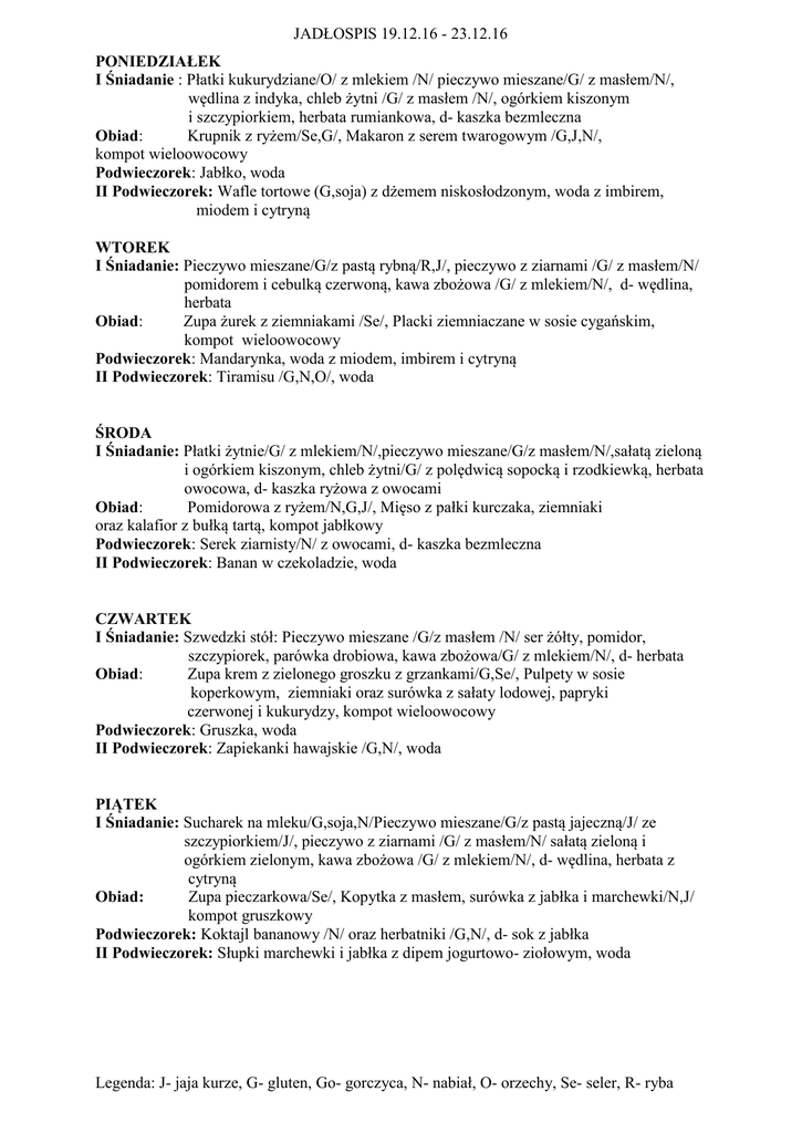 JADŁOSPIS 19.12.16 - 23.12.16 PONIEDZIAŁEK I Śniadanie : Płatki kukurydziane/O/ z mlekiem /N/ pieczywo mieszane/G/ z masłem/N/, wędlina z indyka, chleb żytni /G/ z masłem /N/, ogórkiem kiszonym i szczypiorkiem, herbata rumiankowa, d- kaszka bezmleczna Obiad: Krupnik z ryżem/Se,G/, Makaron z serem twarogowym /G,J,N/, kompot wieloowocowy Podwieczorek: Jabłko, woda II Podwieczorek: Wafle tortowe (G,soja) z dżemem niskosłodzonym, woda z imbirem, miodem i cytryną WTOREK I Śniadanie: Pieczywo mieszane/G/z pastą rybną/R,J/, pieczywo z ziarnami /G/ z masłem/N/ pomidorem i cebulką czerwoną, kawa zbożowa /G/ z mlekiem/N/, d- wędlina, herbata Obiad: Zupa żurek z ziemniakami /Se/, Placki ziemniaczane w sosie cygańskim, kompot wieloowocowy Podwieczorek: Mandarynka, woda z miodem, imbirem i cytryną II Podwieczorek: Tiramisu /G,N,O/, woda ŚRODA I Śniadanie: Płatki żytnie/G/ z mlekiem/N/,pieczywo mieszane/G/z masłem/N/,sałatą zieloną i ogórkiem kiszonym, chleb żytni/G/ z polędwicą sopocką i rzodkiewką, herbata , owocowa, d- kaszka ryżowa z owocami Obiad: Pomidorowa z ryżem/N,G,J/, Mięso z pałki kurczaka, ziemniaki oraz kalafior z bułką tartą, kompot jabłkowy Podwieczorek: Serek ziarnisty/N/ z owocami, d- kaszka bezmleczna II Podwieczorek: Banan w czekoladzie, woda CZWARTEK I Śniadanie: Szwedzki stół: Pieczywo mieszane /G/z masłem /N/ ser żółty, pomidor, szczypiorek, parówka drobiowa, kawa zbożowa/G/ z mlekiem/N/, d- herbata Obiad: Zupa krem z zielonego groszku z grzankami/G,Se/, Pulpety w sosie koperkowym, ziemniaki oraz surówka z sałaty lodowej, papryki czerwonej i kukurydzy, kompot wieloowocowy Podwieczorek: Gruszka, woda II Podwieczorek: Zapiekanki hawajskie /G,N/, woda PIĄTEK I Śniadanie: Sucharek na mleku/G,soja,N/Pieczywo mieszane/G/z pastą jajeczną/J/ ze szczypiorkiem/J/, pieczywo z ziarnami /G/ z masłem/N/ sałatą zieloną i ogórkiem zielonym, kawa zbożowa /G/ z mlekiem/N/, d- wędlina, herbata z cytryną Obiad: Zupa pieczarkowa/Se/, Kopytka z masłem, surówka z jabłka i marchewki/N,J/ kompot gruszkowy Podwieczorek: Koktajl bananowy /N/ oraz herbatniki /G,N/, d- sok z jabłka II Podwieczorek: Słupki marchewki i jabłka z dipem jogurtowo- ziołowym, woda Legenda: J- jaja kurze, G- gluten, Go- gorczyca, N- nabiał, O- orzechy, Se- seler, R- ryba Koktajl bananowo-czekoladowy: 200ml mleko 2% 50g banan 5 g kakao naturalne Wszystkie składniki zblendować. Tiramisu: 10g Herbatniki (dla diety bezglutenowej ciasteczka bezglutenowe) 3-4 łyżki Jogurt naturalny 2% (dla diety bezmlecznej jogurt sojowy) 5 g Kakao naturalne Garść orzechów włoskich/płatków migdałów (dla diety bez orzechów pominąć, dodać więcej herbatników) Warstwowo układać pokruszone herbatniki, jogurt naturalny wymieszany z kakao, orzechy/płatki migdałów i ponownie herbatniki, jogurt z kakao i orzechy/płatki migdałów. Powtarzać do wyczerpania składników Pasta rybna: 1 puszka filetów śledziowych w sosie pomidorowym 120 ml przecieru pomidorowego 2 jajka /ser twarogowy 1 ząbek czosnku 1 mała czerwona cebulka 1 łyżeczka bazylii Pieprz, sól Jajka należy ugotować na twardo, ostudzić i rozgnieść widelcem. Można też zastąpić jaja serem twarogowym. Do miseczki dodaj filety śledziowe z puszki wraz z sosem pomidorowym i również rozgniatać je widelcem. Następnie do miseczki dodać 120 ml przecieru pomidorowego, przeciśnięty przez praskę ząbek czosnku, pokrojoną drobno czerwoną cebulkę, rozgniecione jajka, 1 łyżeczkę suszonej bazylii i wszystko dokładnie wymieszać. Doprawić solą i pieprzem.