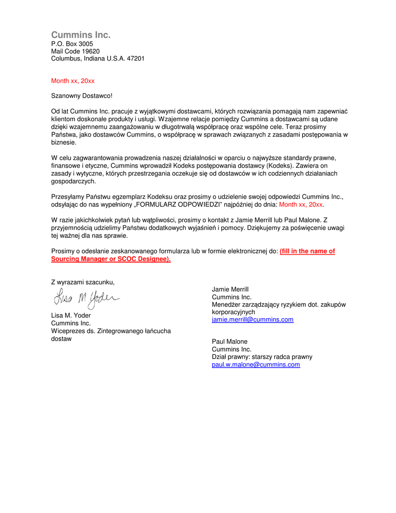 Cummins Inc. P.O. Box 3005 Mail Code 19620 Columbus, Indiana U.S.A. 47201 Month xx, 20xx Szanowny Dostawco! Od lat Cummins Inc. pracuje z wyjątkowymi dostawcami, których rozwiązania pomagają nam zapewniać klientom doskonałe produkty i usługi. Wzajemne relacje pomiędzy Cummins a dostawcami są udane dzięki wzajemnemu zaangażowaniu w długotrwałą współpracę oraz wspólne cele. Teraz prosimy Państwa, jako dostawców Cummins, o współpracę w sprawach związanych z zasadami postępowania w biznesie. W celu zagwarantowania prowadzenia naszej działalności w oparciu o najwyższe standardy prawne, finansowe i etyczne, Cummins wprowadził Kodeks postępowania dostawcy (Kodeks). Zawiera on zasady i wytyczne, których przestrzegania oczekuje się od dostawców w ich codziennych działaniach gospodarczych. Przesyłamy Państwu egzemplarz Kodeksu oraz prosimy o udzielenie swojej odpowiedzi Cummins Inc., odsyłając do nas wypełniony „FORMULARZ ODPOWIEDZI” najpóźniej do dnia: Month xx, 20xx. W razie jakichkolwiek pytań lub wątpliwości, prosimy o kontakt z Jamie Merrill lub Paul Malone. Z przyjemnością udzielimy Państwu dodatkowych wyjaśnień i pomocy. Dziękujemy za poświęcenie uwagi tej ważnej dla nas sprawie. Prosimy o odesłanie zeskanowanego formularza lub w formie elektronicznej do: (fill in the name of Sourcing Manager or SCOC Designee). Z wyrazami szacunku, Lisa M. Yoder Cummins Inc. Wiceprezes ds. Zintegrowanego łańcucha dostaw Jamie Merrill Cummins Inc. Menedżer zarządzający ryzykiem dot. zakupów korporacyjnych [email protected] Paul Malone Cummins Inc. Dział prawny: starszy radca prawny [email protected] FORMULARZ ODPOWIEDZI DOSTAWCY ZASADY DOTYCZĄCE KODEKSU POSTĘPOWANIA DOSTAWCY CUMMINS INC. (Prosimy o wydrukowanie jednego egzemplarza niniejszego formularza w celu jego podpisania i wysłania). Nazwa dostawcy: : W każdym kraju, w którym prowadzimy działalność, działamy zgodnie z prawem, a także zgodnie z wszystkimi innymi przepisami i regulacjami, w tym dotyczącymi prawa pracy, bezpieczeństwa i higieny pracy pracowników oraz ochrony środowiska. Ponadto przestrzegamy zasady Kodeksu postępowania dostawcy Cummins Inc. oraz jesteśmy zaangażowani w ich dalsze przestrzeganie. Prawidłowość naszego działania jest zapewniona na mocy naszego własnego Kodeksu postępowania, który zawiera normy dotyczące prawa pracy, bezpieczeństwa i higieny pracy pracowników i ochrony środowiska, które są zgodne z zasadami zawartymi w Kodeksie postępowania dostawcy Cummins Inc. (Prosimy o przesłanie jednego egzemplarza wraz z niniejszym Formularzem odpowiedzi). Nie stosujemy się do następujących oczekiwań zawartych w Kodeksie postępowania dostawcy Cummins Inc.: (Proszę przedstawić listę kwestii i wskazać swoje plany ich rozwiązania). 1) 2) 3) Nie działamy zgodnie z oczekiwaniami zawartymi w Kodeksie postępowania dostawcy Cummins Inc. i nie planujemy takiego działania. Przedstawiciel dostawcy: Imię i nazwisko drukiem: : Przedstawiciel dostawcy: Podpis: : Przedstawiciel dostawcy: Stanowisko: : Data: : Prosimy o odesłanie odpowiedzi w formie elektronicznej do: (email address of Sourcing Manager or SCOC Designee). lub pocztą na adres: (Name and Address of Sourcing Manager or SCOC Designee).