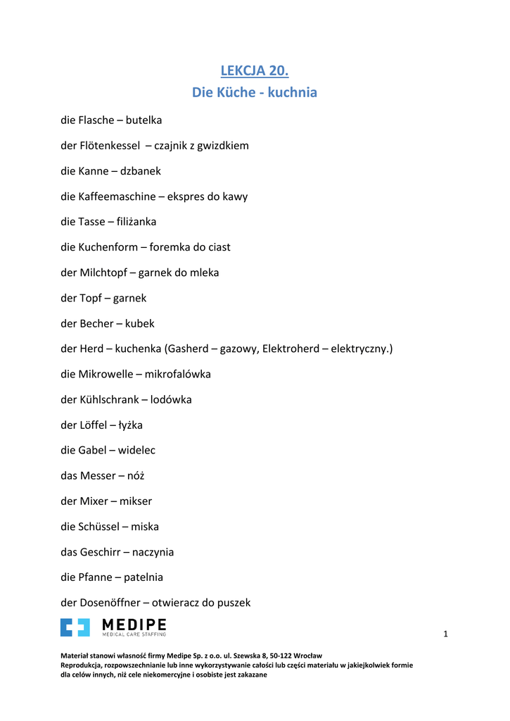 LEKCJA 20. Die Küche - kuchnia die Flasche – butelka der Flötenkessel – czajnik z gwizdkiem die Kanne – dzbanek die Kaffeemaschine – ekspres do kawy die Tasse – filiżanka die Kuchenform – foremka do ciast der Milchtopf – garnek do mleka der Topf – garnek der Becher – kubek der Herd – kuchenka (Gasherd – gazowy, Elektroherd – elektryczny.) die Mikrowelle – mikrofalówka der Kühlschrank – lodówka der Löffel – łyżka die Gabel – widelec das Messer – nóż der Mixer – mikser die Schüssel – miska das Geschirr – naczynia die Pfanne – patelnia der Dosenöffner – otwieracz do puszek 1 Materiał stanowi własność firmy Medipe Sp. z o.o. ul. Szewska 8, 50-122 Wrocław Reprodukcja, rozpowszechnianie lub inne wykorzystywanie całości lub części materiału w jakiejkolwiek formie dla celów innych, niż cele niekomercyjne i osobiste jest zakazane die Pfanne – patelnia der Backofen – piekarnik der Brotkasten – chlebak das Spülmittel – płyn do naczyń das Sieb – sito der Küchenschrank – szafa kuchenna das Glas – szklanka das Besteck – sztućce die Besteckschublade – szuflada na sztućce der Teller – talerz flacher Teller – duży talerz der Suppenteller – talerz głęboki der Toaster – toster der Schlagbesen – trzepaczka das Spülbecken – zlewozmywak der Geschirrspüler/ die Geschirrspülmaschine – zmywarka die Küchenmaschine – robot kuchenny der Teller mit Essen – talerz z jedzeniem der Grill – grill würzen – doprawić pfeffern – pieprzyć salzen – solić 2 Materiał stanowi własność firmy Medipe Sp. z o.o. ul. Szewska 8, 50-122 Wrocław Reprodukcja, rozpowszechnianie lub inne wykorzystywanie całości lub części materiału w jakiejkolwiek formie dla celów innych, niż cele niekomercyjne i osobiste jest zakazane kochen – gotować essen – jeść mischen – mieszać die Kartoffeln schälen – obierać ziemniaki einen Kuchen backen – piec ciasto schmecken – smakować braten – smażyć backen – piec das Geschirr abtrocknen – wytrzeć naczynia das Geschirr spülen – zmywać naczynia Przysłowia: Alle guten Dinge sind drei. – Do trzech razy sztuka. Die Geschmäcker sind verschieden. – Gusta są różne. 3 Materiał stanowi własność firmy Medipe Sp. z o.o. ul. Szewska 8, 50-122 Wrocław Reprodukcja, rozpowszechnianie lub inne wykorzystywanie całości lub części materiału w jakiejkolwiek formie dla celów innych, niż cele niekomercyjne i osobiste jest zakazane