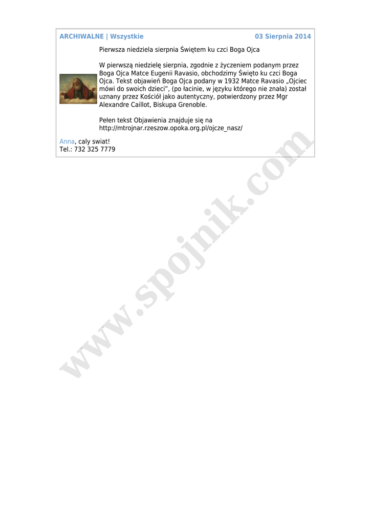 ARCHIWALNE | Wszystkie 03 Sierpnia 2014 Pierwsza niedziela sierpnia Świętem ku czci Boga Ojca W pierwszą niedzielę sierpnia, zgodnie z życzeniem podanym przez Boga Ojca Matce Eugenii Ravasio, obchodzimy Święto ku czci Boga Ojca. Tekst objawień Boga Ojca podany w 1932 Matce Ravasio „Ojciec mόwi do swoich dzieci”, (po łacinie, w języku ktόrego nie znała) został uznany przez Kościόł jako autentyczny, potwierdzony przez Mgr Alexandre Caillot, Biskupa Grenoble. Pełen tekst Objawienia znajduje się na http://mtrojnar.rzeszow.opoka.org.pl/ojcze_nasz/ w w w .s po jn ik .c o m Anna, caly swiat! Tel.: 732 325 7779