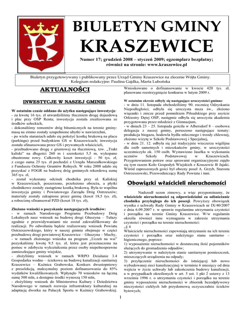 BIULETYN GMINY KRASZEWICE Numer 17; grudzień 2008 – styczeń 2009; egzemplarz bezpłatny; również na stronie: www.kraszewice.pl Biuletyn przygotowywany i publikowany przez Urząd Gminy Kraszewice na zlecenie Wójta Gminy. Kolegium redakcyjne: Paulina Gajdka, Marta Lubońska Wnioskowano o dofinansowanie w kwocie 420 tys. zł, planowane rozstrzygnięcie konkursu w lutym 2009 r. AKTUALNOŚCI W ostatnim okresie odbyły się następujące uroczystości gminne: INWESTYCJE W NASZEJ GMINIE - w dniu 11. listopada obchodziliśmy 90. rocznicę Odzyskania Niepodległości; odbyła się uroczysta msza św., złożono wiązanki i znicze przed pomnikiem Piłsudskiego przy asyście Orkiestry Dętej OSP, następnie odbyła się uroczysta akademia przygotowana przez młodzież z Gimnazjum, - w dniach 23 – 25. listopada gościła w Albersdorf 8 – osobowa delegacja z naszej gminy, poruszono następujące tematy: produkcja biogazu, hodowla bydła mlecznego i trzody chlewnej, złożono wizytę w Szkole Podstawowej i Specjalnej, - w dniu 21. 12. odbyła się już tradycyjnie wieczerza wigilijna dla osób samotnych i mieszkańców gminy, w uroczystości uczestniczyło ok. 150 osób. Wystawiono Jasełka w wykonaniu uczniów Szkoły Podstawowej w Kraszewicach. Przygotowaniem potraw oraz sprawami organizacyjnymi zajęło się tym razem Koło Gospodyń Wiejskich z Kraszewic B Jajaki. Wśród zaproszonych gości był obecny poseł A. Grzyb, Starosta Ostrzeszowski, Przewodniczący Rady Powiatu i inni. W ostatnim czasie oddano do użytku następujące inwestycje: - za kwotę 16 tys. zł utwardziliśmy tłuczniem drogę dojazdową i plac przy OSP Renta; inwestycja została zrealizowana ze środków sołeckich, - dokonaliśmy remontów dróg bitumicznych na terenie gminy: masą na zimno zostały uzupełnione ubytki w nawierzchni, - po wielu staraniach udało się położyć kostkę brukową na placu (parkingu) przed budynkiem GS w Kraszewicach; inwestycja została sfinansowana przez GS i prywatnych właścicieli, - przebudowano drogę z gruntowej na tłuczniową, tzw. „Trakt kaliski” na długości 260 m i szerokości 5,5 m, wykopano obustronne rowy. Całkowity koszt inwestycji - 50 tys. zł, z czego suma 25 tys. zł pochodzi z Urzędu Marszałkowskiego z Funduszu Ochrony Gruntów Rolnych. W roku 2008 udało się pozyskać z FOGR na budowę dróg gminnych rekordową sumę 365 tys. zł, - został wykonany odcinek chodnika przy ul. Kaliskiej w Kraszewicach, poszerzono, przełożono obrzeża, a płytki chodnikowe zostały zastąpione kostką brukową. Była to wspólna inwestycja gminy i Powiatowego Zarządu Dróg Ostrzeszów; materiały zostały zakupione przez gminę (koszt 18,5 tys. zł), a robociznę sfinansował PZD (koszt 18 tys. zł), Obowiązki właścicieli nieruchomości Nadszedł sezon zimowy, a więc przypominamy, że właściciele nieruchomości są odpowiedzialni za odśnieżanie chodnika przyległego do ich posesji. Powyższy obowiązek wynika z uchwały Rady Gminy w Kraszewicach nr IX/40/2007 z dnia 6.09.2007 r. w sprawie regulaminu utrzymania czystości i porządku na terenie Gminy Kraszewice. W/w regulamin określa również inne wymagania w zakresie utrzymania czystości i porządku na terenie nieruchomości: „§ 4 Właściciele nieruchomości zapewniają utrzymanie na ich terenie czystości i porządku oraz należytego stanu sanitarno – higienicznego, poprzez: 1) wyposażenie nieruchomości w dostateczną ilość pojemników służących do gromadzenia odpadów; 2) utrzymywanie w należytym stanie sanitarnym pomieszczeń, mieszczących urządzenia na odpady; 3) przyłączenie nieruchomości do istniejącej lub nowo wybudowanej sieci kanalizacyjnej w terminie 6 miesięcy od dnia wejścia w życie uchwały lub zakończenia budowy kanalizacji, a w przypadkach określonych w art. 5 ust. 1 pkt 2 ustawy z 13 września 1996 r. o utrzymaniu czystości i porządku na terenie gminy wyposażenie nieruchomości w zbiornik bezodpływowy nieczystości ciekłych lub przydomową oczyszczalnie ścieków bytowych; Złożono wnioski o pozyskanie następujących środków: - w ramach Narodowego Programu Przebudowy Dróg Lokalnych nasz wniosek na budowę drogi Głuszyna – Tułazy zgodnie z przewidywaniami nie został zakwalifikowany do realizacji. Po odwołaniu będzie realizowany wniosek Powiatu Ostrzeszowskiego, który w naszej gminie obejmuje w części przebudowę drogi powiatowej Kraszewice – Głuszyna – Muchy, - w ramach złożonego wniosku na program „Uczeń na wsi” pozyskaliśmy kwotę 9,5 tys. zł, która jest przeznaczona na pomoc w zdobyciu wykształcenia przez osoby niepełnosprawne zamieszkujące gminy wiejskie, - złożyliśmy wniosek w ramach WRPO Działanie 3.4 Gospodarka wodno – ściekowa na budowę kanalizacji sanitarnej Kraszewice – Kuźnica Grabowska. Konkurs dwustopniowy z preselekcją, maksymalny poziom dofinansowania do 85% wydatków kwalifikowanych. Wpłynęło 70 wniosków na łączną sumę 500 mln, a dostępne środki wynoszą 150 mln, - złożyliśmy wniosek do Ministerstwa Kultury i Dziedzictwa Narodowego w ramach rozwoju infrastruktury kulturalnej na adaptację dworku na Pałacyk Sportu w Kuźnicy Grabowskiej. 1 4) uprzątanie błota, śniegu, lodu i innych zanieczyszczeń części nieruchomości udostępnionych do użytku publicznego oraz chodników przylegających do użytku publicznego oraz z chodników przylegających bezpośrednio do nieruchomości, usuwanie błota, śniegu i lodu powinno odbywać się niezwłocznie, natomiast innych zanieczyszczeń w miarę potrzeby, 5) usuwanie nawisów (sopli) z okapów, rynien i innych części nieruchomości; 6) niezwłoczne usuwanie z terenu nieruchomości materiału rozbiórkowego i resztek materiałów budowlanych, powstałych w wyniku remontu i modernizacji lokali i budynków; 7) wykaszanie przynajmniej jeden raz w roku terenów (gruntów) porośniętych chwastami. §5 Na terenie gminy, mając na uwadze zasady utrzyma