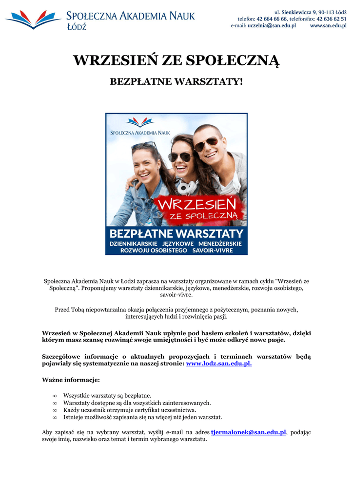 WRZESIEŃ ZE SPOŁECZNĄ BEZPŁATNE WARSZTATY! Społeczna Akademia Nauk w Łodzi zaprasza na warsztaty organizowane w ramach cyklu "Wrzesień ze Społeczną". Proponujemy warsztaty dziennikarskie, językowe, menedżerskie, rozwoju osobistego, savoir-vivre. Przed Tobą niepowtarzalna okazja połączenia przyjemnego z pożytecznym, poznania nowych, interesujących ludzi i rozwinięcia pasji. Wrzesień w Społecznej Akademii Nauk upłynie pod hasłem szkoleń i warsztatów, dzięki którym masz szansę rozwinąć swoje umiejętności i być może odkryć nowe pasje. Szczegółowe informacje o aktualnych propozycjach i terminach warsztatów będą pojawiały się systematycznie na naszej stronie: www.lodz.san.edu.pl. Ważne informacje: • • • • Wszystkie warsztaty są bezpłatne. Warsztaty dostępne są dla wszystkich zainteresowanych. Każdy uczestnik otrzymuje certyfikat uczestnictwa. Istnieje możliwość zapisania się na więcej niż jeden warsztat. Aby zapisać się na wybrany warsztat, wyślij e-mail na adres [email protected], podając swoje imię, nazwisko oraz temat i termin wybranego warsztatu. Co wolno wojewodzie...czyli dobre maniery w biurze i biznesie Jak często zdarza nam się czuć zakłopotanym w sytuacji kiedy najmniej byśmy tego chcieli? Wiedzy z zakresu savoir-vivre’u nie da się przecenić. Im większą posiadamy, tym łatwiej poruszać się jak „ryba w wodzie” zarówno w salonach wyższych sfer, jak i w szklanych biurowcach. Wiedza, jak wręczyć prezent, kogo przepuścić w drzwiach czy jakim widelcem zabrać się za wykwintne danie, często otwiera nam drzwi do kariery, życiowego sukcesu, a nawet serca osoby, na której nam zależy. Prowadzący: Joanna Wiśniewska-Mikosik Termin: 15 września 2015 (wtorek), godz. 16:00-19:00 Miejsce: Społeczna Akademia Nauk, Łódź, ul. Kilińskiego 109 (sala L9) Jak rozpoznać kompetencje menedżerskie? Czy aby być menedżerem, trzeba posiadać nadprzyrodzone moce lub przynajmniej wyjątkowe kompetencje? Zapraszamy na warsztat dotyczący analizy kompetencji menedżerskich. Sprawdź, czy masz w sobie potencjał do kierowania zespołem. Każdy chciałby być kompetentnym pracownikiem i kierownikiem, ale co to właściwie oznacza? Jak określa się kompetencje i jak można je zmierzyć? Uczestnictwo w warsztacie pozwoli na lepsze poznanie swoich umiejętności oraz na definiowanie i prezentowanie swoich silnych stron. Dzięki temu przekonasz innych do współpracy, używając konkretnych argumentów. Pokażemy Ci, jak odkrywać swoje atuty, a przede wszystkim jak je efektywnie wykorzystać. Prowadzący: Anna Sołtys i Michał Skorzycki Termin: 17 września 2015 (czwartek), godz. 16.00-20.00 Miejsce: Społeczna Akademia Nauk, Łódź, ul. Kilińskiego 109 (sala L9) Dziennikarstwo prasowe i internetowe Warsztat na celu przybliżenie uczestnikom praktycznych informacji dotyczących specyfiki dziennikarstwa prasowego i internetowego. Powiemy o tym, jak we współczesnym dziennikarstwie zdobywane są informacje oraz omówimy sposób pisania i redagowania materiałów. Spróbujemy też odpowiedzieć na pytania, jaki wpływ na dzienniki i tygodniki ma rozwój Internetu, czym charakteryzuje się reportaż prasowy (czy to dziennikarstwo czy już literatura) oraz na czym polega specyfika dziennikarstwa śledczego (dlaczego jest domeną dziennikarzy prasowych). Podczas zajęć uczestnicy przećwiczą zdobytą wiedzę w praktyce. Prowadzący: Piotr Wesołowski Termin: 19 września 2015 (sobota), godz. 11:00-14:00 Miejsce: Społeczna Akademia Nauk, Łódź, ul. Kilińskiego 98 (sala P-42) THREE, FREE , czy może TREE? - pułapki angielskiej wymowy Mówisz po angielsku, ale czy zawsze masz pewność, że jesteś dobrze rozumiany przez innych? Czy może powiedziałeś coś śmiesznego albo niestosownego? Proponowany warsztat może Ci pomóc uniknąć kłopotów w kontaktach po angielsku– za granicą, w relacjach prywatnych lub w pracy. Zapraszamy na zajęcia z wykorzystaniem przykładów i analizy możliwych nieporozumień. Prowadzący: Karol Kurzejamski Termin: 22 września 2015 (wtorek), godz. 16:00-19:00 Miejsce: Społeczna Akademia Nauk, Łódź, ul. Kilińskiego 109 (sala L9) Jak radzić sobie ze stresem? Stres jest zjawiskiem powszechnym. Kojarzy się z przyspieszonym tętnem, lękiem, bezsennością. Brak umiejętności radzenia sobie z nim uznawany jest za jedną z głównych przyczyn chorób nękających współczesnego człowieka. Jednocześnie, wbrew powszechnej opinii stres sam w sobie nie musi być zjawiskiem negatywnym. Podnosi poziom energii, mobilizuje do działania. Sprzyja zadaniom, których w sytuacji stresowo neutralnej nie bylibyśmy w stanie wykonać. Zapraszam na warsztat, w trakcie którego poprzez odrobinę teorii i ćwiczenia praktyczne oswoisz pojęcie stresu i poznasz efektywne strategie zarządzania nim. Prowadzący: Martyna Kaflik-Pieróg Termin: 24 września 2015 (czwartek), godz. 16.00-20.00 Miejsce: Społeczna Akademia Nauk, Łódź, ul. Kilińskiego 109 (sala L9)