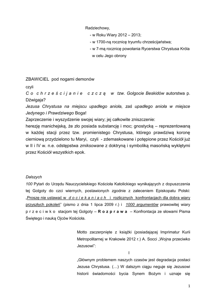 Radziechowy, - w Roku Wiary 2012 – 2013; - w 1700-ną rocznicę tryumfu chrześcijaństwa; - w 7-mą rocznicę powołania Rycerstwa Chrystusa Króla w celu Jego obrony ZBAWICIEL pod nogami demonów czyli Co ch r ze ś c ija n ie c zc zą w tzw. Golgocie Beskidów autorstwa p. Dźwigaja? Jezusa Chrystusa na miejscu upadłego anioła, zaś upadłego anioła w miejsce Jedynego i Prawdziwego Boga! Zaprzeczenie i wyszydzenie swojej wiary; jej całkowite zniszczenie: herezję manichejską, że zło posiada substancję i moc; gnostycką – reprezentowaną w każdej stacji przez tzw. promienistego Chrystusa, którego prawdziwą koronę cierniową przydzielono tu Maryi, czyli - zdemaskowane i potępione przez Kościół już w II i IV w. n.e. odstępstwa zmiksowane z doktryną i symboliką masońską wyklętymi przez Kościół wszystkich epok. Dalszych 100 Pytań do Urzędu Nauczycielskiego Kościoła Katolickiego wynikających z dopuszczenia tej Golgoty do czci wiernych, postawionych zgodnie z zaleceniem Episkopatu Polski: „Proszę nie ustawać w d o c i e k a n i a c h i rozlicznych konfrontacjach dla dobra wiary przyszłych pokoleń” (pismo z dnia 1 lipca 2009 r.) i 1000 argumentów prawowitej wiary p r z e c i w k o stacjom tej Golgoty – R o z p r a w a – Konfrontacja ze słowami Pisma Świętego i nauką Ojców Kościoła. Motto zaczerpnięte z książki (posiadającej Imprimatur Kurii Metropolitarnej w Krakowie 2012 r.) A. Socci „Wojna przeciwko Jezusowi”: I „Głównym problemem naszych czasów jest degradacja postaci Jezusa Chrystusa. (…) W dalszym ciągu neguje się Jezusowi historii świadomości bycia Synem Bożym i uznaje się 1 autentyczność jedynie tych słów, które równie dobrze mógł wypowiedzieć jakikolwiek współczesny Mu rabin” (słowa kard. Ratzingera wypowiedziane 6 października 2001 r. na synodzie biskupów). II Zarówno w świecie, jak i w Kościele panuje wielkie zamieszanie, które dotyczy wiary. Nieraz nasuwa mi się tajemnicze pytanie Jezusa z Ewangelii Św. Łukasza: „Czy Syn Człowieczy znajdzie wiarę na ziemi, gdy przyjdzie? Czasem ukazują się książki (tu zaś zrobiono 14 stacji -przypis autorki), w których wiara robi krok w tył w kluczowych kwestiach, a jednak episkopaty milczą i nikt nie widzi w tych książkach nic dziwnego (..) Kiedy obserwuję świat katolicki uderza mnie, że czasami zdaje się w nim przeważać myśl niekatolicka, a może dojść do tego, że ów niekatolicki pogląd w łonie katolicyzmu stanie się poglądem dominującym. Jednak to nigdy nie będzie pogląd Kościoła. Trzeba, żeby zawsze istniało małe stado, bez względu na to, jak będzie ono małe”. papież Paweł VI Słowa te wypowiedziane na krótko przed śmiercią okazują się być prawdziwym proroctwem, jeśli chodzi o zaistnienie, poświęcenie 12 września 2009 r. i oddanie do czci przez biskupa miejsca tzw. Golgoty Beskidów w Radziechowach na górze Matysce, która nie jest niczym innym, jak tylko nieudolną manifestacją masońskiego gnostycyzmu i manicheizmu, a co za tym idzie w 100% niekatolicką, odstępczą w każdym calu – nic bowiem nie pozostawiono nietkniętego i świętego! i jako taka została na łono katolicyzmu przyjęta i zatwierdzona do czci, zaś autor odebrał sowitą zapłatę, pochwały i nagrody, za „coś” co nawet w myśl obowiązującego prawa świeckiego jest przestępstwem! Obraza uczuć religijnych czym są dla chrześcijan te utopione w herezji i symbolice masońskiej stacje Męki Pańskiej, podlega karze zgodnie z art. 196 Kodeksu Karnego! Jak to możliwe, że umyka to uwadze osób duchownych odpowiedzialnych przed samym Bogiem!, za zachowanie wiary apostolskiej nieskalaną i nienaruszoną? Jak to możliwe, że poświęcono i oddano do czci treści (tych stacji) niezgodne i całkowicie sprzeczne z obowiązującym Katechizmem Kościoła Katolickiego!!!???, co zgodnie z prawem kanonicznym, powoduje grzech herezji i apostazji, który ipso facto, przez sam fakt sprzeciwiania się uznanej prawdzie chrześcijańskiej podlega ekskomunice!!! 2 Czy można zatem czcić przestępstwo i grzech ? Czy godzi się czcić lub polecać do czci podeptanie Syna Bożego, czy można czcić zaprzeczenie Jego Boskości, które jest nieodpuszczalnym grzechem przeciwko Duchowi Świętemu, a które ma tu miejsce? Czy można czcić Niepokalaną pierworodnego i od najmniejszej skazy Matkę Boga zachowaną od grzechu grzechu, ale tu bezczelnie posadzoną pod skrzydłami nietoperza (stacja XIII) – symbolizującymi od zawsze ciemności, zło i szatana, jakby ta Najczystsza Boża Lilia miała coś z nimi wspólnego?! Czy godzi się czcić Maryję z Jezusem na Swym łonie, zamiast pod krzyżem, to pod znakiem rozpoznawczym satanistów!?, zamiast pod ramionami Świętego Krzyża to pod skrzydłami, symbolu ciemności!!!? Czy można oddawać cześć Chrystusowi w scenie zwyciężającego Go lucyfera!, albo w scenie złożenia Go w aż podwójnie symbolizującym piekło, grobie (stacja XIV), w wyrazie bezsilności i bezradności otwartych i rozłożonych rąk, czego nawet mumiom egipskim nie czyniono?! Jak to możliwe, że zauważalne tu gołym okiem herezje – już w pierwszych wiekach przez Kościół potępione, i aż nadto jaskrawa kpina i szyderstwo z podstawowych prawd wiary i Najświętszych Osób Jezusa i Maryi, zostało poświęcone na łonie Kościoła, a powinno być odrzucone i potępione!? Odkąd to chrześcijanie dziękują, a nadto czczą podeptanie Chrystusa i swojej wiary? Czyż ich pierwszym i świętym obowiązkiem nie jest Jego obrona? Czy kapłani już nie płoną gorliwością o chwałę Chrystusa i Jego Matki, tutaj, jak nigdzie na świecie sponiewieraną?, a łatwo przystają na chwałę lucyfera? „Dziś – można odpowiedzieć słowami ks. Edwarda Stańka z 24 numeru „Źródła” 2005 roku – apologia (tj. obrona wiary) koncentruje się głównie na uchylaniu zarzutów wobec ludzi Kościoła, którzy swy
