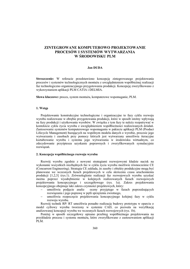 ZINTEGROWANE KOMPUTEROWO PROJEKTOWANIE PROCESÓW I SYSTEMÓW WYTWARZANIA W ŚRODOWISKU PLM Jan DUDA Streszczenie: W referacie przedstawiono koncepcję zintegrowanego projektowania procesów i systemów technologicznych montażu z uwzględnieniem współbieżnej realizacji faz technologiczno organizacyjnego przygotowania produkcji. Koncepcję zweryfikowano z wykorzystaniem aplikacji PLM CATIA i DELMIA. Słowa kluczowe: proces, system montażu, komputerowe wspomaganie, PLM. 1. Wstęp Projektowanie konstrukcyjne technologiczne i organizacyjne to fazy cyklu rozwoju wyrobu realizowane w obrębie przygotowania produkcji, które w sposób istotny wpływają na fazy produkcji i użytkowania wyrobów. W związku z tym fazy te należy rozpatrywać w kontekście cyklu życia wyrobu z uwzględnieniem współbieżności realizowanych działań. Zastosowanie systemów komputerowego wspomagania w pakiecie aplikacji PLM (Product Lifecycle Management) bazujących na wspólnym modelu danych o wyrobie, procesie jego wytwarzania i zasobach przy pomocy których jest wytwarzany umożliwia iteracyjne kształtowanie wyrobu i systemu jego wytwarzania w środowisku wirtualnym, co zdecydowanie przyśpiesza uzyskanie poprawnych i zweryfikowanych symulacyjnie rozwiązań. 2. Koncepcja współbieżnego rozwoju wyrobu Rozwój wyrobu zgodnie z nowymi strategiami rozwojowymi kładzie nacisk na wykonanie wszystkich niezbędnych faz w cyklu życia wyrobu możliwie równocześnie CE (Concurrent Engineering). Strategia CE zakłada, że zasoby i obiekty produkcyjne mogą być planowane we wczesnych fazach projektowych w celu skrócenia czasu uruchomienia produkcji [1,2,3] (rys.1). Zrównoleglenie realizacji faz rozwojowych wyrobu uzyskać można poprzez wyodrębnienie w kolejnych realizowanych fazach rozwojowych projektowania koncepcyjnego i szczegółowego (rys. 1a). Zakres projektowania koncepcyjnego obejmuje taki zakres czynności projektowych, który: − umożliwia podjęcie analiz oceny przyjętego w fazach poprzedzających rozwiązania i jego poprawę w pętli sprzężenia zwrotnego, − umożliwia rozpoczęcie projektowania koncepcyjnego kolejnej fazy w cyklu rozwoju wyrobu. Rozwój technik RP/ RT umożliwia ponadto realizację budowy prototypu w oparciu o model cyfrowy wyrobu tworzony w systemie CAD, co pozwala na weryfikację analizowanej koncepcji wyrobu we wczesnych fazach rozwojowych (rys. 1b). Poniżej w sposób szczegółowy opisano przebieg współbieżnego projektowania na przykładzie procesu i systemu montażu, które zweryfikowano z zastosowaniem aplikacji PLM. 360 a) b) Rys. 1. Sekwencyjna a) i współbieżna b) realizacja faz rozwojowych wyrobu Postęp umożliwiający realizację strategii rozwojowych w projektowaniu procesów i systemów wytwarzania wskazuje na konieczność integracji realizacji faz rozwojowych. Integracja w realizacji faz projektowania konstrukcyjno technologicznego wskazuje na konieczność wyodrębnienia: − fazy koncepcyjnej projektowania technologicznego (ETAP III A). Zasadniczym celem fazy koncepcyjnej jest określenie, dla zdefiniowanej na etapie projektowania konstrukcyjnego postaci konstrukcyjnej wyrobu, wariantów procesu technologicznego. − fazy szczegółowej projektowania technologicznego (ETAP III B) w zakresie opracowania koncepcji stanowisk wytwarzania, doboru i projektowania stanowisk obróbki/montażu. Działania projektowe realizowane w fazie szczegółowego projektowania technologicznego ujmują szereg działań projektowych prowadzących do opracowania kart instrukcyjnych operacji obróbki/montażu. Integracja w realizacji faz technologiczno – organizacyjnego rozwoju wyrobu wskazuje na konieczność wyodrębnienia: − fazy koncepcyjnej projektowania organizacyjnego (ETAP IV A). Zasadniczym celem tej fazy (rys. 2) jest opracowanie dla zdefiniowanego asortymentu wyrobów i wybranego dla poszczególnych składników asortymentu wariantu procesu technologicznego obróbki i montażu. 361 Rys. 2. Współbieżna realizacja faz rozwoju wyrobu Decyzje podejmowane na tak wczesnym etapie projektowania należy traktować jako sugestie, które w dalszej fazie winny zostać uszczegółowione [4]. Mają one zasadnicze znaczenie dla toku późniejszych rozwiązań. Są one podejmowane w oparciu o niewielki zasób informacji we wcześniejszych etapach przygotowania produkcji określających: zadanie produkcyjne (asortyment wyrobów i ich program produkcyjny charakterystyki konstrukcyjne i procesy technologiczne), cele techniczno ekonomiczne (wzrost wydajności, oszczędność powierzchni, 362 zmniejszenie zatrudnienia), ograniczenia infrastruktury, wielkość środków na inwestycje, parametry konstrukcyjno- instalacyjne budynku. − fazy szczegółowej projektowania organizacyjnego (ETAP IV B) obejmującego: obliczenie cyklu produkcyjnego, na długość cyklu produkcyjnego składa się nie tylko czas trwania procesu technologicznego, lecz również procesów pomocniczych, takich jak magazynowanie, transport i kontrola. Duży wpływ na czas trwania cyklu produkcyjnego ma sposób przekazywania przedmiotów pracy na kolejne stanowiska pracy i z tego względu rozróżnia się szeregowy, równoległy i szeregowo-równoległy przebieg produkcji, przeprowadzenie synchronizowania w zakresie wyodrębnionych podsystemów funkcjonalnych linii gniazd produkcyjnych przez obliczenie ilości stanowisk, balansowanie linii, gniazd montażowych, opracowanie harmonogramów produkcji, bilansowanie zdolności produkcyjnych dla zaprojektowanego systemu wytwarzania. Opisany proces zintegrowanego rozwoju wyrobu przebiega w sposób iteracyjny. Kolejne wersje wyrobu, procesu i systemu wytwarzania tworzone są w postaci cyfrowej z zastosowaniem systemów komputerowego wspomagania, co pozwala na wszechstronną analizę generowanych rozwiązań. 3. Zintegrowane projektowanie procesów i systemów montażu w środowisku PLM Środowisko PLM tworzy zestaw aplikacji wspomagających rozwój wyrobu, w które