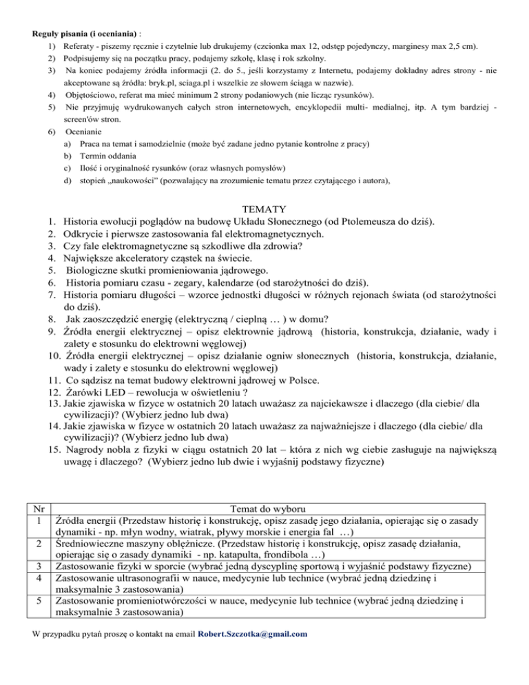 Reguły pisania (i oceniania) : 1) Referaty - piszemy ręcznie i czytelnie lub drukujemy (czcionka max 12, odstęp pojedynczy, marginesy max 2,5 cm). 2) Podpisujemy się na początku pracy, podajemy szkołę, klasę i rok szkolny. 3) Na koniec podajemy źródła informacji (2. do 5., jeśli korzystamy z Internetu, podajemy dokładny adres strony - nie akceptowane są źródła: bryk.pl, sciaga.pl i wszelkie ze słowem ściąga w nazwie). 4) Objętościowo, referat ma mieć minimum 2 strony podaniowych (nie licząc rysunków). 5) Nie przyjmuję wydrukowanych całych stron internetowych, encyklopedii multi- medialnej, itp. A tym bardziej screen'ów stron. 6) Ocenianie a) Praca na temat i samodzielnie (może być zadane jedno pytanie kontrolne z pracy) b) Termin oddania c) Ilość i oryginalność rysunków (oraz własnych pomysłów) d) stopień „naukowości” (pozwalający na zrozumienie tematu przez czytającego i autora), TEMATY 1. Historia ewolucji poglądów na budowę Układu Słonecznego (od Ptolemeusza do dziś). 2. Odkrycie i pierwsze zastosowania fal elektromagnetycznych. 3. Czy fale elektromagnetyczne są szkodliwe dla zdrowia? 4. Największe akceleratory cząstek na świecie. 5. Biologiczne skutki promieniowania jądrowego. 6. Historia pomiaru czasu - zegary, kalendarze (od starożytności do dziś). 7. Historia pomiaru długości – wzorce jednostki długości w różnych rejonach świata (od starożytności do dziś). 8. Jak zaoszczędzić energię (elektryczną / cieplną … ) w domu? 9. Źródła energii elektrycznej – opisz elektrownie jądrową (historia, konstrukcja, działanie, wady i zalety e stosunku do elektrowni węglowej) 10. Źródła energii elektrycznej – opisz działanie ogniw słonecznych (historia, konstrukcja, działanie, wady i zalety e stosunku do elektrowni węglowej) 11. Co sądzisz na temat budowy elektrowni jądrowej w Polsce. 12. Żarówki LED – rewolucja w oświetleniu ? 13. Jakie zjawiska w fizyce w ostatnich 20 latach uważasz za najciekawsze i dlaczego (dla ciebie/ dla cywilizacji)? (Wybierz jedno lub dwa) 14. Jakie zjawiska w fizyce w ostatnich 20 latach uważasz za najważniejsze i dlaczego (dla ciebie/ dla cywilizacji)? (Wybierz jedno lub dwa) 15. Nagrody nobla z fizyki w ciągu ostatnich 20 lat – która z nich wg ciebie zasługuje na największą uwagę i dlaczego? (Wybierz jedno lub dwie i wyjaśnij podstawy fizyczne) Nr 1 2 3 4 5 Temat do wyboru Źródła energii (Przedstaw historię i konstrukcję, opisz zasadę jego działania, opierając się o zasady dynamiki - np. młyn wodny, wiatrak, pływy morskie i energia fal …) Średniowieczne maszyny oblężnicze. (Przedstaw historię i konstrukcję, opisz zasadę działania, opierając się o zasady dynamiki - np. katapulta, frondibola …) Zastosowanie fizyki w sporcie (wybrać jedną dyscyplinę sportową i wyjaśnić podstawy fizyczne) Zastosowanie ultrasonografii w nauce, medycynie lub technice (wybrać jedną dziedzinę i maksymalnie 3 zastosowania) Zastosowanie promieniotwórczości w nauce, medycynie lub technice (wybrać jedną dziedzinę i maksymalnie 3 zastosowania) W przypadku pytań proszę o kontakt na email [email protected]