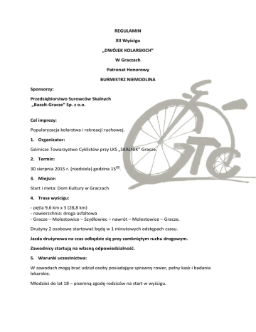 REGULAMIN XII Wyścigu „DWÓJEK KOLARSKICH” W Graczach Patronat Honorowy BURMISTRZ NIEMODLINA Sponsorzy: Przedsiębiorstwo Surowców Skalnych „Bazalt-Gracze” Sp. z o.o. Cel imprezy: Popularyzacja kolarstwa i rekreacji ruchowej. 1. Organizator: Górnicze Towarzystwo Cyklistów przy LKS „SKALNIK” Gracze. 2. Termin: 30 sierpnia 2015 r. (niedziela) godzina 1500. 3. Miejsce: Start i meta: Dom Kultury w Graczach 4. Trasa wyścigu: - pętla 9,6 km x 3 (28,8 km) - nawierzchnia: droga asfaltowa - Gracze – Molestowice – Szydłowiec – nawrót – Molestowice – Gracze. Drużyny 2 osobowe startować będą w 1 minutowych odstępach czasu. Jazda drużynowa na czas odbędzie się przy zamkniętym ruchu drogowym. Zawodnicy startują na własną odpowiedzialność. 5. Warunki uczestnictwa: W zawodach mogą brać udział osoby posiadające sprawny rower, pełny kask i badania lekarskie. Młodzież do lat 18 – pisemną zgodę rodziców na start w wyścigu. 6. Kategorie wiekowe: Kategorie wiekową stanowić będzie suma wieku zawodników: Mężczyźni: I – do 40 lat II – 41 - 80 lat III – 81 -120 lat IV – powyżej 120 lat V – rowery górskie, miksty VI- kobiety open 7. Nagrody: Organizator zapewnia puchary za najlepsze czasy w kategoriach wiekowych. 8. Wpisowe: 50 zł od drużyny. Organizator w ramach wpisowego zapewnia: posiłek, napoje okolicznościowe koszulki dla pierwszych 50 par 9. Zgłoszenia: Zapisy przyjmowane będą w dniu zawodów w Biurze Wyścigu – Dom Kultury w Graczach od godz. 1330 do 1430. 10. Postanowienia końcowe: Organizator zastrzega sobie prawo do zmian w niniejszym regulaminie. Organizatorzy nie ubezpieczają od NNW. Uczestnicy winni posiadać ubezpieczenie NNW, aktualne badanie lekarskie lub ważną kartę zdrowia. Wyścig będzie prowadzony przez sędziów PZKol. Sprawy sporne rozstrzyga Sędzia Główny wyścigu. Uczestnicy wyścigu zobowiązani są do posiadania dowodu tożsamości. Informacji w sprawie wyścigu udziela: Robert Dressler – 500 292 311 ZAPRASZAMY Organizatorzy