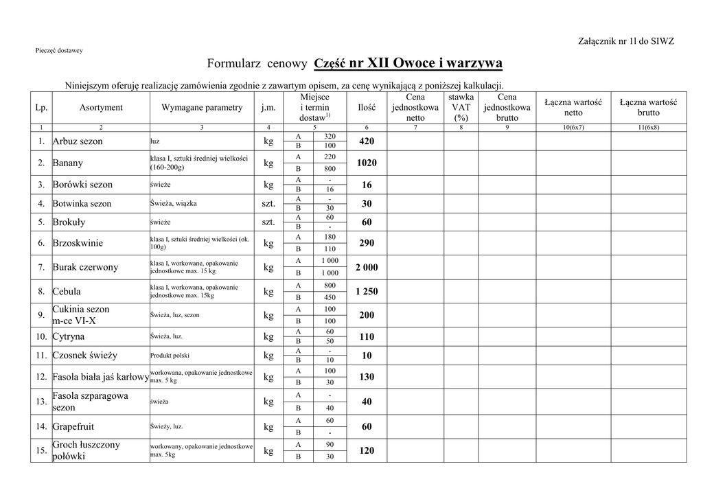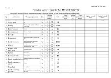 Załącznik nr 1l do SIWZ Pieczęć dostawcy Formularz cenowy Część nr XII Owoce i warzywa Lp. Niniejszym oferuję realizację zamówienia zgodnie z zawartym opisem, za cenę wynikającą z poniższej kalkulacji. Miejsce Cena stawka Cena Asortyment Wymagane parametry j.m. i termin Ilość jednostkowa VAT jednostkowa dostaw1) netto (%) brutto 1 2 3 4 1. Arbuz sezon luz kg 2. Banany klasa I, sztuki średniej wielkości (160-200g) kg 3. Borówki sezon świeże kg 4. Botwinka sezon Świeża, wiązka szt. 5. Brokuły świeże szt. 6. Brzoskwinie klasa I, sztuki średniej wielkości (ok. 100g) kg 7. Burak czerwony klasa I, workowane, opakowanie jednostkowe max. 15 kg kg 8. Cebula klasa I, workowana, opakowanie jednostkowe max. 15kg kg Świeża, luz, sezon kg 10. Cytryna Świeża, luz. kg 11. Czosnek świeży Produkt polski kg workowana, opakowanie jednostkowe kg 9. Cukinia sezon m-ce VI-X 12. Fasola biała jaś karłowy max. 5 kg 13. Fasola szparagowa sezon 14. Grapefruit 15. Groch łuszczony połówki świeża kg Świeży, luz. kg workowany, opakowanie jednostkowe max. 5kg kg 5 6 A B A 320 100 220 B A B A B A B A 800 16 30 60 180 B 110 A 1 000 B 1 000 A 800 B 450 A 100 B A B A B A 100 60 50 10 100 B 30 A - B 40 A 60 B - A 90 B 30 420 1020 16 30 60 290 2 000 1 250 200 110 10 130 40 60 120 7 8 9 Łączna wartość netto Łączna wartość brutto 10(6x7) 11(6x8) 16. Gruszka klasa I, sztuki średniej wielkości (160170g) kg Jabłka konsumpcyjne kl. 17. 1, dostawa m-ce I-III pakowane w skrzynie, opakowanie jednostkowe max. 15kg, odmiany miękkie, słodkie, waga sztuki 150200g kg Jabłka konsumpcyjne kl. 18. 1, dostawa m-ce IV-VIII 19. Jabłka konsumpcyjne kl.1, dostawa IX-XII pakowane w skrzynie, opakowanie jednostkowe max. 15kg, odmiany miękkie, słodkie, waga sztuki 150200g pakowane w skrzynie, opakowanie jednostkowe max. 15kg, odmiany miękkie, słodkie, waga sztuki 150200g max. 15kg kg Kalafior dostawa m-ce VI-XI kg Świeży, waga sztuki bez liści min. 1 300g – 1 700g szt. 22. Kapusta biała świeża kg 23. Kapusta czerwona świeża kg 24. Kapusta kwaszona opakowanie jednostkowe wiaderko 510 kg kg 25. Kapusta młoda Waga sztuki min.1,5 kg szt. 26. Kapusta pekińska szt. Waga sztuki min . 1 kg szt. 27. Kapusta włoska - kg 28. Kiwi Waga szt ok. 100g kg 29. Koperek zielony świeży, pęczek 100g szt. 30. Mandarynka klasa I, luz kg 31. Marchew klasa I, workowana, opakowanie jednostkowe max. 25 kg kg 32. Nektarynki klasa I, sztuki średniej wielkości, 100130g kg 21. 50 B 250 A 350 B 200 A 400 B 300 A 350 B 300 A 400 B 800 A 90 B 100 A 250 B 180 A 300 B 220 A 360 B 300 A 150 B 40 A B A 200 50 80 B 100 A 60 B 20 A B A 150 300 200 B 180 A 1 750 B 800 A 150 B 100 300 550 kg odmiany miękkie, słodkie, pakowane 20. Jabłka konsumpcyjne kl.2 w skrzynie, opakowanie jednostkowe A 700 650 1 200 190 430 520 660 190 250 180 80 450 380 2 550 250 33. Ogórek gruntowy dostawa VII-IX Klasa I ,świeży, luz, sezon kg 34. Ogórek kwaszony kg masa ogórków po odcieku 1 kg kg 35. Ogórek szklarniowy klasa I, opakowanie jednostkowe max. 5kg kg Papryka czerwona Klasa I, świeża sezon VIII-X Papryka czerwona poza Klasa I, świeża 37. sezonem 36. kg kg 38. Papryka sopelek Klasa I, świeża kg 39. Pieczarka klasa I, świeża kg 40. Pietruszka korzeń klasa I, workowana, opakowanie jednostkowe max. 15kg kg 41. Pietruszka nać pęczek 100g szt. 42. Podgrzybek suszony opakowanie jednostkowe 20g szt. 43. Pomarańcza waga jednostkowa ok. 200g kg 44. Pomidor I-V Klasa I, świeże kg 45. Pomidor VI-IX Klasa I, świeże kg 46. Pomidor X-XII Klasa I, świeże kg 47. Por Klasa I, świeży kg. 48. Rabarbar sezon Klasa I, świeży kg 49. Rzodkiewka 100g Klasa I, świeża szt. A 200 B 90 A 150 B 100 A 180 B 150 A 40 B 80 A 30 B - A B A 20 24 140 B 60 A 480 B 350 A 150 B 170 A 20 B - A 250 B 250 A 180 B 80 A 250 B 200 A 150 B 70 A 40 B 80 A 30 B 100 A 220 B 10 290 250 330 120 30 44 200 830 320 20 500 260 450 220 120 130 230 50. Sałata lodowa Klasa I, świeża szt. 51. Sałata zielona Klasa I, świeża szt. 52. Seler korzeń Klasa I, workowany, opakowanie jednostkowe max. 15 kg kg Susz kompotowy tacka 250g Szczypiorek pęczek 54. 100g min. 3 składnikowy (wigilijny): jabłko, śliwka, gruszka szt. Świeży szt. 55. Śliwki węgierki sezon klasa I, świeże kg 56. Truskawki sezon Klasa I, świeże kg 57. Winogrona białe Klasa I, świeże kg 58. Ziemniaki młode Klasa I, dostawa maj-czerwiec, workowane, opakowanie jednostkowe max. 25kg kg 53. 59. Ziemniaki jadalne, dostawa m-ce: I-III Klasa I, workowane, opakowanie jednostkowe max. 25kg kg 60. Ziemniaki jadalne, dostawa m-ce: IV-V Klasa I, workowane, opakowanie jednostkowe max. 25kg kg 61. Ziemniaki jadalne dostawa m-ce: VI-VIII Klasa I, workowane, opakowanie jednostkowe max. 25kg kg 62. Ziemniaki jadalne, dostawa m-ce IX-XII Klasa I, workowane, opakowanie jednostkowe max. 25kg kg naturalnie kiszony zakwas do sporządzania zup, otrzymany z mąki żytniej z otrębami i czosnku metodą fermentacji mlekowej, produkt niepasteryzowany szt. Żur tradycyjny w 63. butelce op. 500 ml A 170 B - A 300 B 70 A 480 B 380 A 16 B - A 200 B 30 A 80 B 100 A 120 B 150 A - B 80 A - B 135 A 2 800 B 3 000 A 2 200 B 2 000 A 3 300 B 3 000 A 4 400 B 4 000 A 100 B 70 170 370 860 16 230 180 270 80 135 5 800 4 200 6 300 8 400 170 Łączna kwota oferty 1) Legenda: A – Dom Pomocy Społecznej im. św. O. R. Kalinowskiego w Wadowicach ul. gen. K. Pułaskiego 5, dostawa następnego dnia od dnia zgłoszenia zamówienia w godzinach 6:30-9:00, B – Dom Pomocy Społecznej w Wadowicach, ul. Parkowa 1, dostawa następnego dnia od dnia zgłoszenia zamówienia w godzinach 6:30-9:00, /podpis dostawcy/