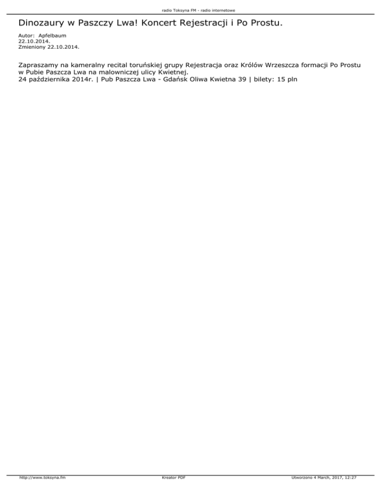 radio Toksyna FM - radio internetowe Dinozaury w Paszczy Lwa! Koncert Rejestracji i Po Prostu. Autor: Apfelbaum 22.10.2014. Zmieniony 22.10.2014. Zapraszamy na kameralny recital toruńskiej grupy Rejestracja oraz Królów Wrzeszcza formacji Po Prostu w Pubie Paszcza Lwa na malowniczej ulicy Kwietnej. 24 października 2014r. | Pub Paszcza Lwa - Gdańsk Oliwa Kwietna 39 | bilety: 15 pln http://www.toksyna.fm Kreator PDF Utworzono 4 March, 2017, 12:27