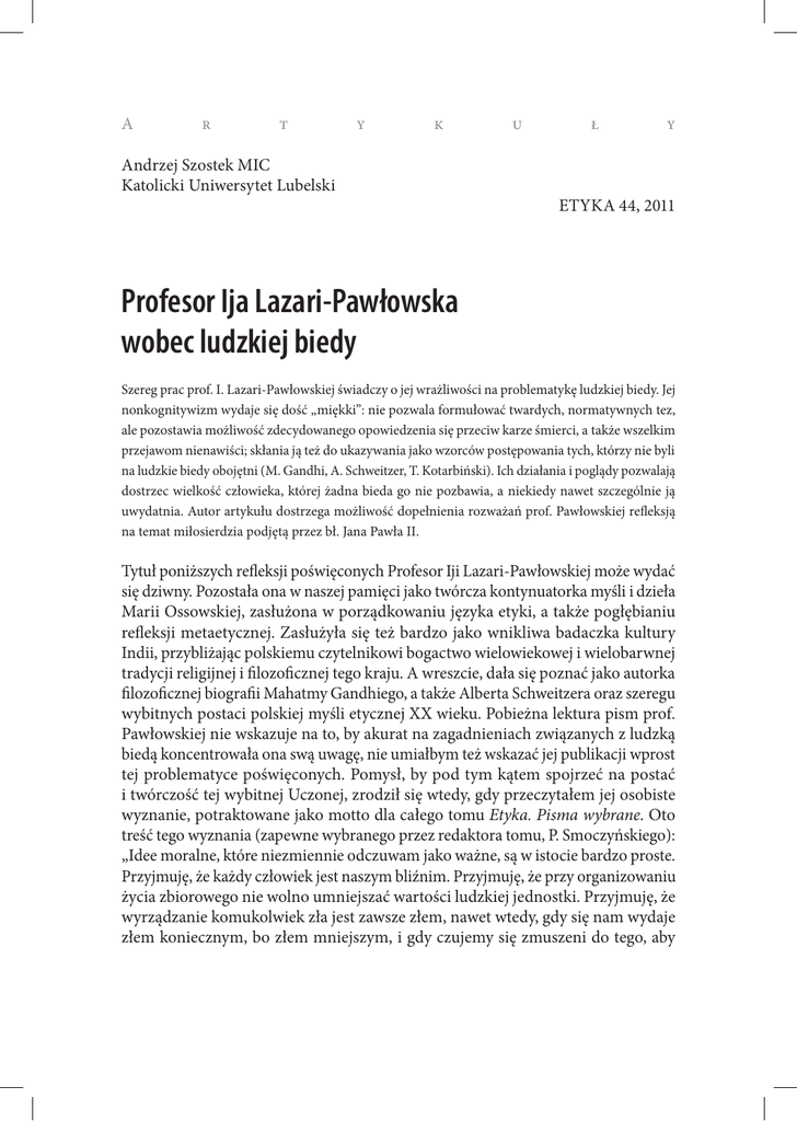 A r t y k Andrzej Szostek MIC Katolicki Uniwersytet Lubelski u ł y ETYKA 44, 2011 Profesor Ija Lazari‑Pawłowska wobec ludzkiej biedy Szereg prac prof. I. Lazari‑Pawłowskiej świadczy o jej wrażliwości na problematykę ludzkiej biedy. Jej nonkognitywizm wydaje się dość „miękki”: nie pozwala formułować twardych, normatywnych tez, ale pozostawia możliwość zdecydowanego opowiedzenia się przeciw karze śmierci, a także wszelkim przejawom nienawiści; skłania ją też do ukazywania jako wzorców postępowania tych, którzy nie byli na ludzkie biedy obojętni (M. Gandhi, A. Schweitzer, T. Kotarbiński). Ich działania i poglądy pozwalają dostrzec wielkość człowieka, której żadna bieda go nie pozbawia, a niekiedy nawet szczególnie ją uwydatnia. Autor artykułu dostrzega możliwość dopełnienia rozważań prof. Pawłowskiej refleksją na temat miłosierdzia podjętą przez bł. Jana Pawła II. Tytuł poniższych refleksji poświęconych Profesor Iji Lazari‑Pawłowskiej może wydać się dziwny. Pozostała ona w naszej pamięci jako twórcza kontynuatorka myśli i dzieła Marii Ossowskiej, zasłużona w porządkowaniu języka etyki, a także pogłębianiu refleksji metaetycznej. Zasłużyła się też bardzo jako wnikliwa badaczka kultury Indii, przybliżając polskiemu czytelnikowi bogactwo wielowiekowej i wielobarwnej tradycji religijnej i filozoficznej tego kraju. A wreszcie, dała się poznać jako autorka filozoficznej biografii Mahatmy Gandhiego, a także Alberta Schweitzera oraz szeregu wybitnych postaci polskiej myśli etycznej XX wieku. Pobieżna lektura pism prof. Pawłowskiej nie wskazuje na to, by akurat na zagadnieniach związanych z ludzką biedą koncentrowała ona swą uwagę, nie umiałbym też wskazać jej publikacji wprost tej problematyce poświęconych. Pomysł, by pod tym kątem spojrzeć na postać i twórczość tej wybitnej Uczonej, zrodził się wtedy, gdy przeczytałem jej osobiste wyznanie, potraktowane jako motto dla całego tomu Etyka. Pisma wybrane. Oto treść tego wyznania (zapewne wybranego przez redaktora tomu, P. Smoczyńskiego): „Idee moralne, które niezmiennie odczuwam jako ważne, są w istocie bardzo proste. Przyjmuję, że każdy człowiek jest naszym bliźnim. Przyjmuję, że przy organizowaniu życia zbiorowego nie wolno umniejszać wartości ludzkiej jednostki. Przyjmuję, że wyrządzanie komukolwiek zła jest zawsze złem, nawet wtedy, gdy się nam wydaje złem koniecznym, bo złem mniejszym, i gdy czujemy się zmuszeni do tego, aby 10 Andrzej szostek zło wyrządzić. Zakładam, że takie nastawienie prowadzi do większej ostrożności w wyrządzaniu komukolwiek zła”1. 1. „Miękki nonkognitywizm” i jego konsekwencje Wyznanie to prowokuje do dwóch co najmniej komentarzy. Po pierwsze, bodaj wyraźniej niż w typowo naukowych (a przez to nie tak osobistych) tekstach odsłania się w nim prof. Pawłowska jako rasowy, dobry etyk. Uważam bowiem – i niech mi będzie wolno poprzestać tu tylko na tej deklaracji, bez jej rozwinięcia i szczegó‑ łowego uzasadnienia – że dwa są podstawowe warunki, by być dobrym etykiem, a mianowicie: wrażliwość moralna (a zwłaszcza wrażliwość na człowieka i jego los, na jego wartości i nędze) oraz logika, czyli chęć, a nade wszystko umiejętność, rozpatrywania poglądów etycznych pod kątem ich jasności, spójności i zasadności (stojących za nimi argumentów). Cytowana wypowiedź prof. Pawłowskiej świadczy wprost przede wszystkim o jej wrażliwości. Poniżej spróbuję pokazać, w jaki sposób dawała jej wyraz w refleksji etycznej i metaetycznej. O tym, że refleksja ta zawsze utrzymana była na wysokim poziomie z logicznego i metodologicznego punktu widzenia, nie muszę chyba nikogo przekonywać. Po drugie, ponieważ Profesor żywiła bliskie nonkognitywizmowi przekonanie, że sporów o wartości nie da się rozstrzygnąć na płaszczyźnie empirycznej, pozostała jej do dyspozycji droga – by tak rzec – „światłej perswazji”, której celem było zbli‑ żenie odbiorcy jej tekstów do uznawanej przez nią hierarchii wartości i zachęcenie go do jej akceptacji. Mówię ostrożnie o stanowisku prof. Pawłowskiej, ponieważ tak ostrożnie – jak sądzę – ona sama swe poglądy formułowała. Znamienny jest tok rozumowania prof. Pawłowskiej zaprezentowany w artykule Rodzaje sporów etycznych2. Po dokonaniu szeregu pożytecznych rozróżnień terminologicznych, Autorka poświęca sporo uwagi sporom o wartości, a zatrzymując się szczególnie przy dyskusji wokół dopuszczalności kary śmierci, stwierdza: „pytanie o to, czy wolno (w sensie moralnym) zabić jednostkę dla celów ogólno prewencyjnych, należy moim zdaniem do pytań, na które nie możemy spodziewać się odpowiedzi prowadząc badania empiryczne; odpowiedź twierdząca lub przecząca jest konse‑ kwencją aksjologicznych założeń. Badania mogą jedynie dostarczyć wiedzy o tym, w których społeczeństwach występuje tendencja do poświęcania jednostki dla interesu zbiorowego, a także jakie skutki pociąga za sobą tego rodzaju praktyka”3. Ale do głównego wywodu dołączone są dwa aneksy: Głos przeciwko karze śmierci oraz Głos przeciwko nienawiści4. W pierwszym z nich prof. Pawłowska opowiada się zdecydowanie przeciwko karze śmierci, podkreślając, że jest to dla niej – podobnie 1 I. Lazari‑Pawłowska, Etyka. Pisma wybrane, red. P. J. Smoczyński, Wrocław, Ossolineum 1992, s. 4. Pozycja ta zawiera wszystkie publikacje prof. I. Lazari‑Pawłowskiej, o których wcześniej wspo‑ mniałem, do niej też będę się poniżej niemal wyłącznie odwoływał. 2 I. Lazari‑Pawłowska, Rodzaje sporów etycznych, [w:] tejże, Etyka. Pisma wybrane, s. 121‒144. 3 Tamże, s. 127. 4 Tamże, s. 133‒136. Profesor Ija Lazari-Pawłowska wobec ludzkiej biedy 11 jak dla jej akademickich nauczycieli: Marii Ossowskiej i Tadeusza Kotarbińskiego – sprawa waż