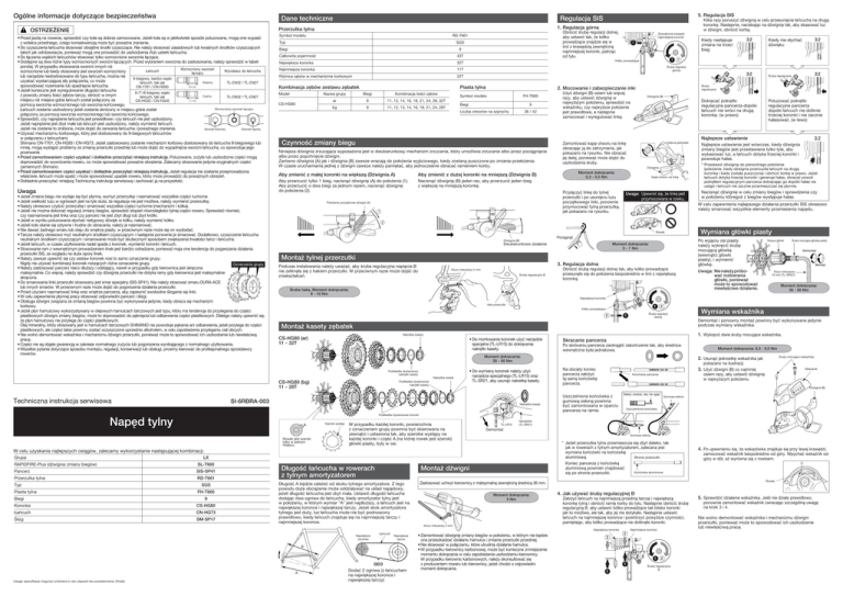 Ogólne informacje dotyczące bezpieczeństwa Dane techniczne • Przed jazdą na rowerze, sprawdzić czy koła są dobrze zamocowane. Jeżeli koła są w jakikolwiek sposób poluzowane, mogą one wypaść z widelca przedniego, czego konsekwencją może być poważne zranienie. • Do czyszczenia łańcucha stosować obojętne środki czyszczące. Nie należy stosować zasadowych lub kwaśnych środków czyszczących takich jak odrdzewiacze, ponieważ mogą one prowadzić do uszkodzenia i/lub usterki łańcucha. • Do łączenia wąskich łańcuchów stosować tylko wzmocnione sworznie łączące. • Dostępne są dwa różne typy wzmocnionych sworzni łączących. Przed wybraniem sworznia do zastosowania, należy sprawdzić w tabeli poniżej. W przypadku stosowania sworzni innych niż Wzmocniony sworzeń Łańcuch Wyciskacz do łańcucha wzmocnione lub kiedy stosowany jest sworzeń wzmocniony łączący lub narzędzie niedostosowane do typu łańcucha, można nie 9-biegowy, bardzo wąski uzyskać wystarczającej siły połączenia, co może Srebrny łańcuch, taki jak TL-CN32 / TL-CN27 spowodować rozerwanie lub spadnięcie łańcucha. 6,5 mm CN-7701 / CN-HG93 • Jeżeli konieczne jest wyregulowanie długości łańcucha 8-/7-/6-biegowy wąski z powodu zmiany ilości zębów tarczy, skrócić w innym Czarny łańcuch, taki jak TL-CN32 / TL-CN27 miejscu niż miejsce gdzie łańcuch został połączony za 7,1 mm CN-HG50 / CN-HG40 pomocą sworznia wzmocnionego lub sworznia końcowego. Wzmocniony sworzeń łączący Łańcuch zostanie uszkodzony jeżeli zostanie skrócony w miejscu gdzie został połączony za pomocą sworznia wzmocnionego lub sworznia końcowego. • Sprawdzić, czy naprężenie łańcucha jest prawidłowe i czy łańcuch nie jest uszkodzony. Jeżeli naprężenie jest zbyt małe lub łańcuch jest uszkodzony, należy wymienić łańcuch. Jeżeli nie zostanie to zrobione, może dojść do zerwania łańcucha i poważnego zranienia. Sworzeń końcowy Sworzeń ogniwa • Używać mechanizmu korbowego, który jest dostosowany do 9-biegowych łańcuchów w połączeniu z łańcuchami. Shimano CN-7701, CN-HG93 i CN-HG73. Jeżeli zastosowany zostanie mechanizm korbowy dostosowany do łańcucha 8-biegowego lub mniej, mogą wystąpić problemy ze zmianą przerzutki przedniej lub może dojść do wypadnięcia sworzni łańcucha, co spowoduje jego przerwanie. • Przed zamontowaniem części uzyskać i dokładnie przeczytać niniejszą instrukcję. Poluzowane, zużyte lub uszkodzone części mogą doprowadzić do wywrócenia roweru, co może spowodować poważne obrażenia. Zalecamy stosowanie jedynie oryginalnych części zamiennych Shimano. • Przed zamontowaniem części uzyskać i dokładnie przeczytać niniejszą instrukcję. Jeżeli regulacja nie zostanie przeprowadzona właściwie, łańcuch może spaść i może spowodować upadek roweru, który może prowadzić do poważnych obrażeń. • Dokładnie przeczytać niniejszą Techniczną instrukcję serwisową i zachować ją na przyszłość. Uwaga • Jeżeli zmiana biegu nie wydaje się być płynna, wymyć przerzutkę i nasmarować wszystkie części ruchome. • Jeżeli wielkość luzu w ogniwach jest na tyle duża, że regulacja nie jest możliwa, należy wymienić przerzutkę. • Należy okresowo czyścić przerzutkę i smarować wszystkie części ruchome (mechanizm i kółka). • Jeżeli nie można dokonać regulacji zmiany biegów, sprawdzić stopień równoległości tylnej części roweru. Sprawdzić również, czy nasmarowana jest linka oraz czy pancerz nie jest zbyt długi lub zbyt krótki. • Jeżeli w wyniku poluzowania słychać nietypowy dźwięk w kółku, należy wymienić kółko. • Jeżeli koło stanie się sztywne i trudne do obracania, należy je nasmarować. • Nie dawać żadnego smaru lub oleju do wnętrza piasty, w przeciwnym razie może się on wydostać. • Tarcze należy okresowo myć neutralnym środkiem czyszczącym i następnie ponownie je smarować. Dodatkowo, czyszczenie łańcucha neutralnym środkiem czyszczącym i smarowanie może być skutecznym sposobem zwiększenia trwałości tarcz i łańcucha. • Jeżeli łańcuch, w czasie użytkowania nadal spada z koronek, wymienić koronki i łańcuch. • Stosowanie ram z wewnętrznym prowadzeniem linek jest bardzo odradzane, ponieważ maja one tendencję do pogarszania działania przerzutki SIS, ze względu na duże opory linek. • Należy zawsze upewnić się czy zestaw koronek nosi to samo oznaczenie grupy. Nigdy nie używać kombinacji koronek noszących różne oznaczenie grupy. Oznaczenia grupy • Należy zastosować pancerz nieco dłuższy i odstający, nawet w przypadku gdy kierownica jest skręcona maksymalnie. Co więcej, należy sprawdzić czy dźwignia przerzutki nie dotyka ramy gdy kierownica jest maksymalnie skręcona. • Do smarowania linki przerzutki stosowany jest smar specjalny (SIS-SP41). Nie należy stosować smaru DURA-ACE lub innych smarów. W przeciwnym razie może dojść do pogorszenia działania przerzutki. • Przed użyciem nasmarować linkę oraz wnętrze pancerza, aby zapewnić swobodne ślizganie się linki. • W celu zapewnienia płynnej pracy stosować odpowiedni pancerz i ślizgi. • Obsługa dźwigni związana ze zmianą biegów powinna być wykonywana jedynie, kiedy obraca się mechanizm korbowy. • Jeżeli płyn hamulcowy wykorzystywany w olejowych hamulcach tarczowych jest typu, który ma tendencję do przylegania do części plastikowych dźwigni zmiany biegów, może to doprowadzić do pęknięcia lub odbarwienia części plastikowych. Dlatego należy upewnić się, że płyn hamulcowy nie przylega do części plastikowych. Olej mineralny, który stosowany jest w hamulcach tarczowych SHIMANO nie powoduje pękania ani odbarwienia, jeżeli przylega do części plastikowych, ale części takie powinny zostać oczyszczone uprzednio alkoholem, w celu zapobieżenia przyleganiu ciał obcych. •